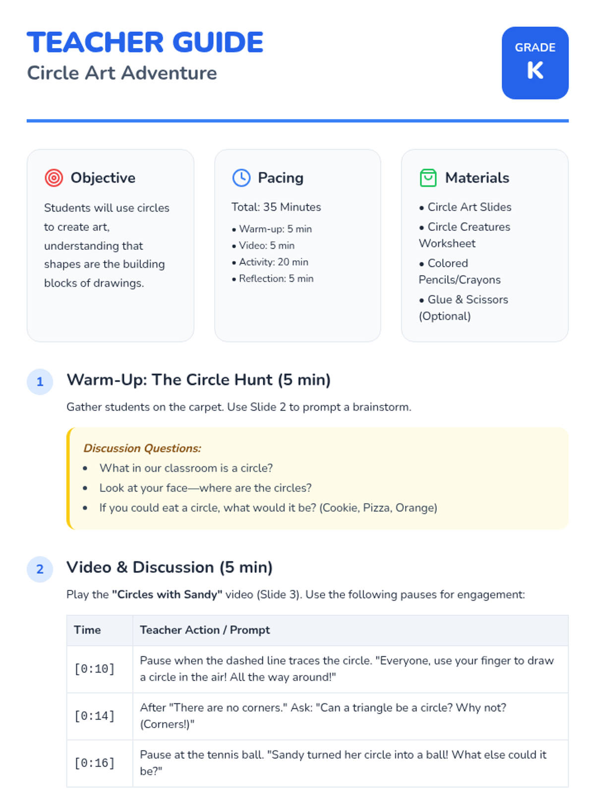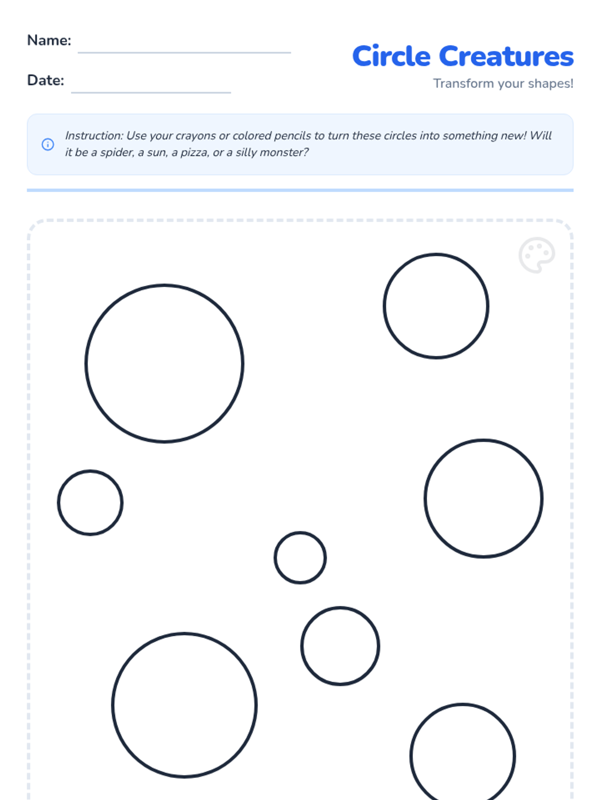 A Kindergarten lesson exploring circles as the building blocks of art, featuring a video-led discussion and a creative 'Circle Creatures' drawing activity.