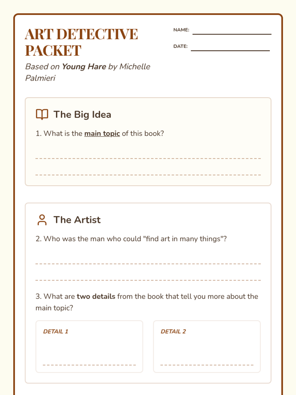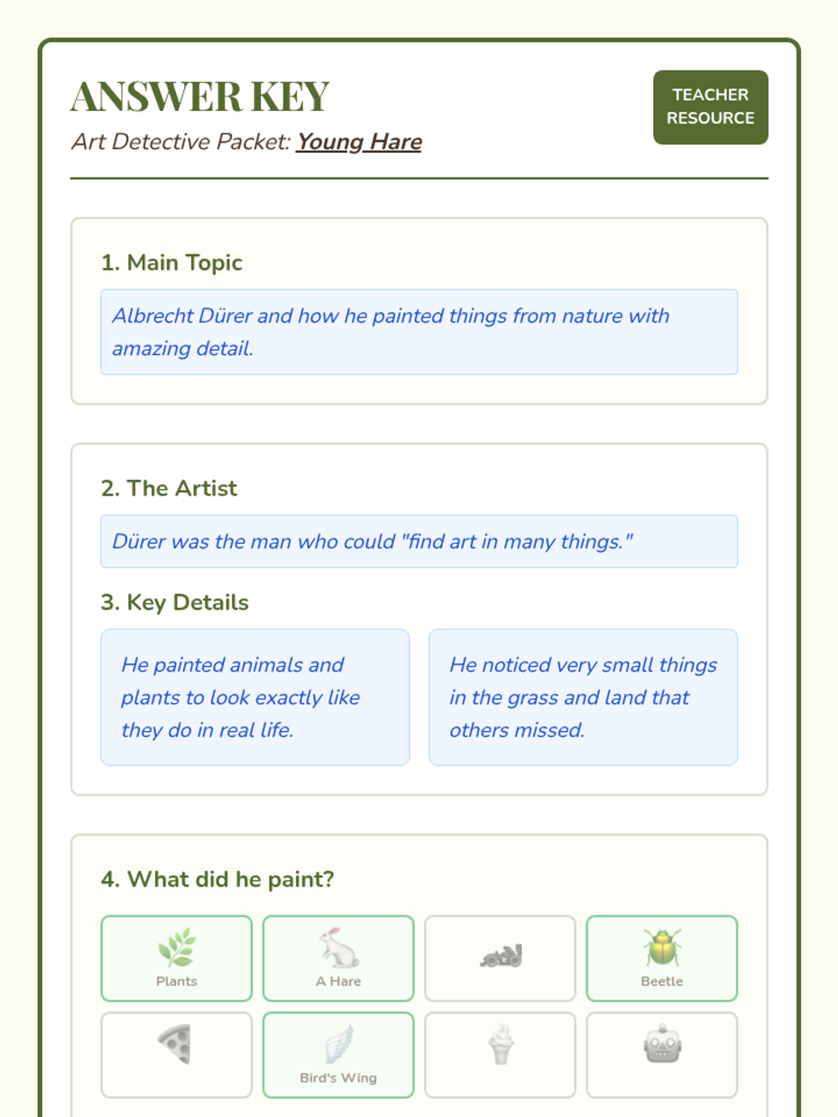 A comprehensive reading and art appreciation packet based on Michelle Palmieri's book about the artist Albrecht Dürer, designed for advanced first graders.