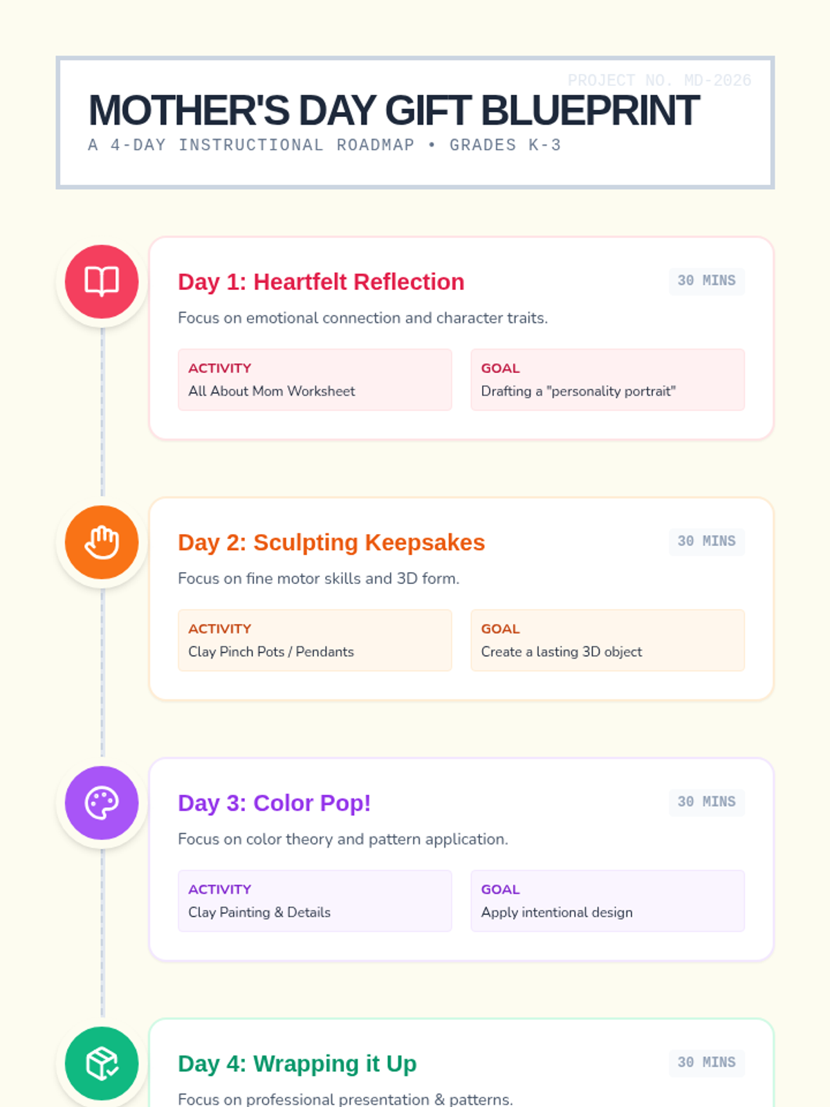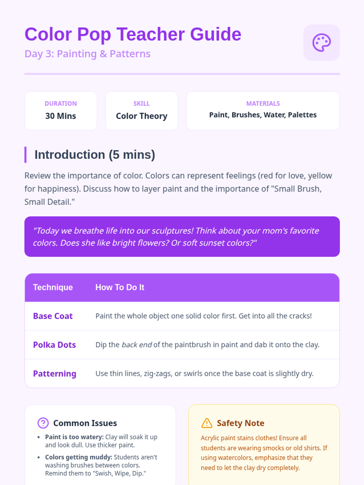 A system for art students to track their progress toward earning Maker's Space time by practicing active listening and following directions. This lesson includes a visual tracking chart, daily warm-up slides, and clear behavioral expectations.