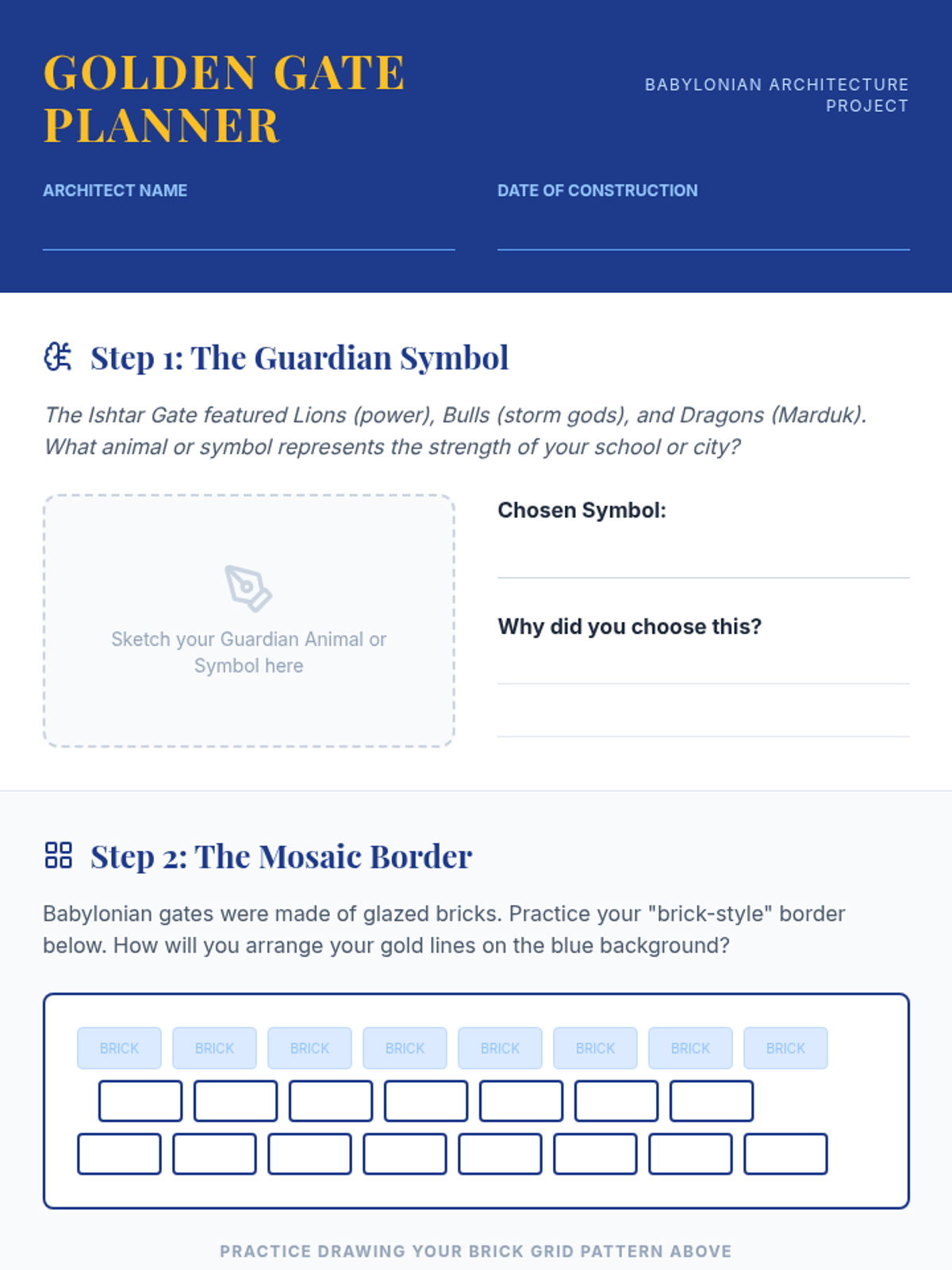 A visual-focused exploration of Babylonian architecture, specifically the Ishtar Gate, where students design their own symbolic 'city gates' using blue and gold motifs.
