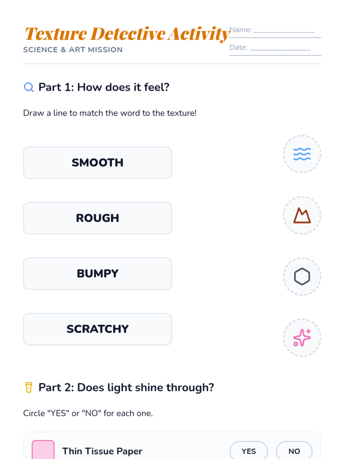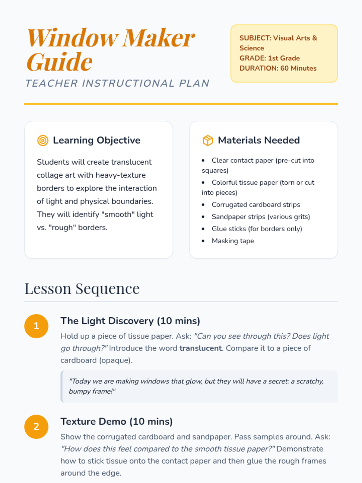 A hands-on art and science lesson where 1st graders explore translucency and texture by creating tissue paper 'stained glass' windows with rough, tactile borders. Students investigate how light interacts with different materials and distinguish between smooth and textured surfaces.