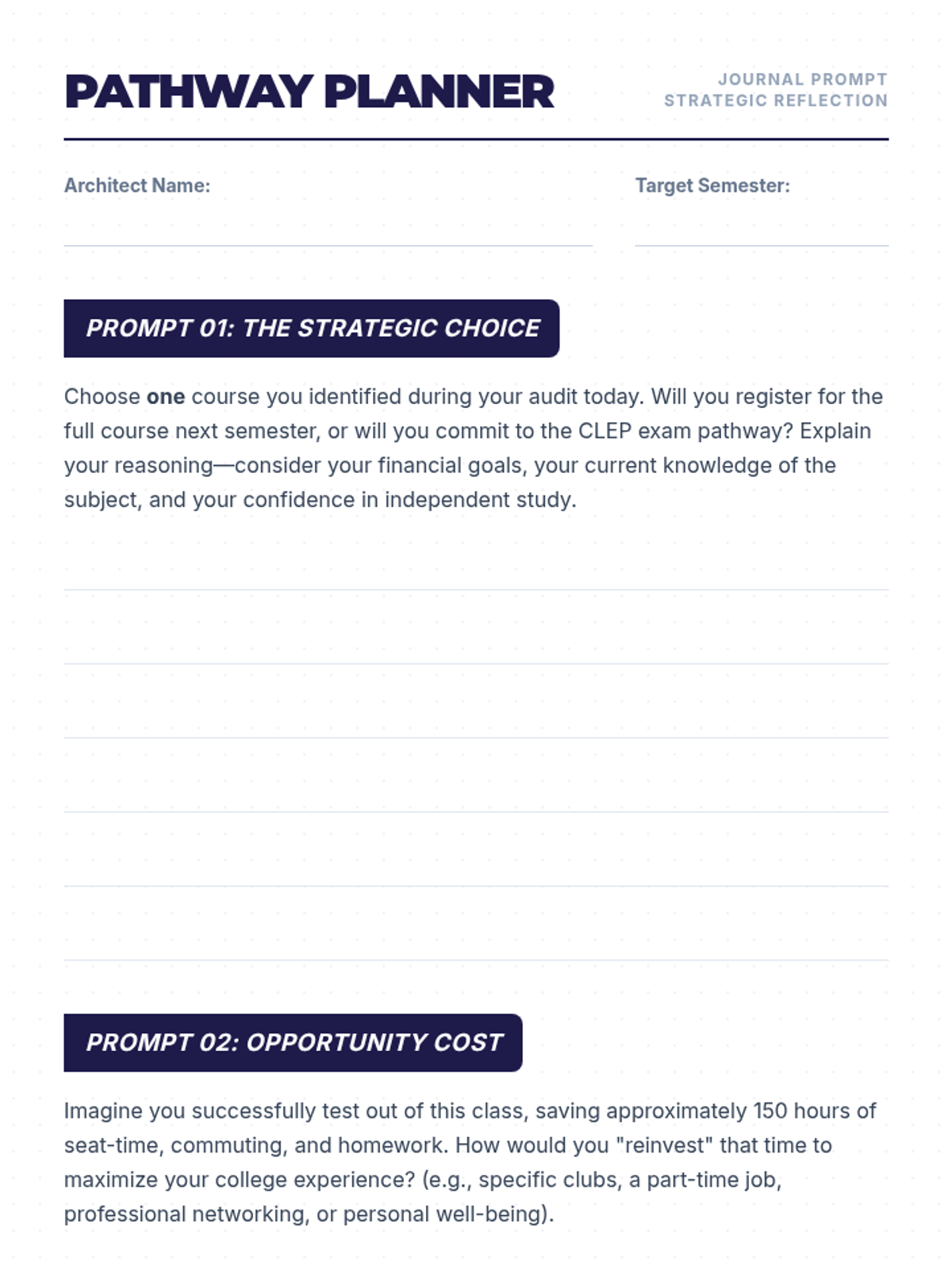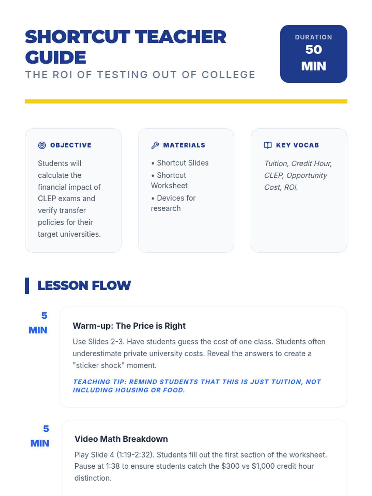 A college-prep lesson for 11th-12th graders focused on the financial impact of the College-Level Examination Program (CLEP). Students research university credit transfer policies and calculate potential savings to understand the return on investment (ROI) of alternative credit pathways.