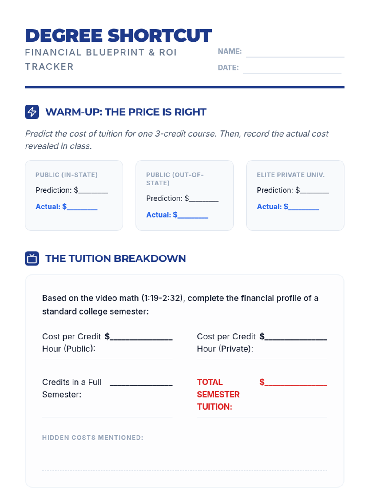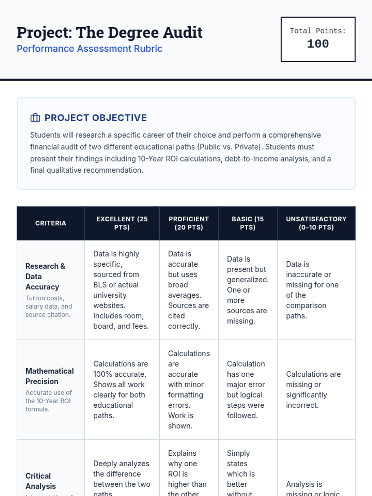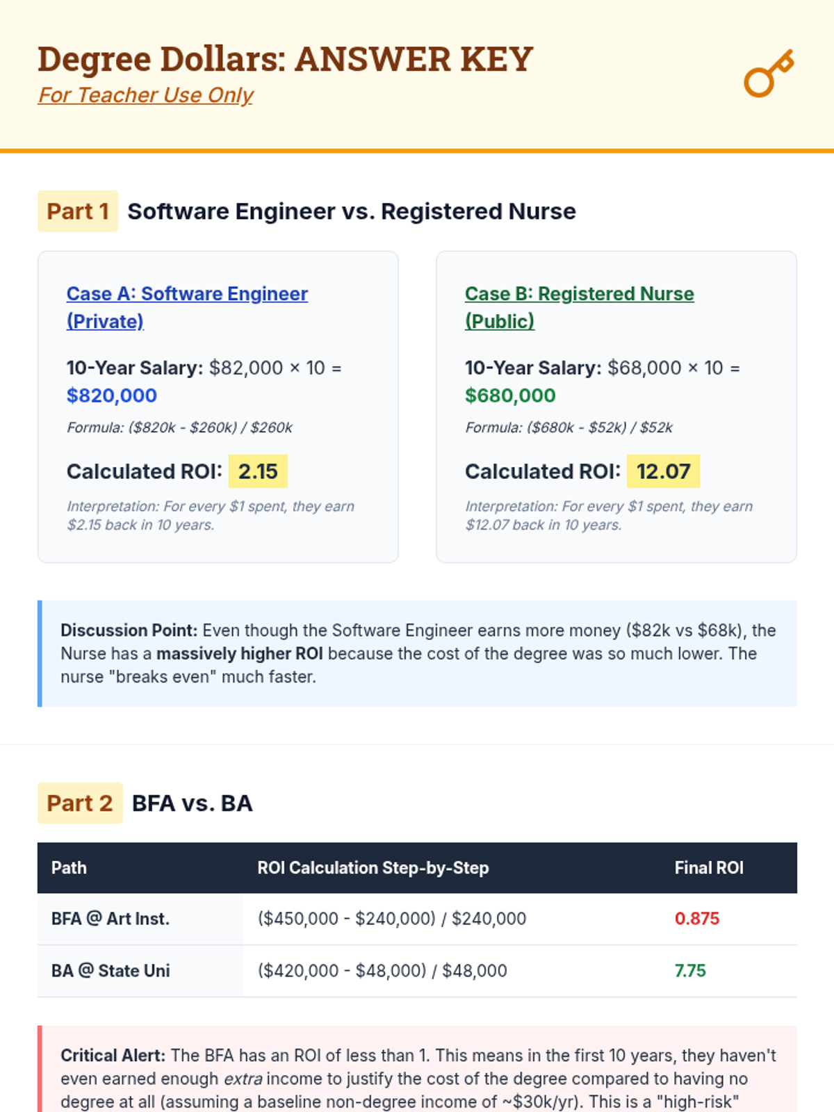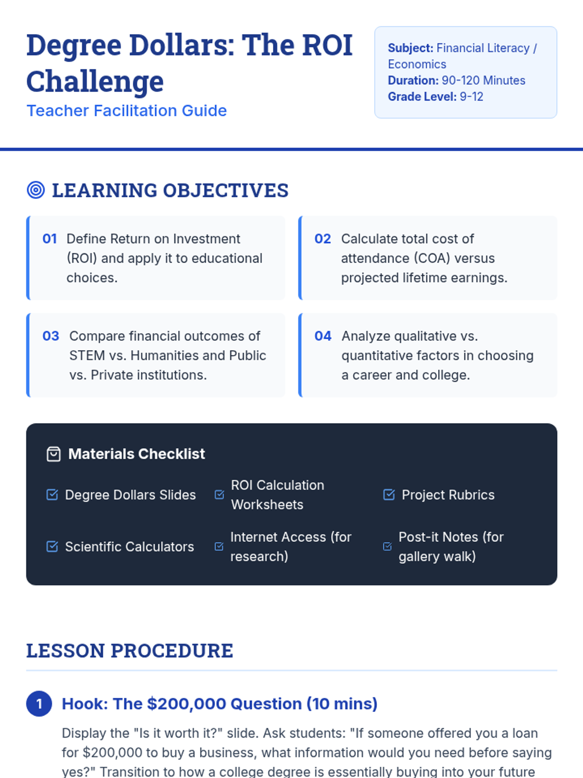 A comprehensive lesson where students calculate and analyze the Return on Investment (ROI) for various college degrees and career paths, comparing tuition costs and starting salaries.