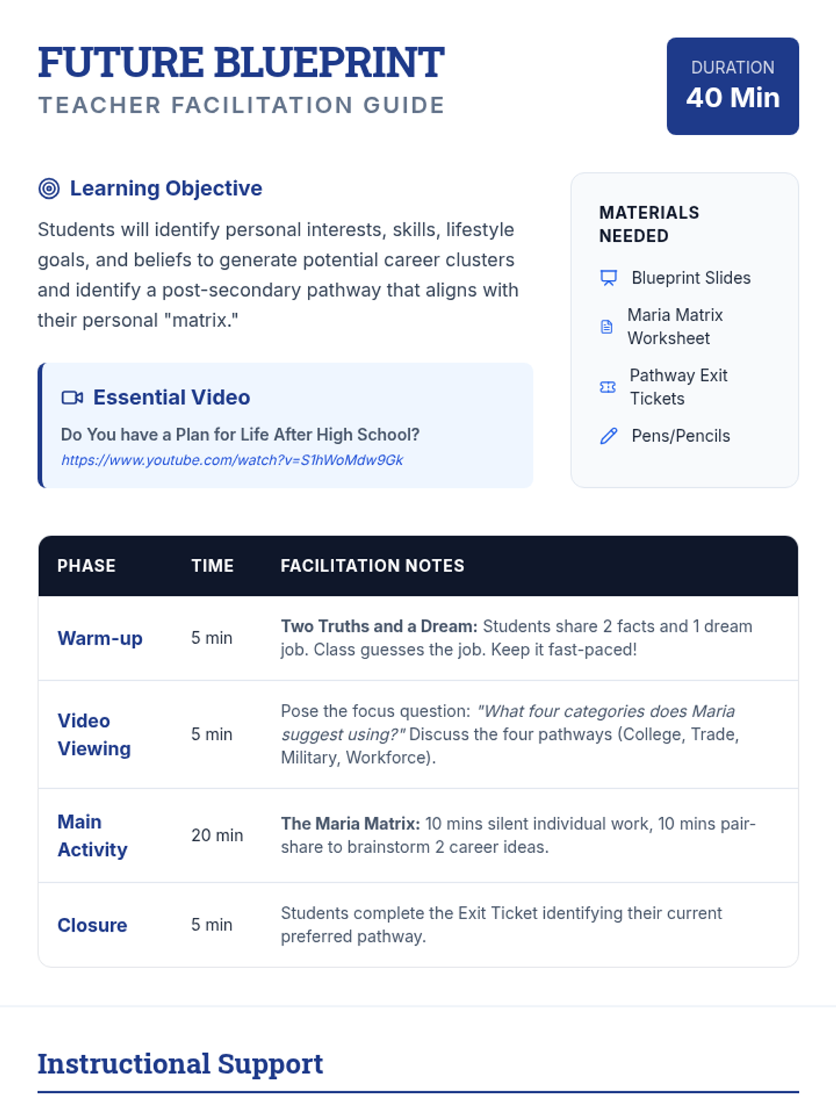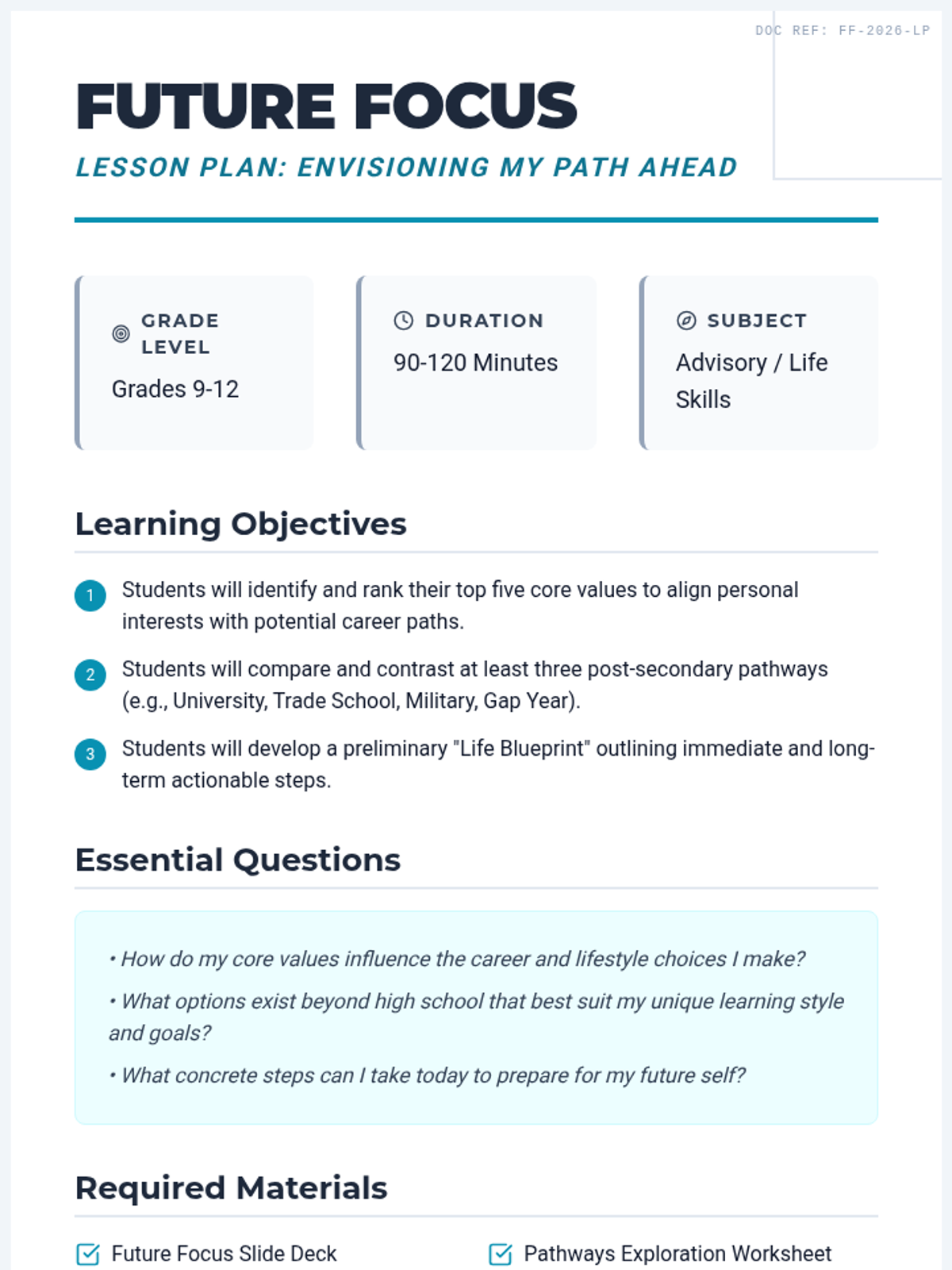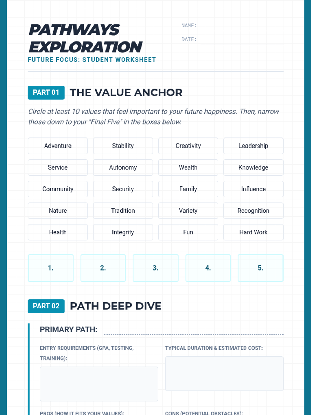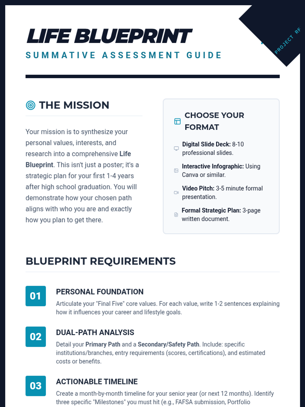 A comprehensive career and life planning lesson for high school students to explore post-secondary options, align their values with career paths, and create an actionable life blueprint.