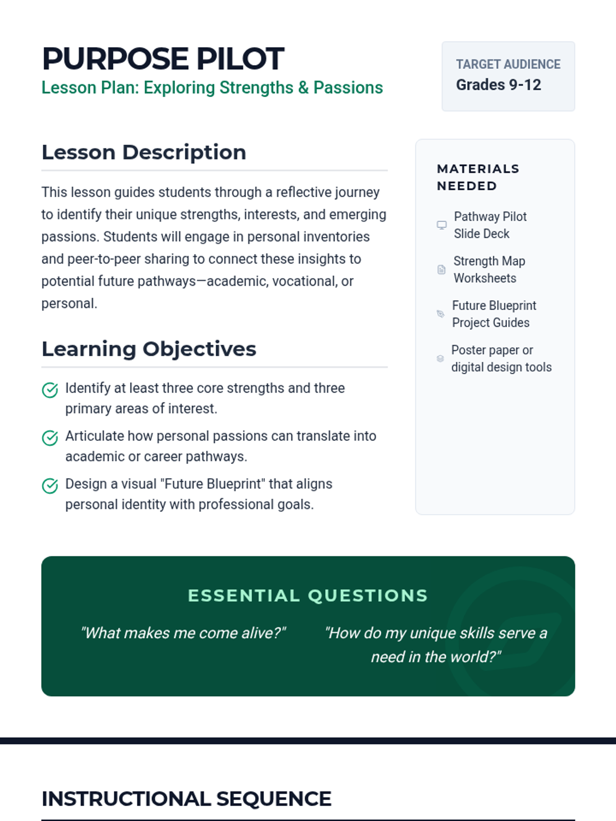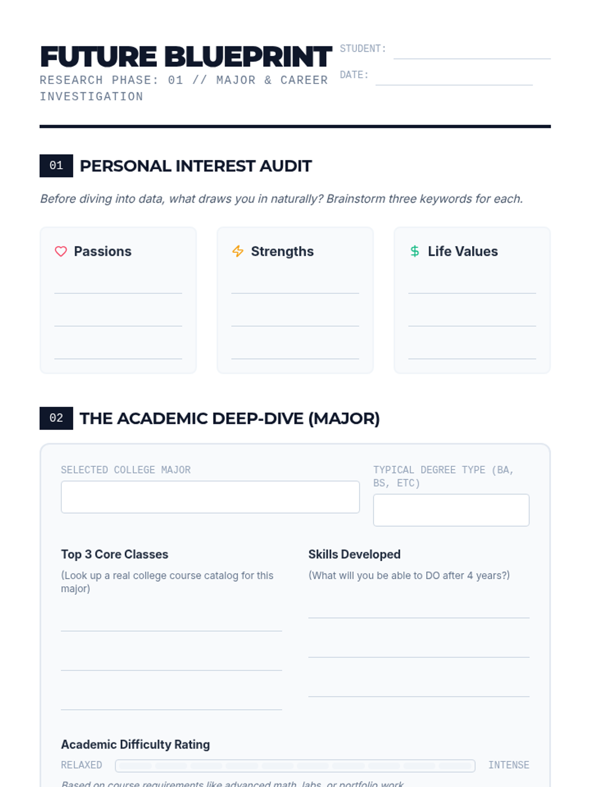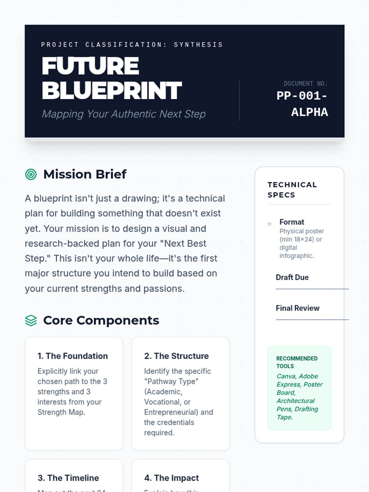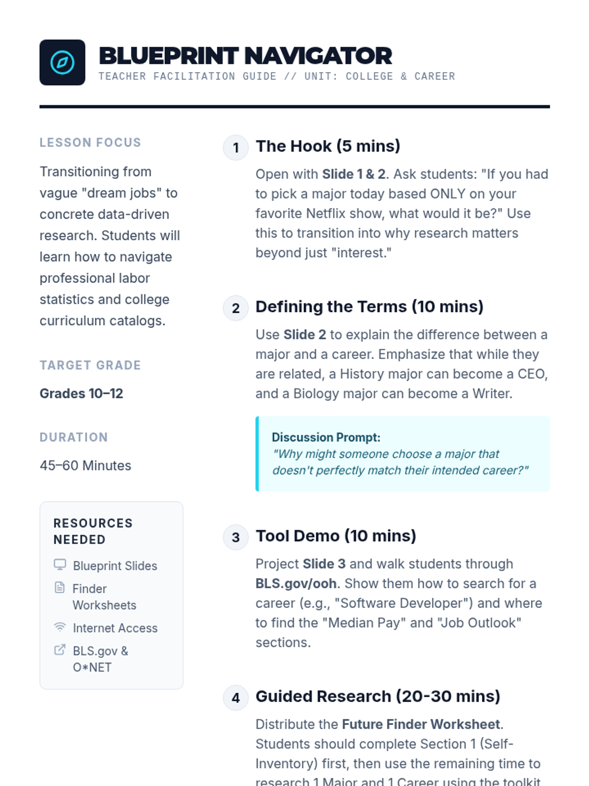 A comprehensive career and life planning lesson for high school students to explore post-secondary options, align their values with career paths, and create an actionable life blueprint.
