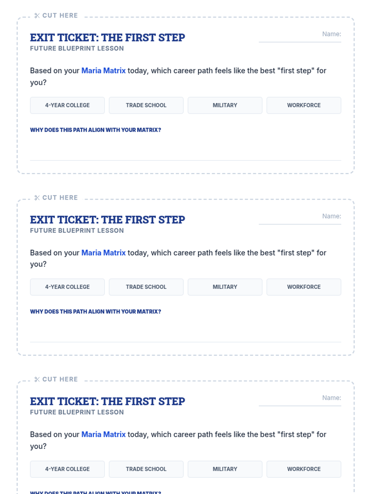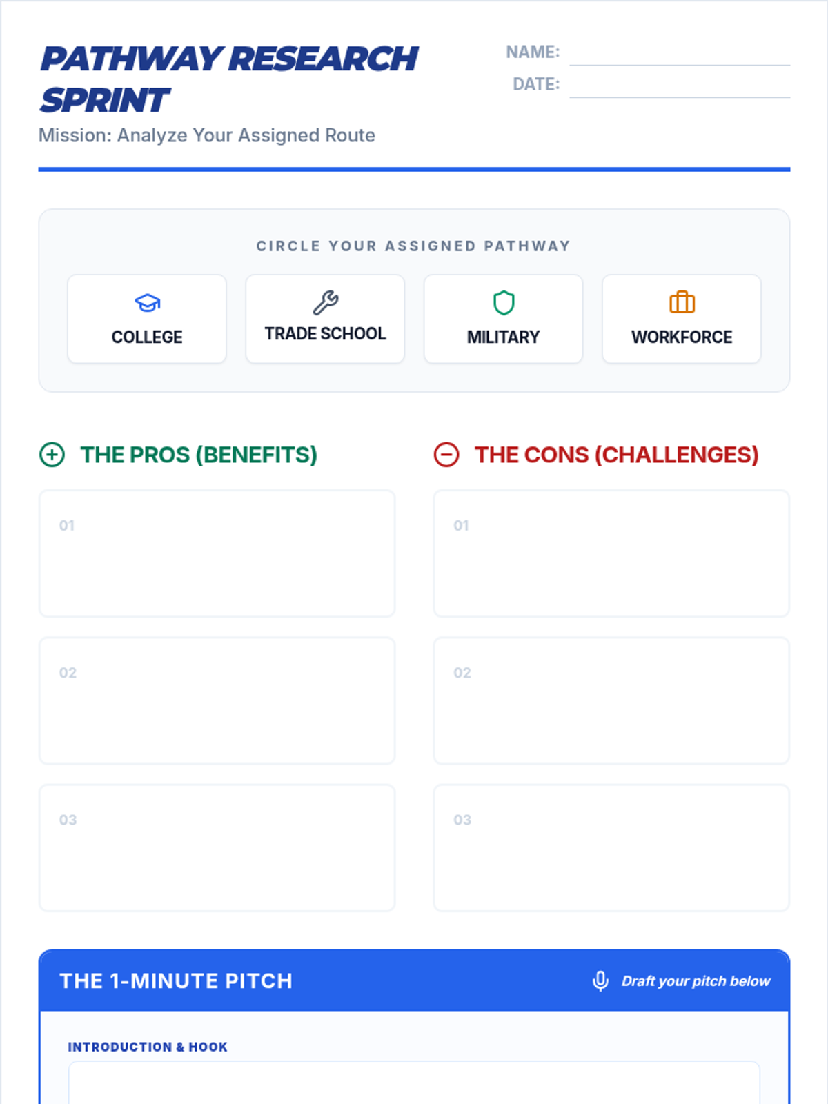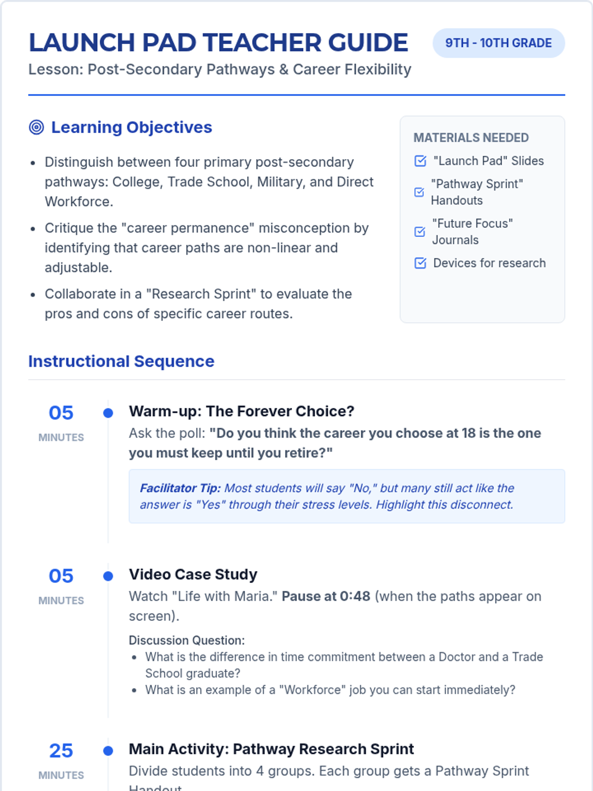 This lesson helps 9th and 10th-grade students explore four primary post-secondary pathways (College, Trade School, Military, and Direct Workforce) while debunking the myth that career choices at age 18 are permanent. Students engage with a video case study, perform a collaborative 'Research Sprint', and reflect on how flexibility in career planning reduces stress.