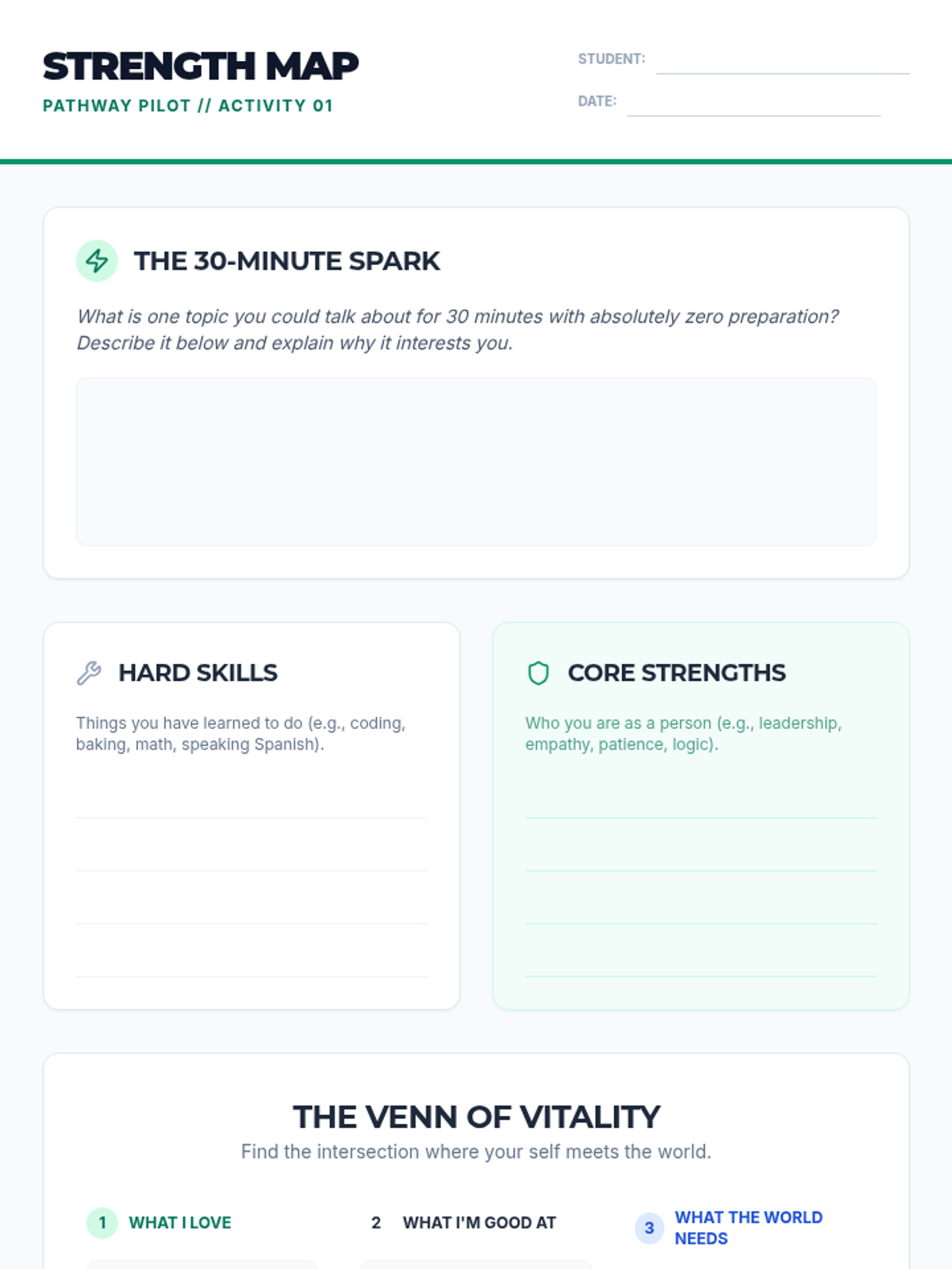 A reflective journey for high school students to discover their unique strengths and passions, mapping them to future academic and career pathways.
