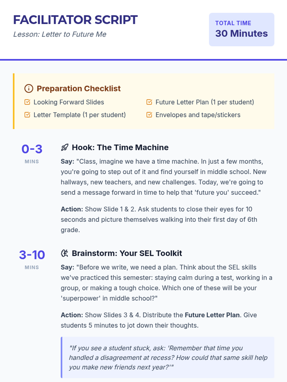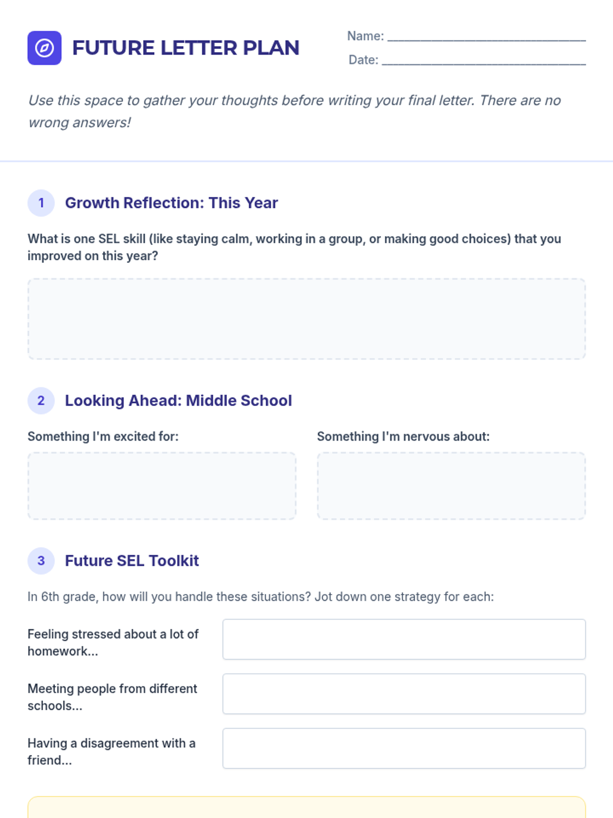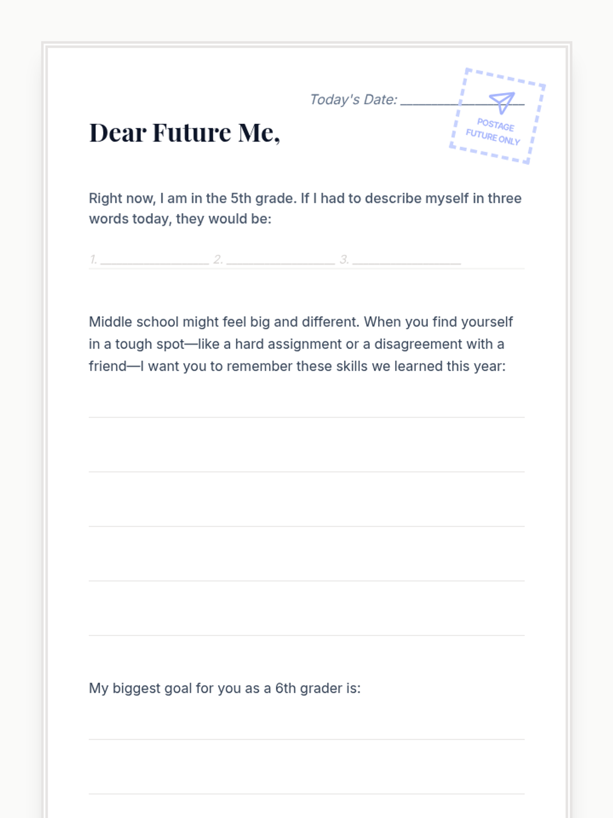 A 30-minute Social-Emotional Learning lesson where 5th-grade students reflect on their growth and write a letter to their future selves about using SEL skills in middle school.