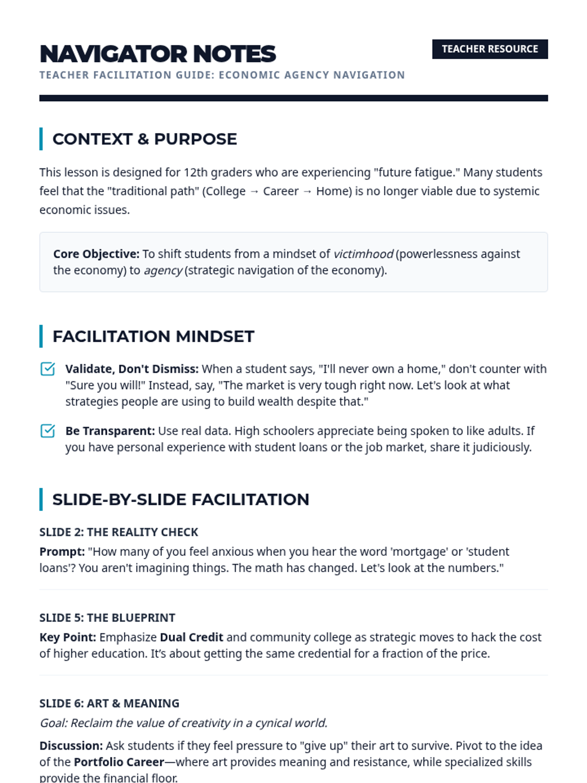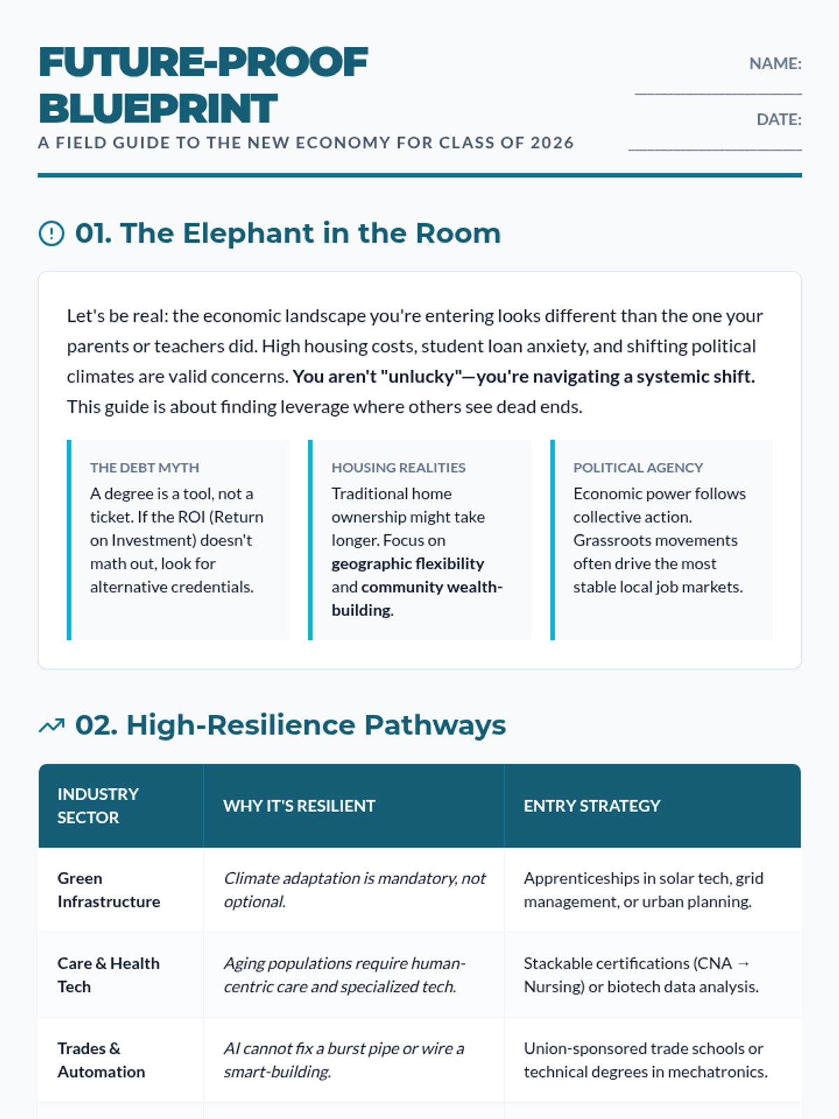 A realistic and empowering lesson designed for high school seniors facing economic anxiety. It provides strategic insights into job market trends, alternative career paths, and financial agency in a challenging economy.