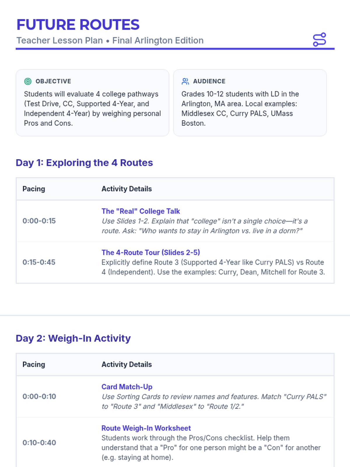 A comprehensive 2-day lesson exploring diverse post-secondary pathways for high school students with learning disabilities, focusing on self-advocacy, comparison of options, and personal fit.