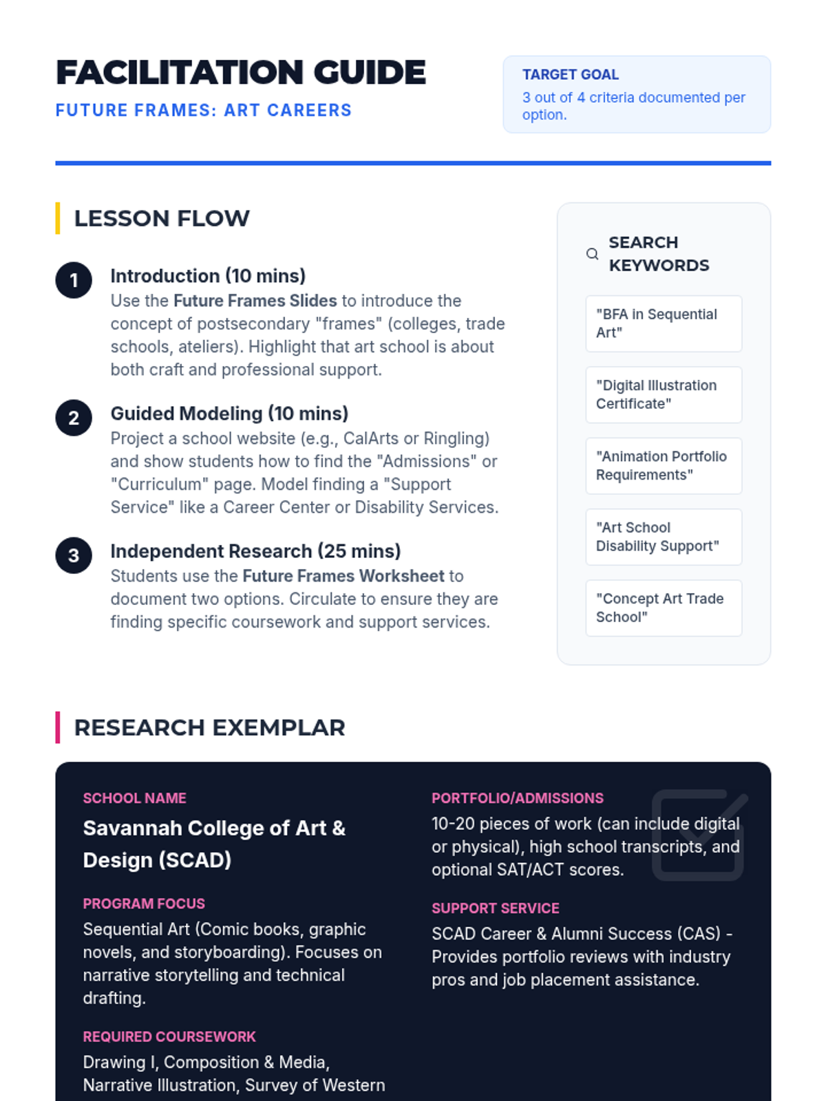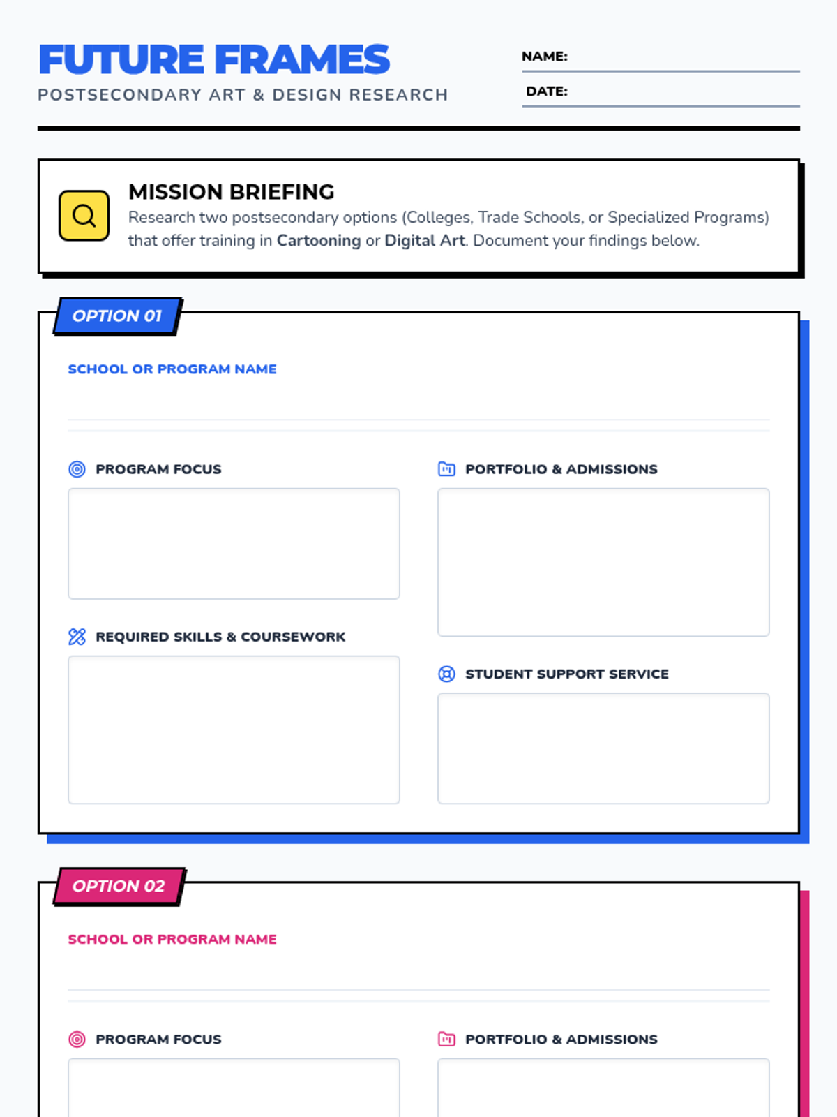 A lesson designed to help students explore and document postsecondary education pathways in cartooning and digital art, focusing on program requirements and student support services.