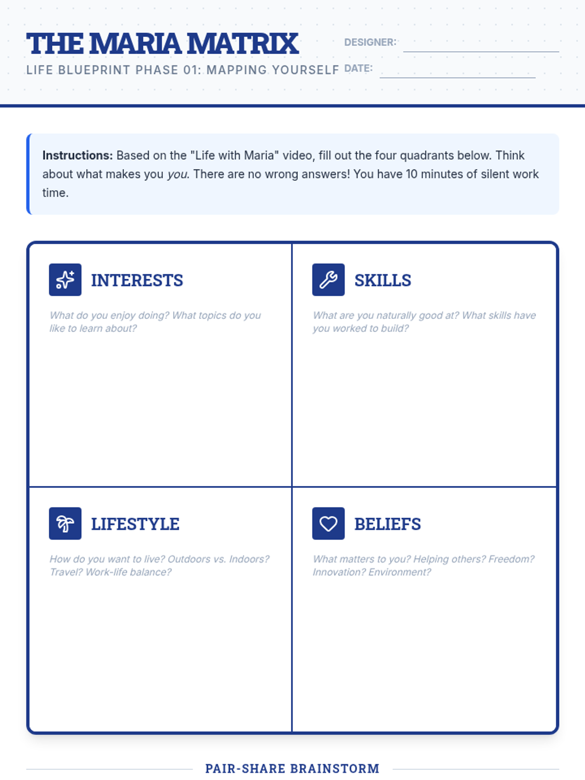 A career exploration lesson for 8th and 9th graders based on the 'Life with Maria' framework, focusing on identifying personal interests, skills, lifestyle preferences, and beliefs to create a future plan.
