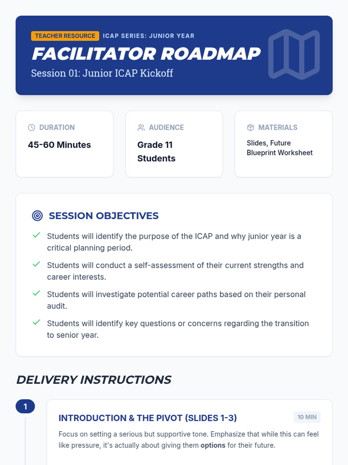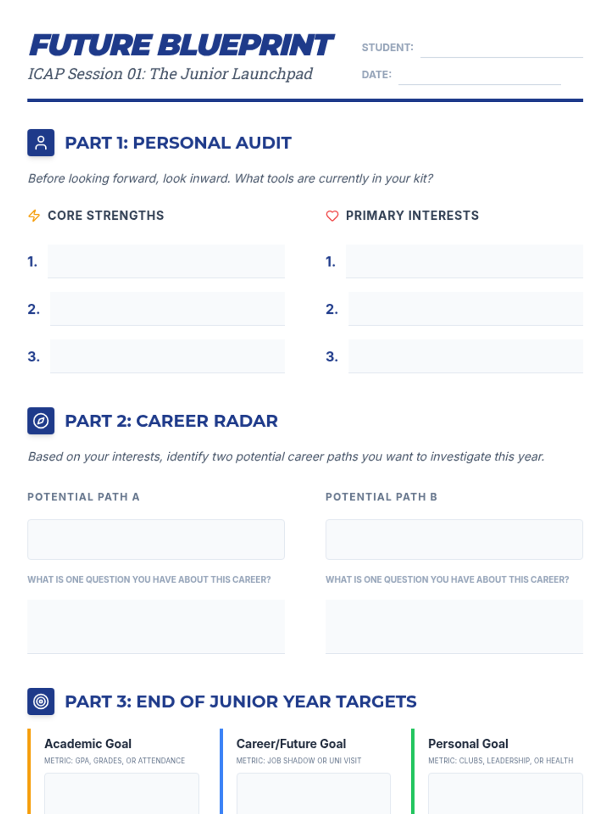 This lesson introduces high school juniors to their Individual Career and Academic Plan (ICAP), focusing on self-assessment, graduation requirements, and setting foundational goals for their penultimate high school year.