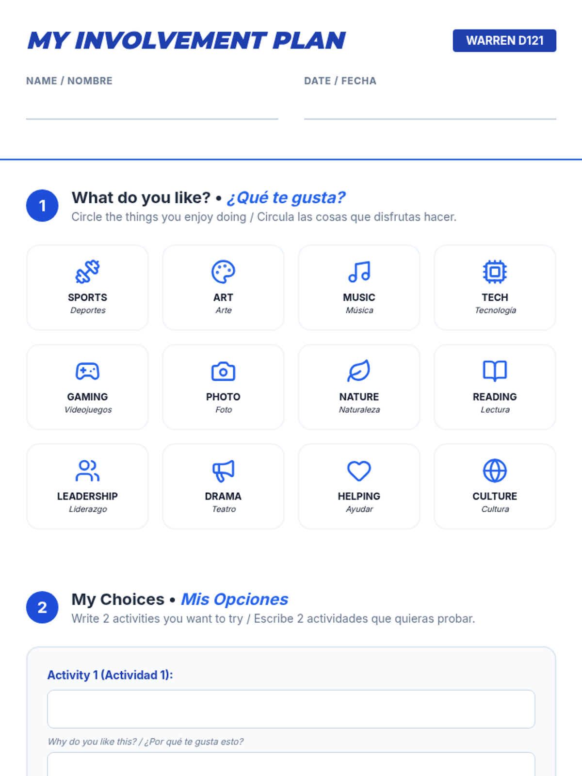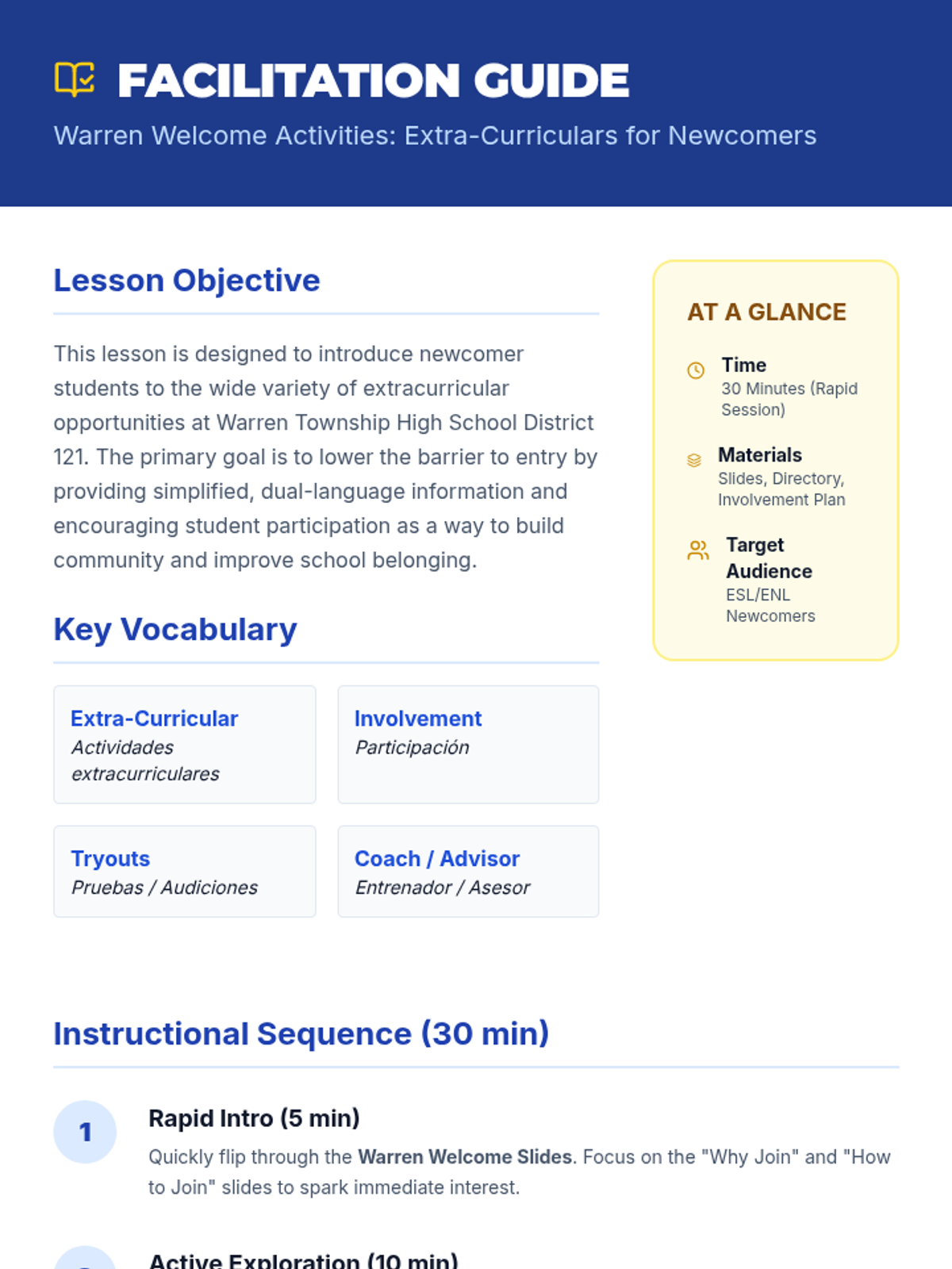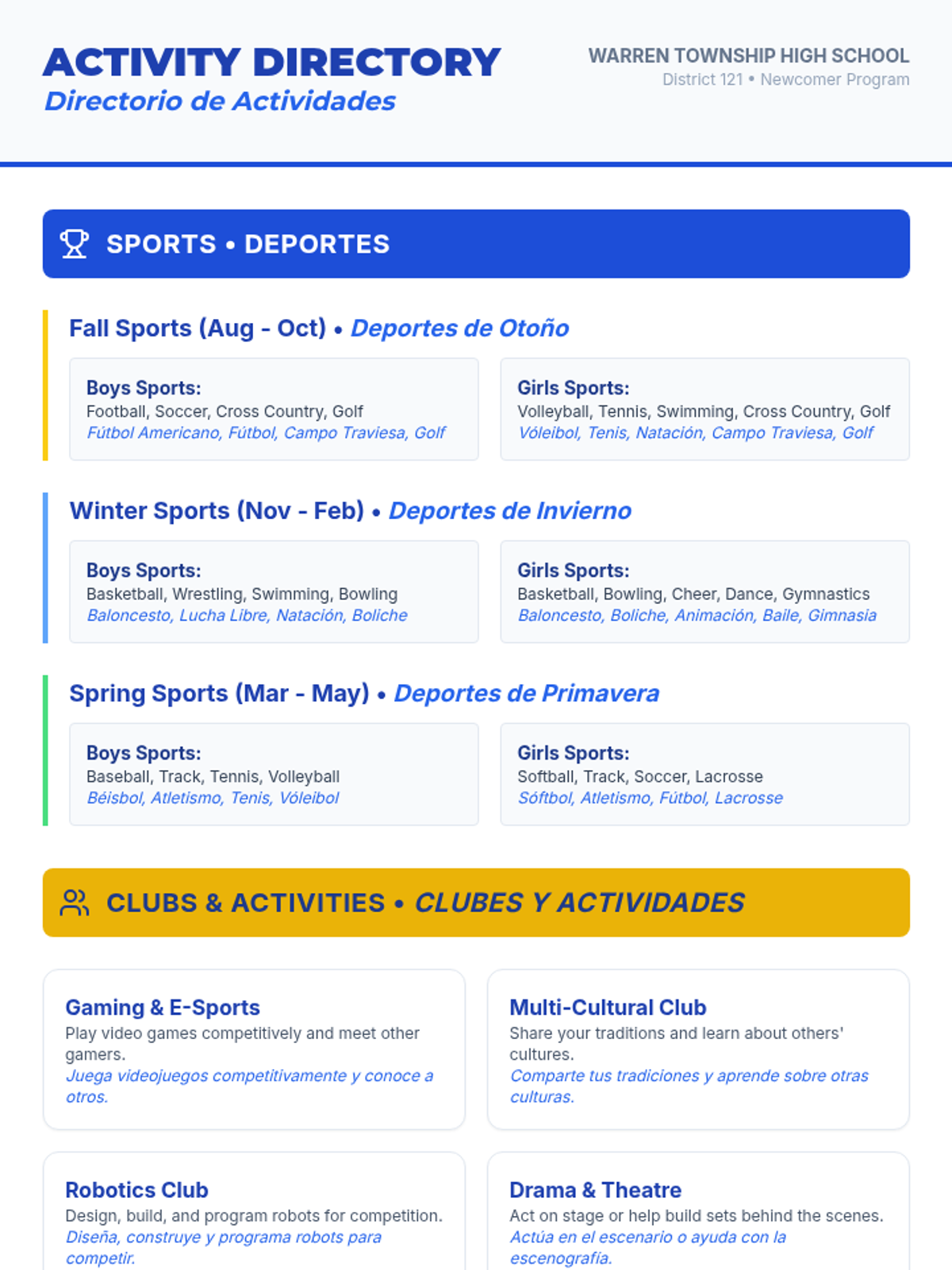 A welcoming lesson for newcomer students to explore the diverse extracurricular opportunities at Warren Township High School District 121, provided in both English and Spanish with simplified language.