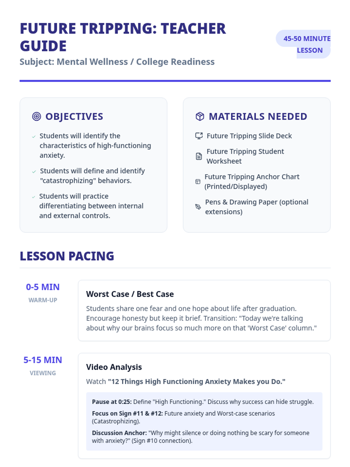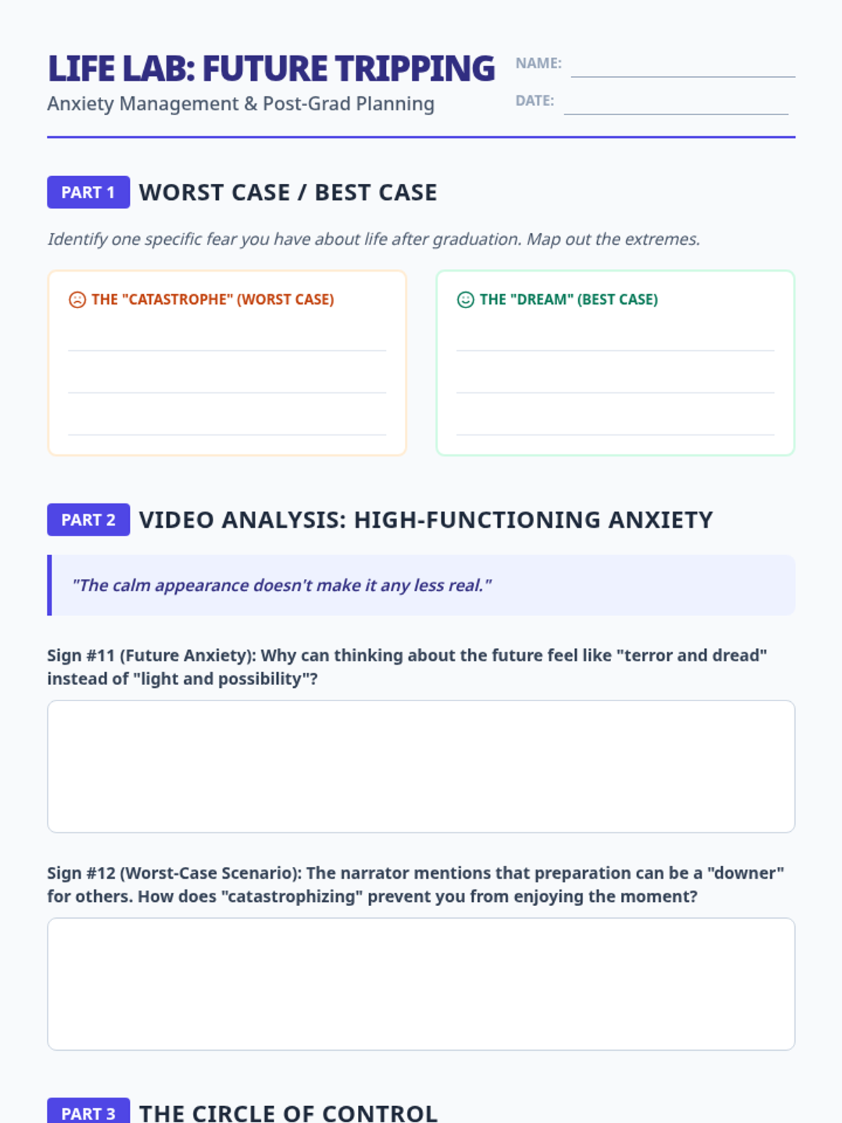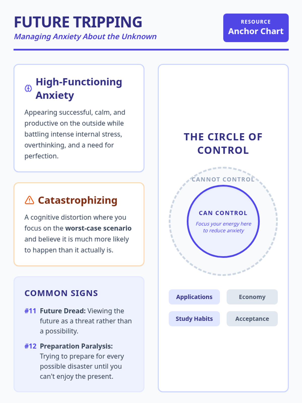 A college-readiness lesson focused on identifying high-functioning anxiety and 'future-tripping' through the lens of the Circle of Control. Students analyze a Psych2Go video to understand catastrophizing and practice mindfulness to manage stress about life after graduation.