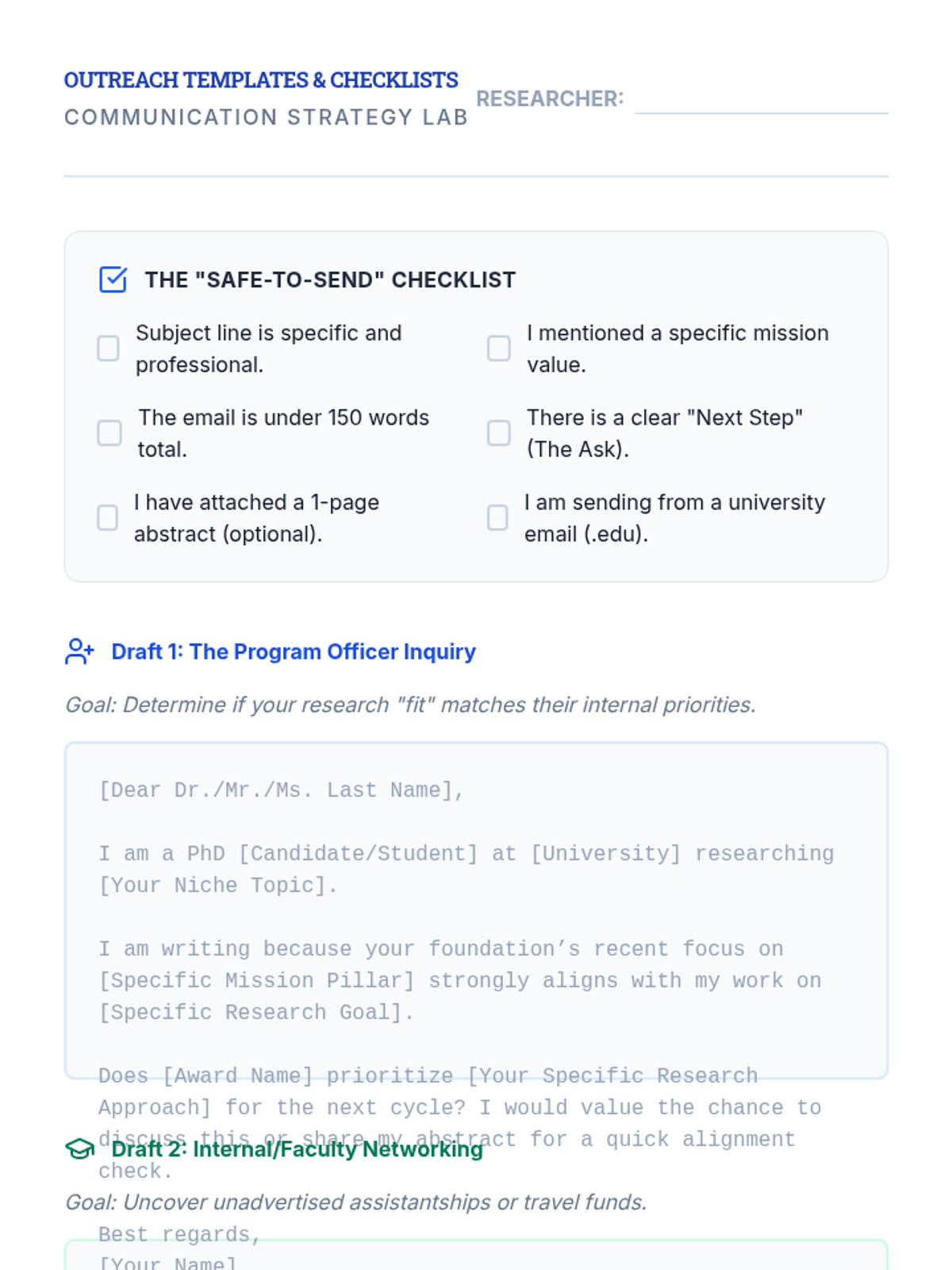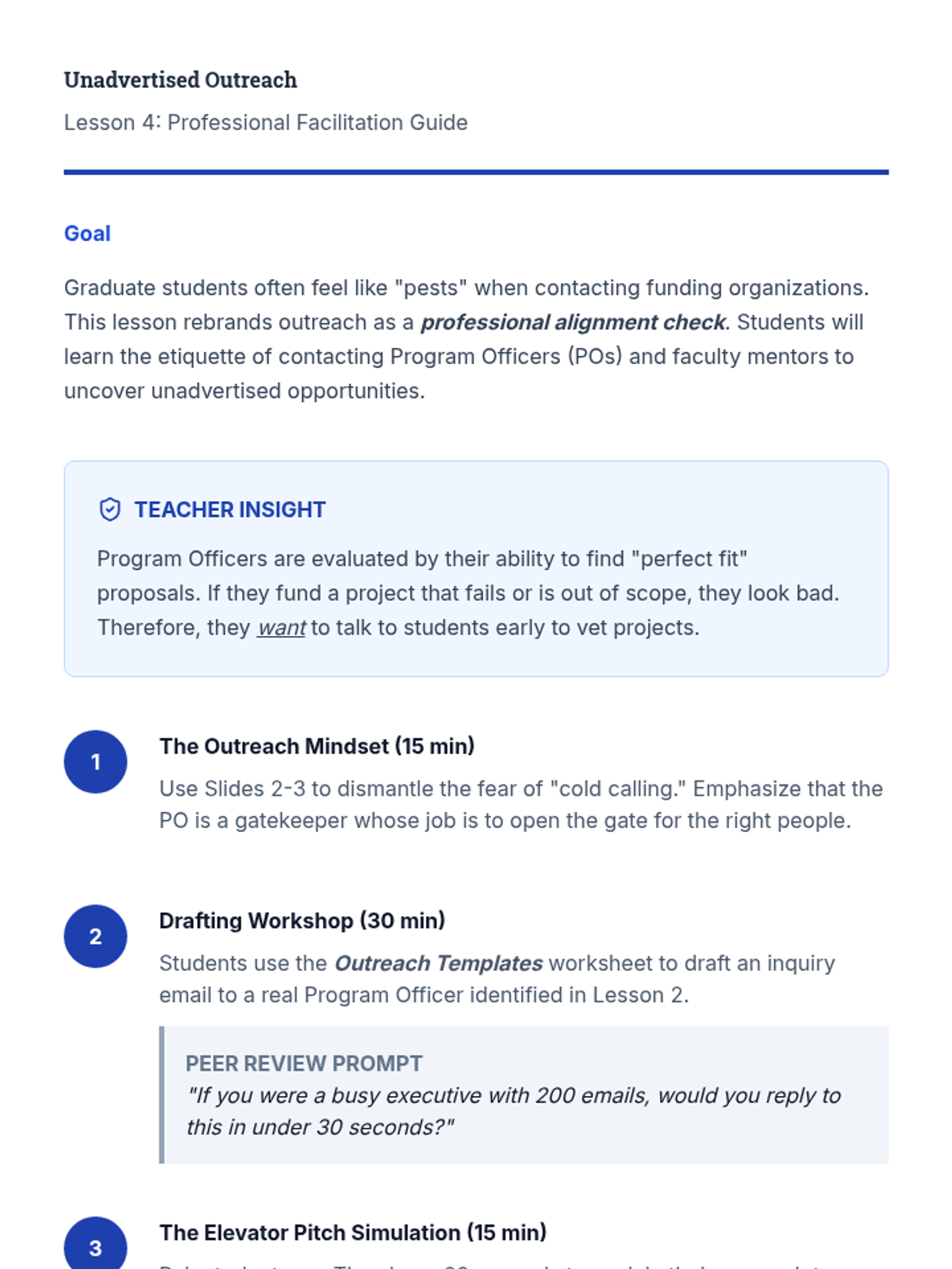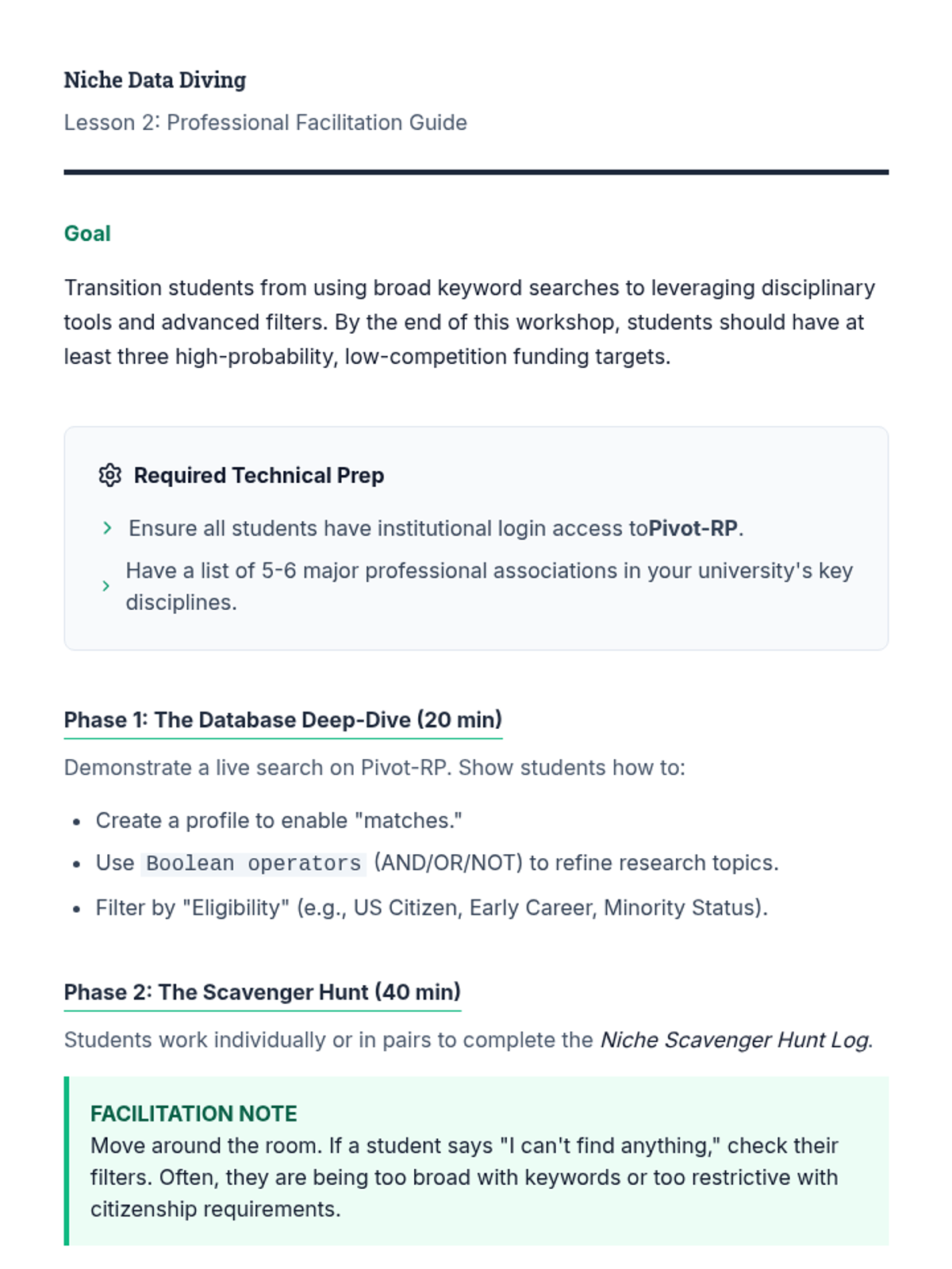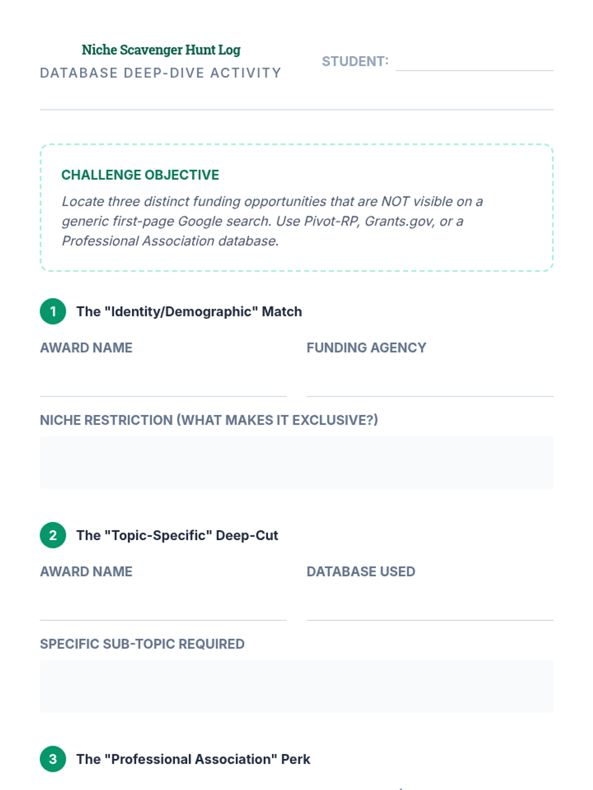 This lesson moves beyond general search engines to utilize specialized databases (like pivot or Grants.gov) and professional society listings. Students conduct a 'deep dive' search to find high-value, low-competition opportunities specific to their discipline.