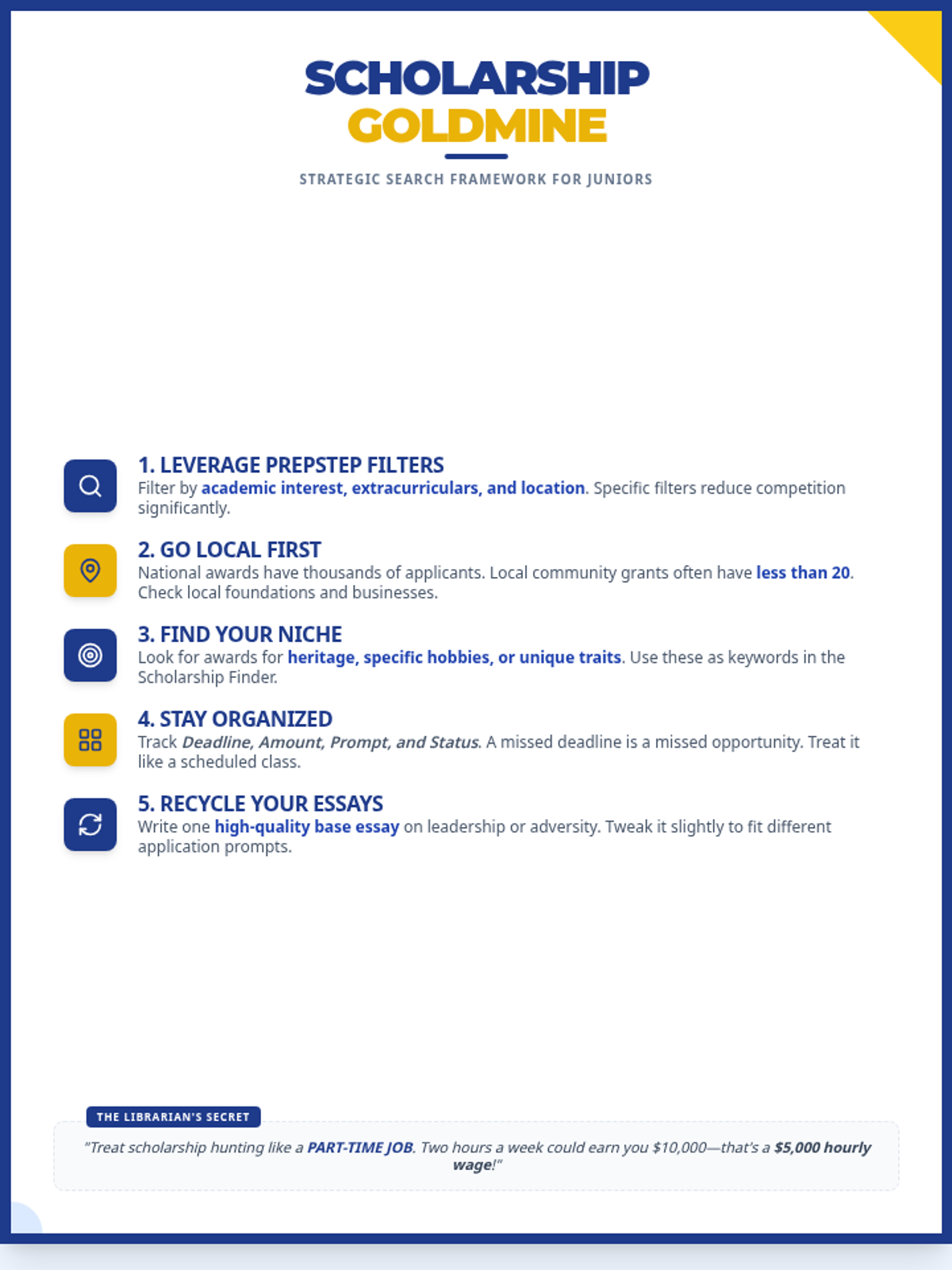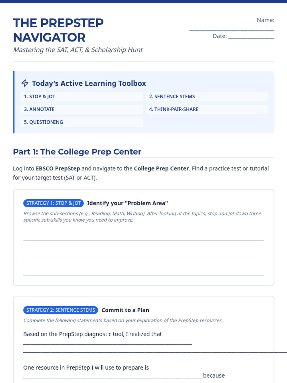 A comprehensive guide for high school juniors to master college test prep and scholarship searching using EBSCO PrepStep, incorporating active learning strategies.