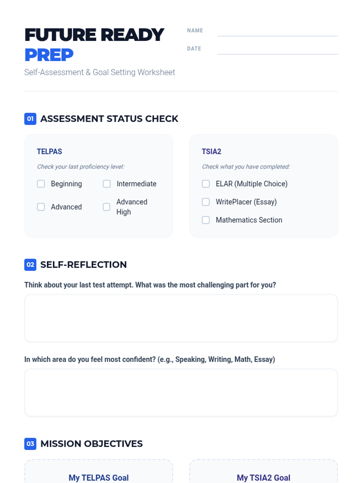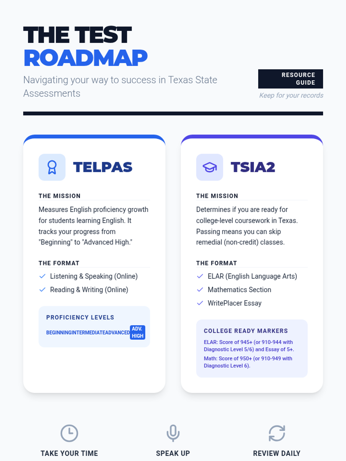 A comprehensive guide for students to understand the TELPAS and TSIA2 assessments, focusing on their purpose, format, and importance for college and career readiness.