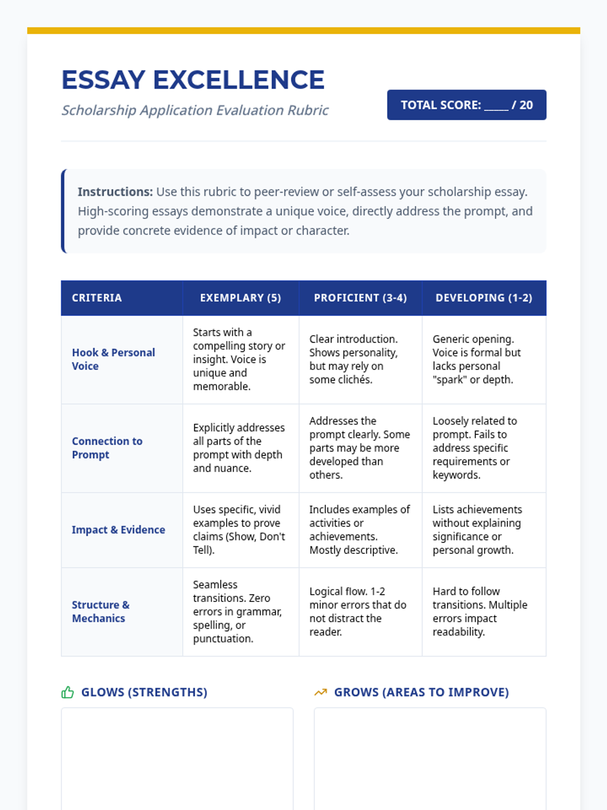 Students practice adapting a core personal story to address various scholarship prompts, learning the art of the 'pivot.'