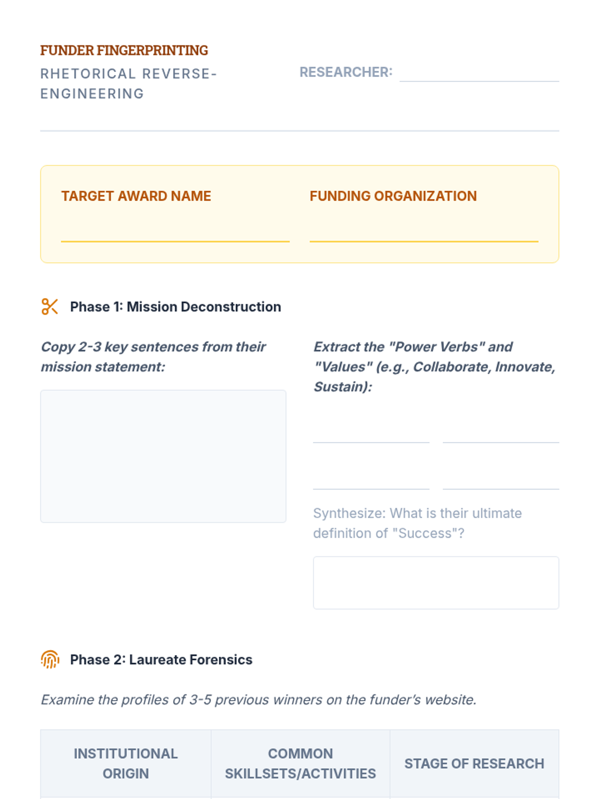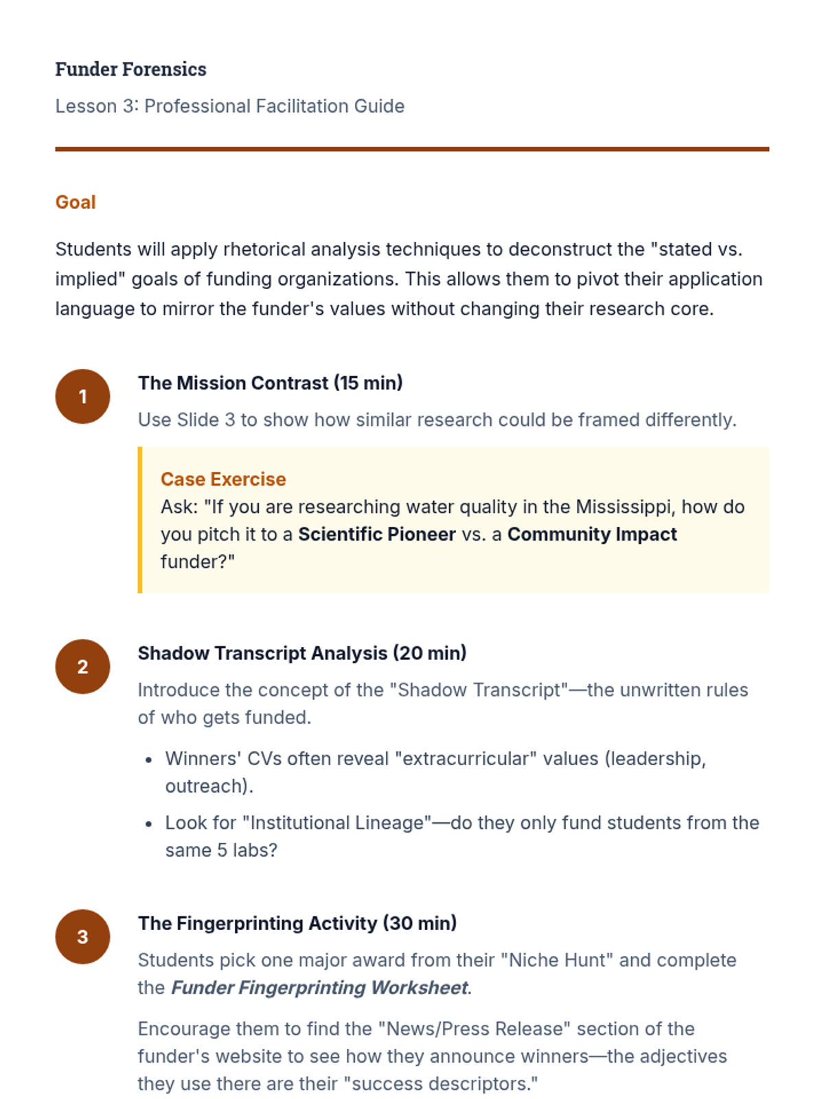 Students perform a rhetorical analysis of mission statements and profiles of previous award winners for top-tier fellowships. This reverse-engineering process helps students understand the implicit criteria and values of funding bodies.
