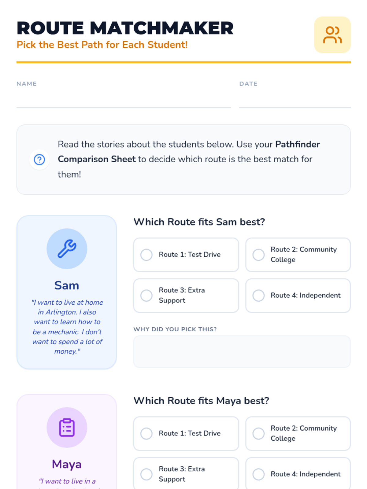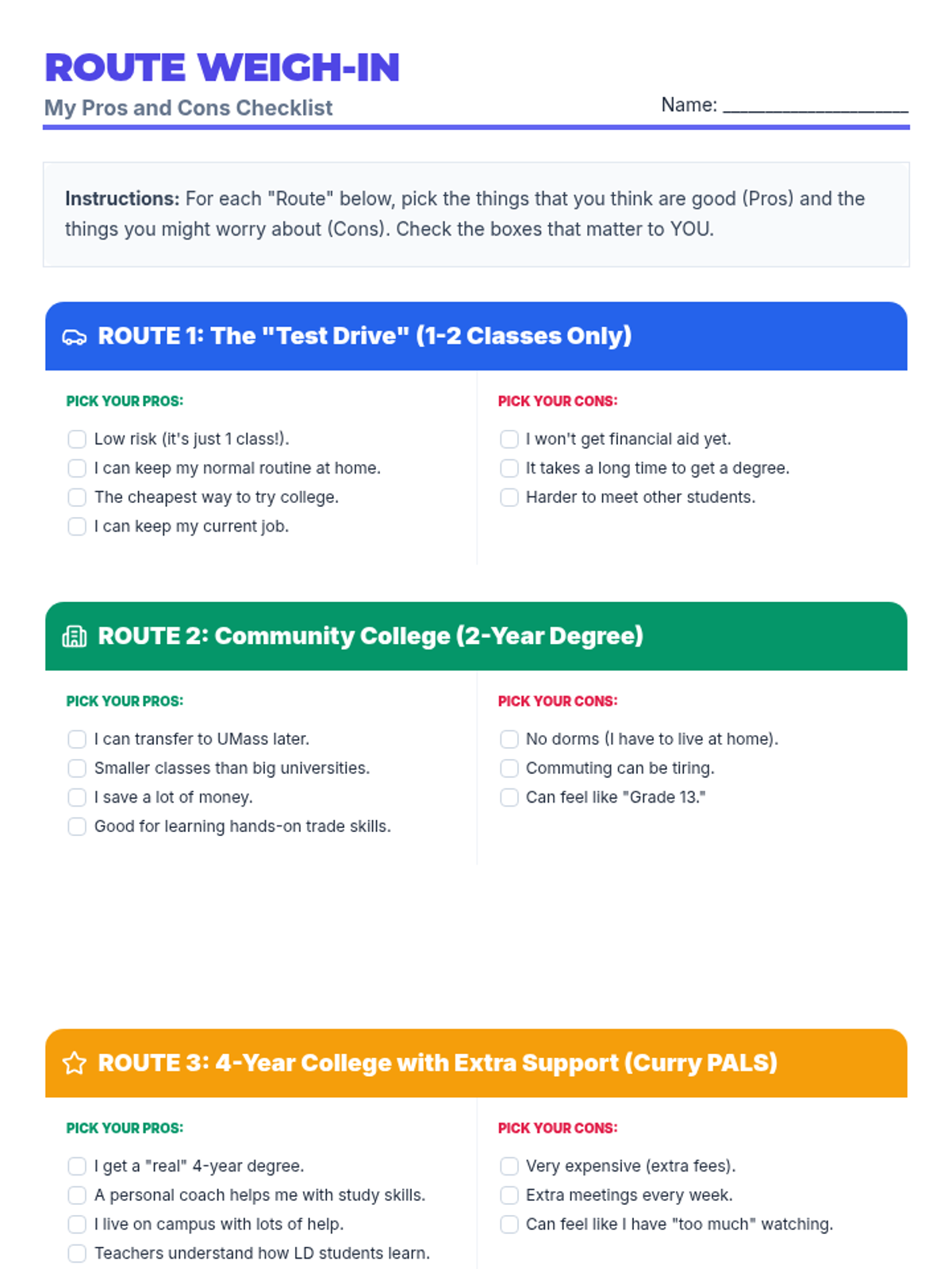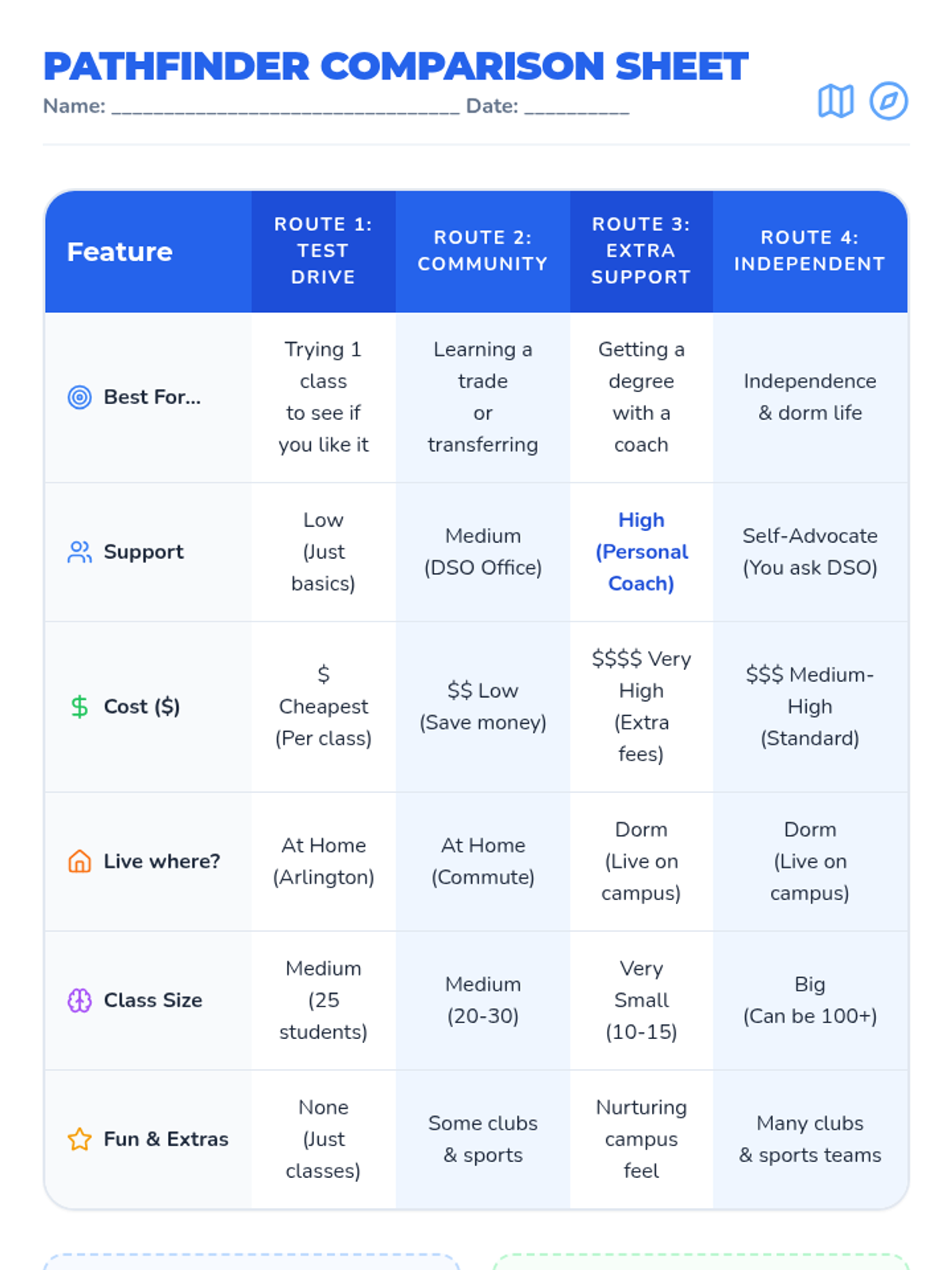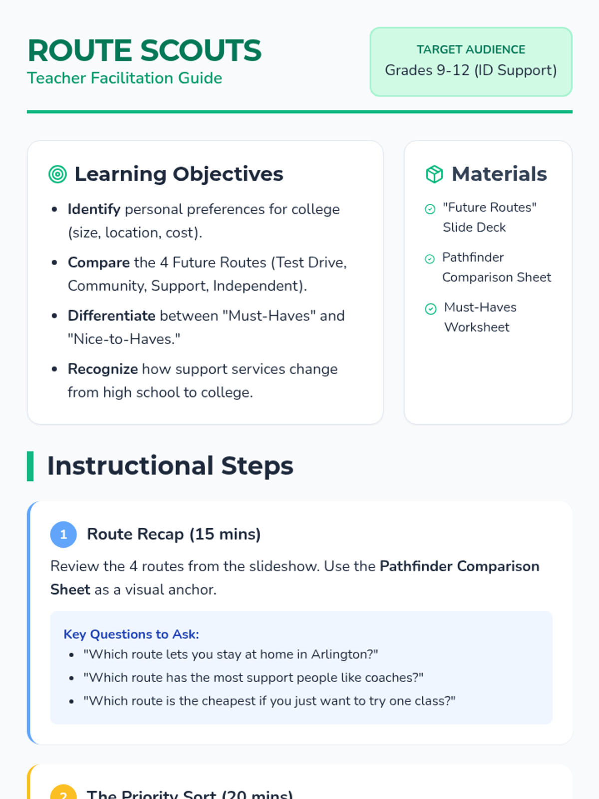 A comprehensive lesson for high school students with intellectual disabilities to explore and compare post-secondary education routes, focusing on personal preferences, support needs, and practical considerations like cost and location.