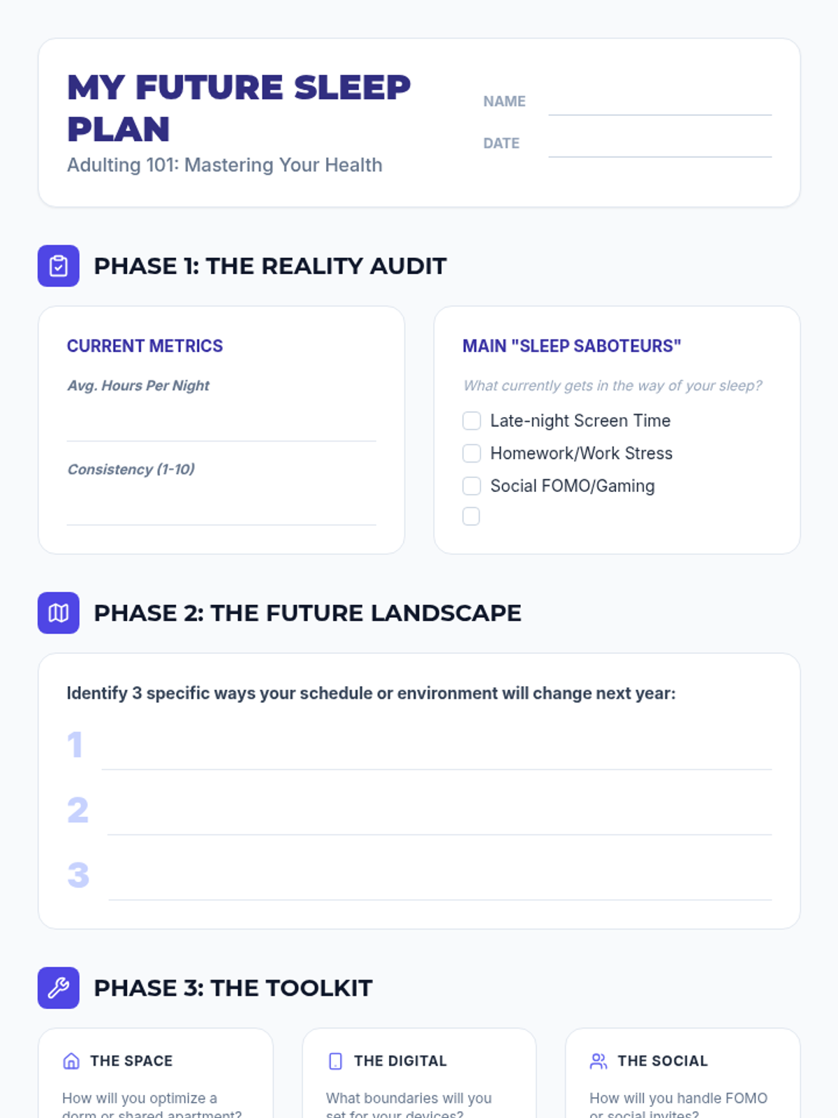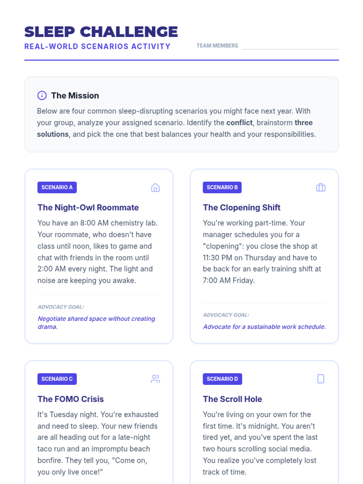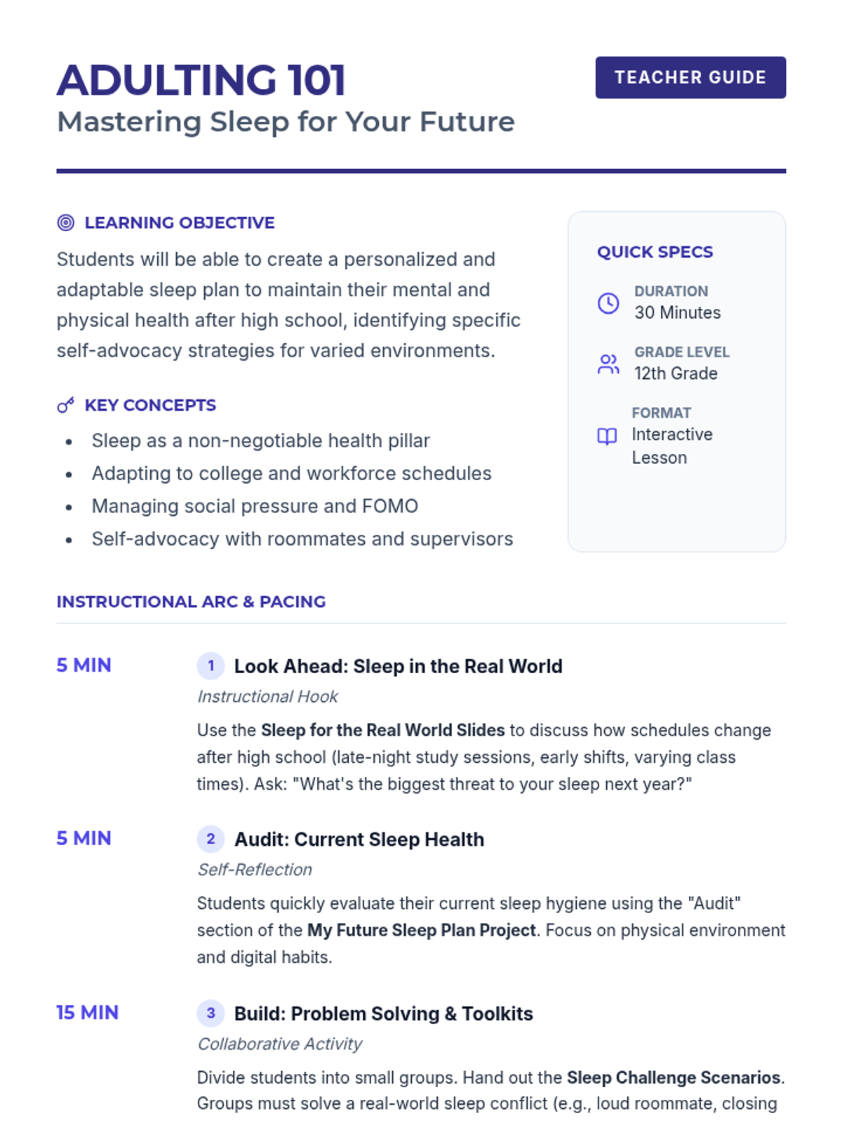 A 30-minute lesson designed for high school seniors preparing for the transition to college or the workforce, focusing on practical sleep strategies and self-advocacy.