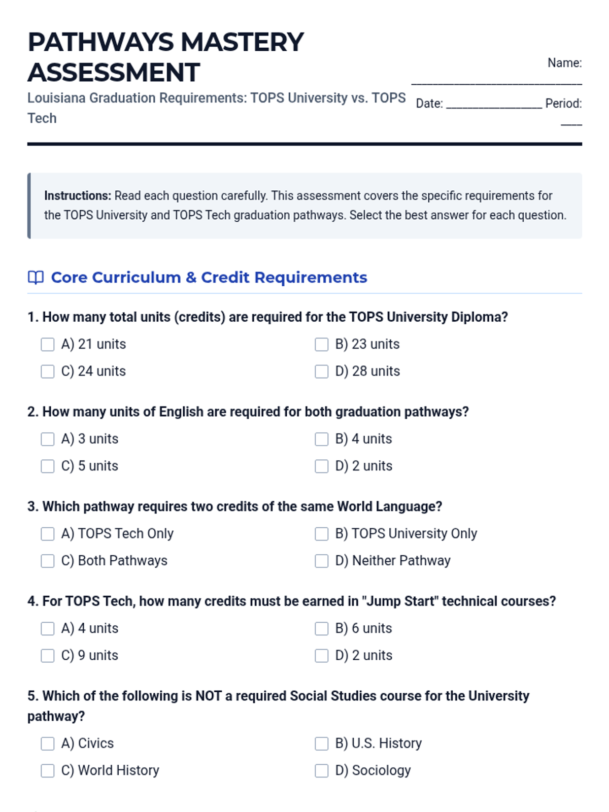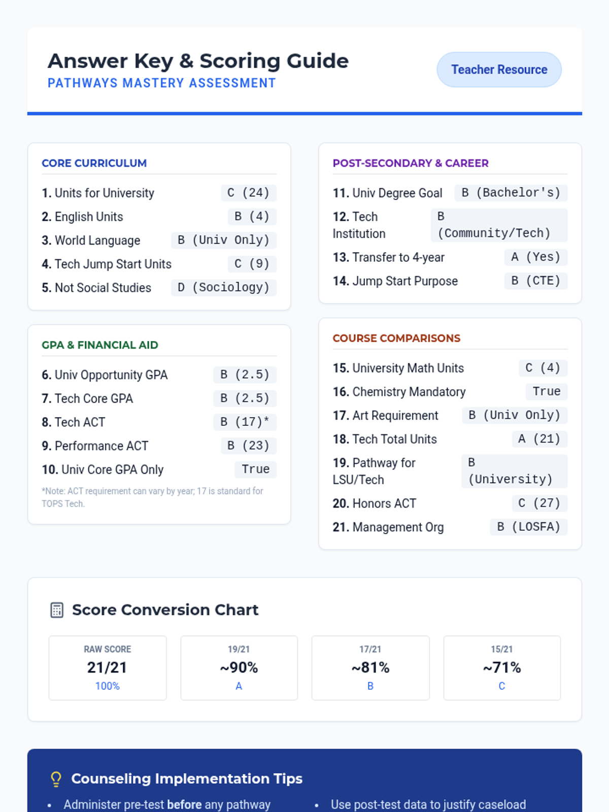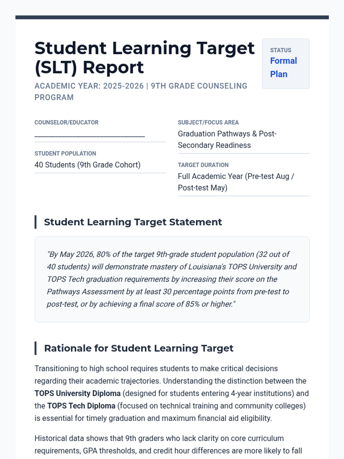 A comprehensive Student Learning Target (SLT) package for 9th-grade counselors focusing on Louisiana's TOPS University and TOPS Tech graduation pathways, including assessment tools and professional documentation.