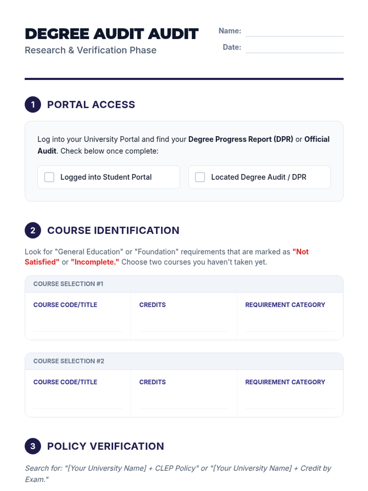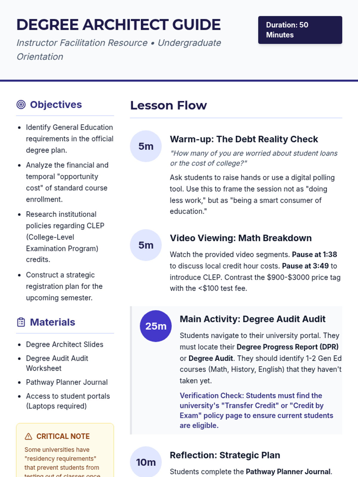 A first-year seminar lesson designed to help undergraduate students audit their degree plans and identify opportunities to accelerate their education through CLEP exams, saving both time and money.