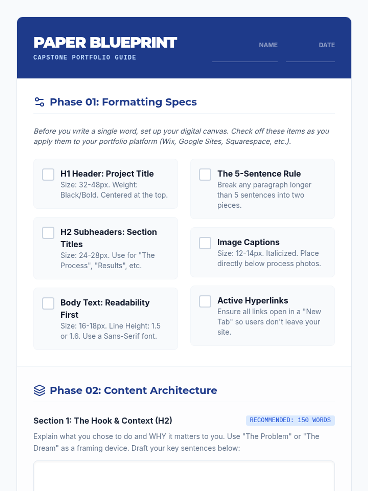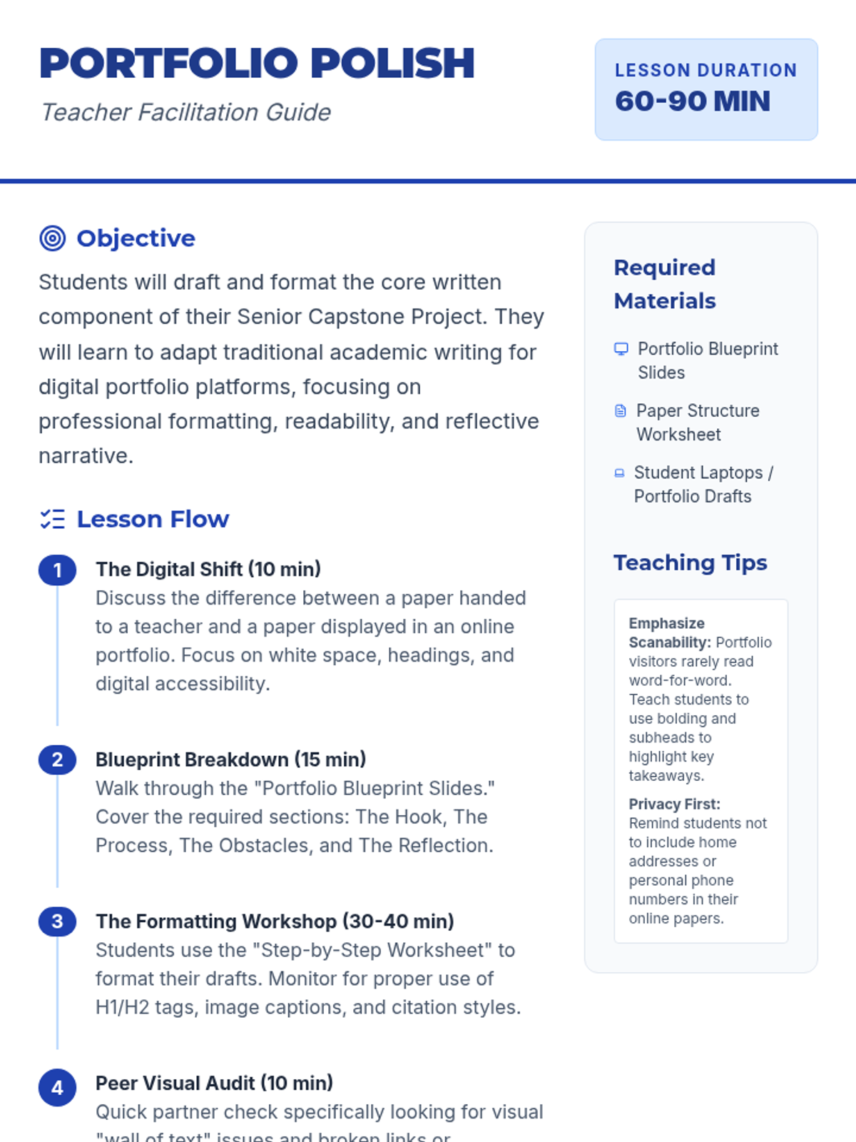 A comprehensive one-day lesson designed to guide high school seniors through the process of writing and formatting their Capstone Project paper for their online portfolios. The lesson focuses on structural integrity, professional digital formatting, and reflective writing techniques.