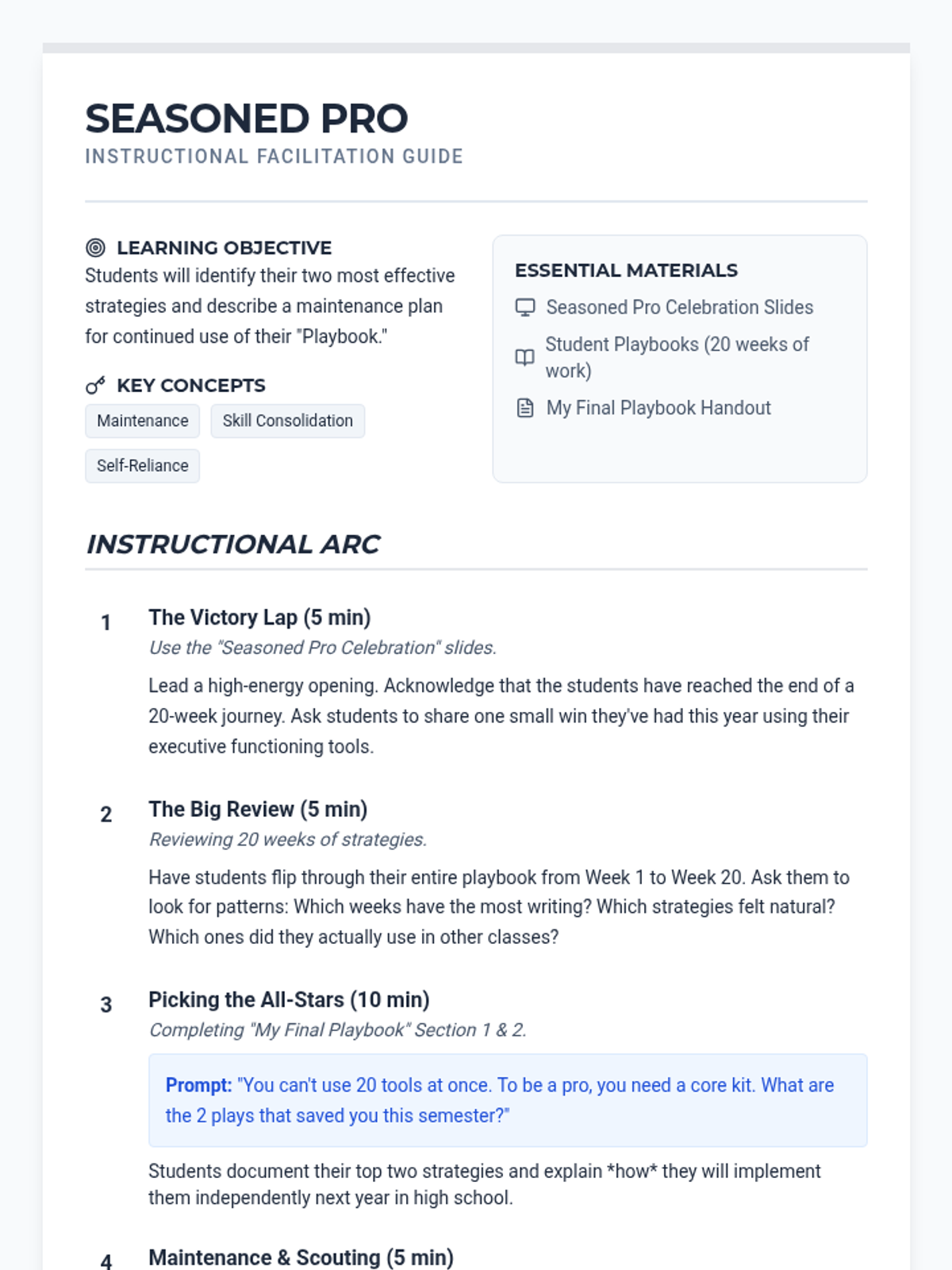 A reflective 30-minute lesson where 8th-grade students consolidate their top executive functioning or social-emotional strategies, celebrate 20 weeks of growth, and create a sustainable plan for future self-reliance.