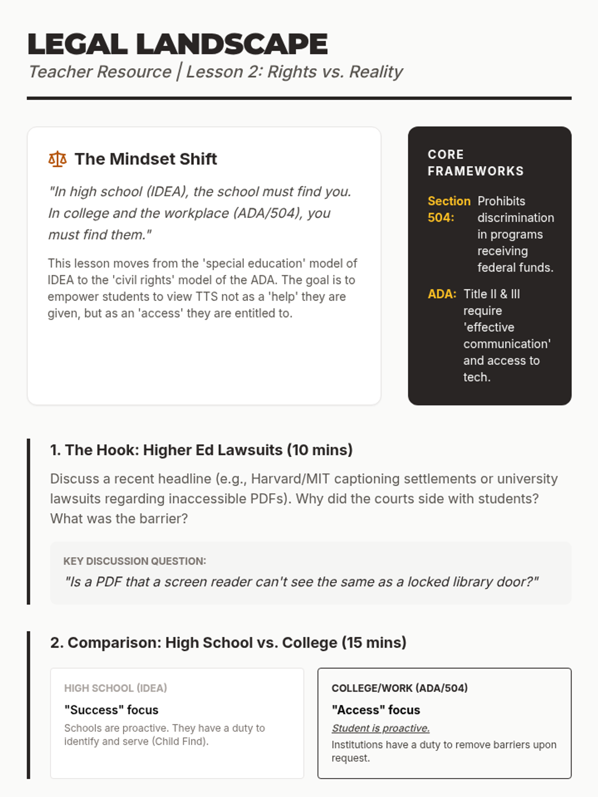 Students synthesize their learning into a professional transition one-pager that summarizes their specific assistive technology needs and legal rights.