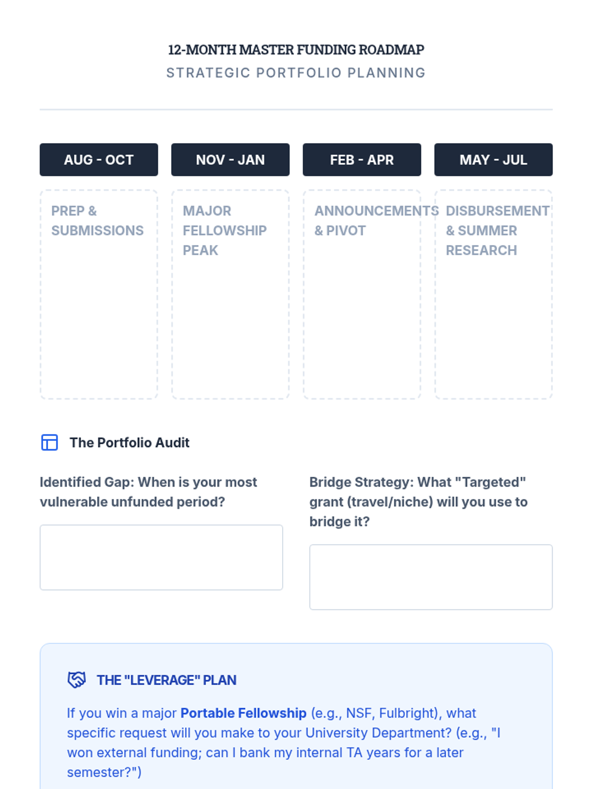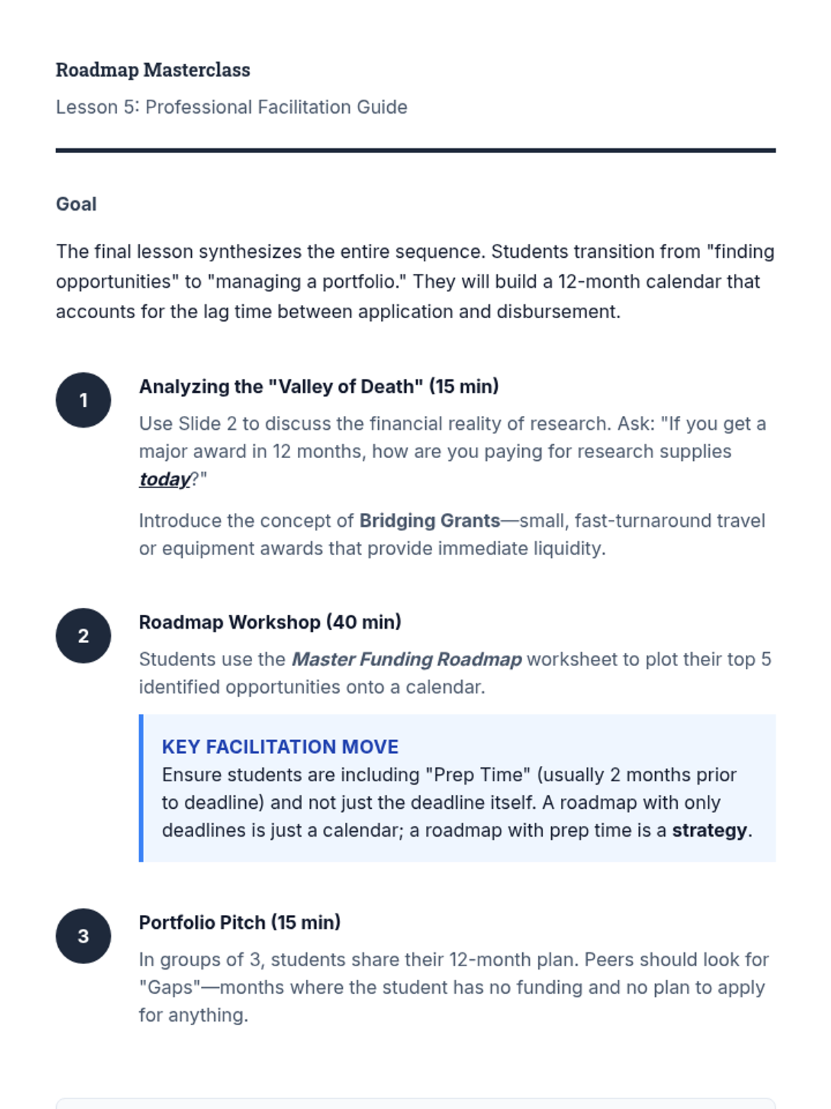 The sequence concludes with students building a multi-year funding strategy that accounts for application cycles, research phases, and diverse revenue streams. They create a master calendar integrating preparation time, deadlines, and announcement dates.