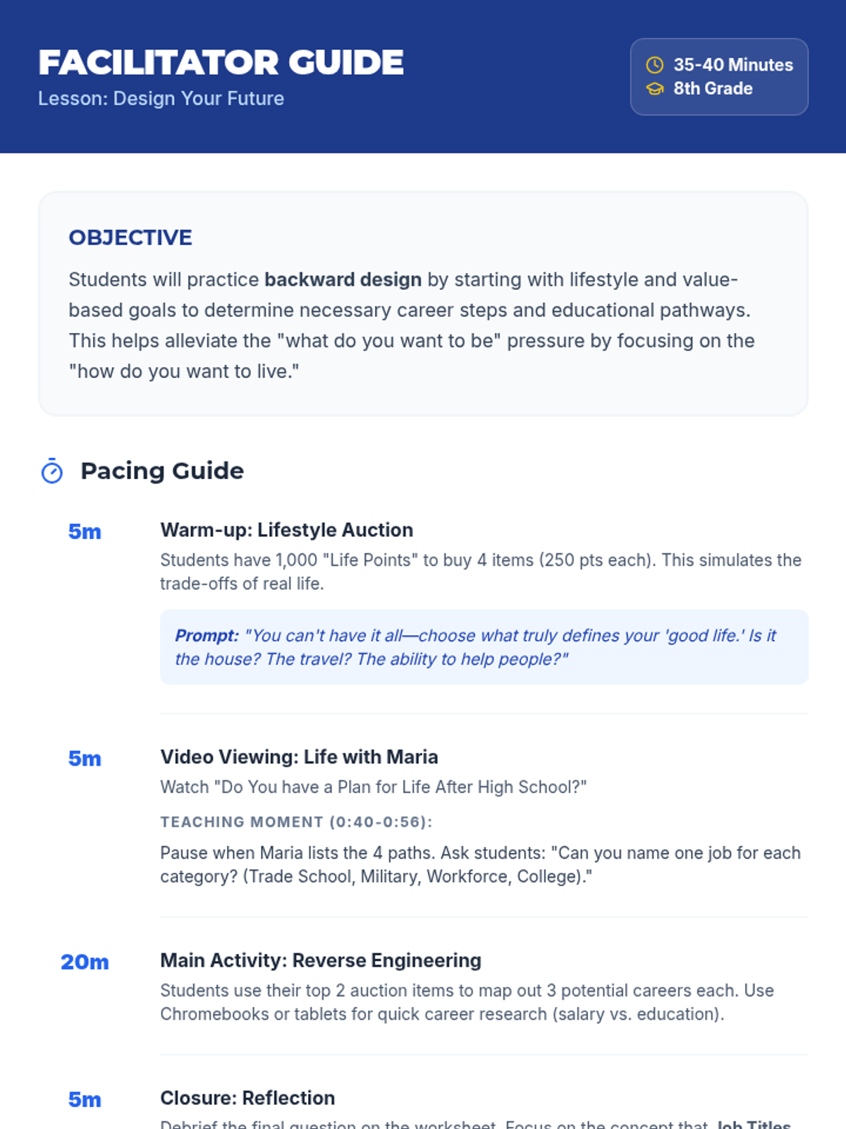 This lesson helps 8th-grade students transition to high school by using backward design to plan their futures. Students participate in a 'Lifestyle Auction' to identify their values, watch a video on Maria's career planning strategy, and reverse-engineer career paths that align with their desired lifestyle and education goals.