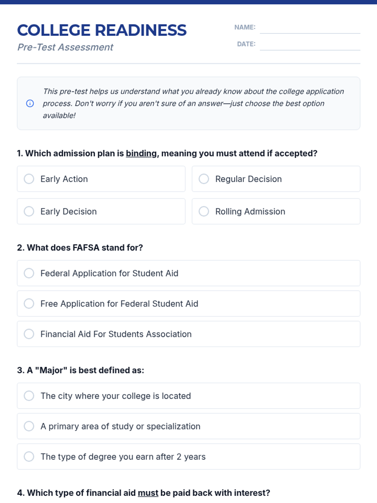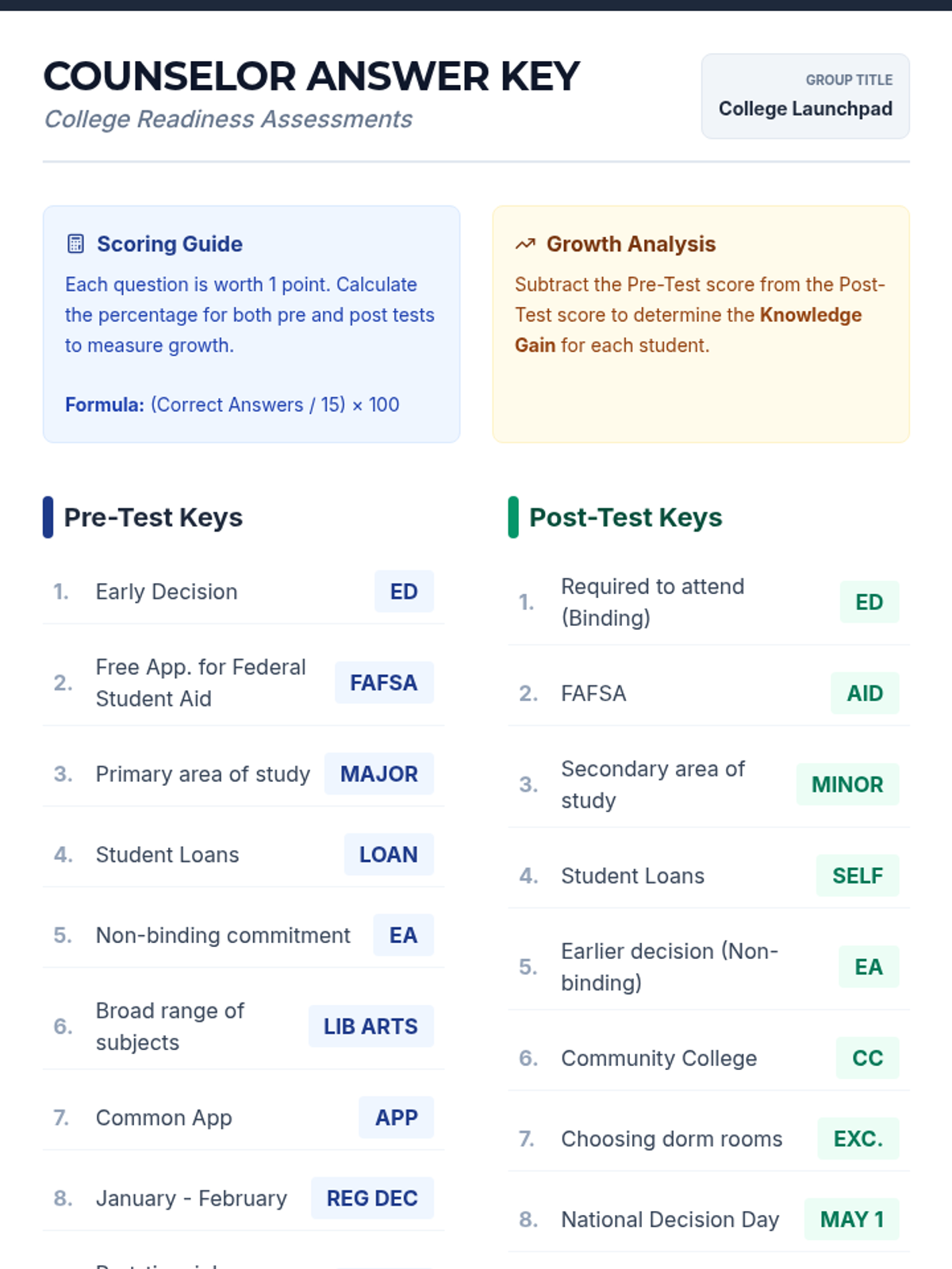 A comprehensive assessment pair designed to measure high school students' growth in college application knowledge, financial aid literacy, and admissions terminology.