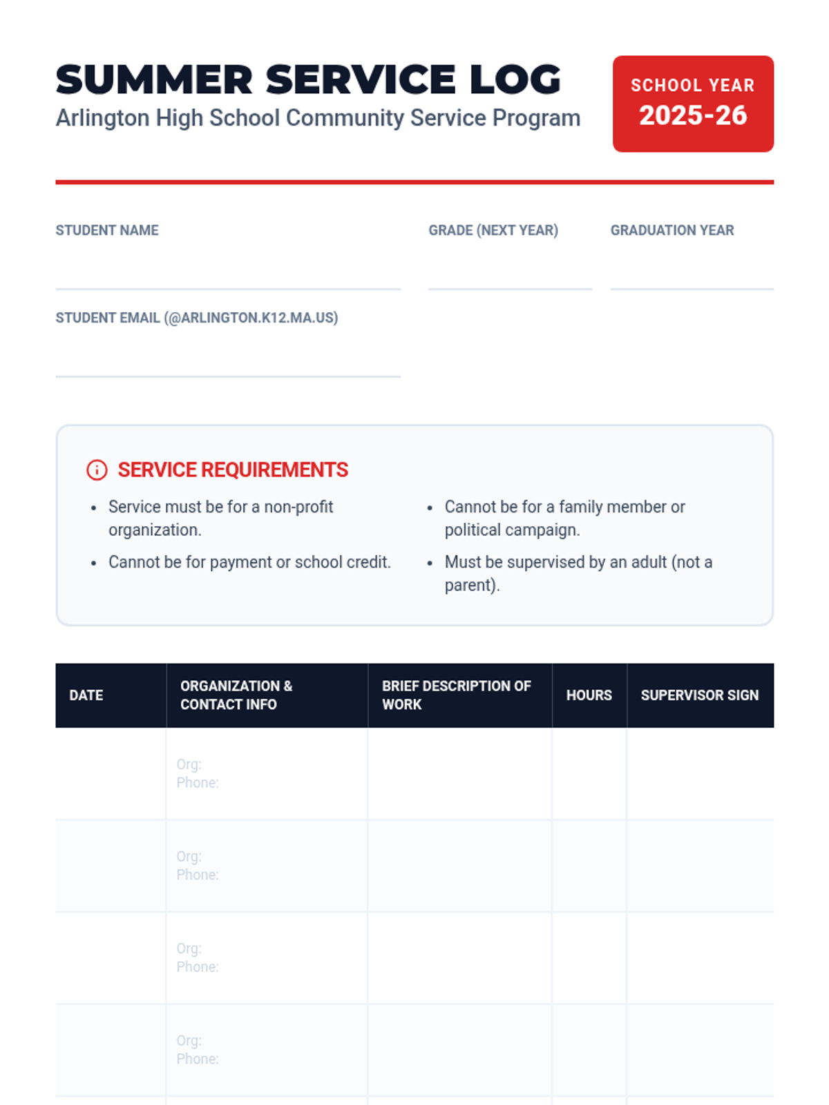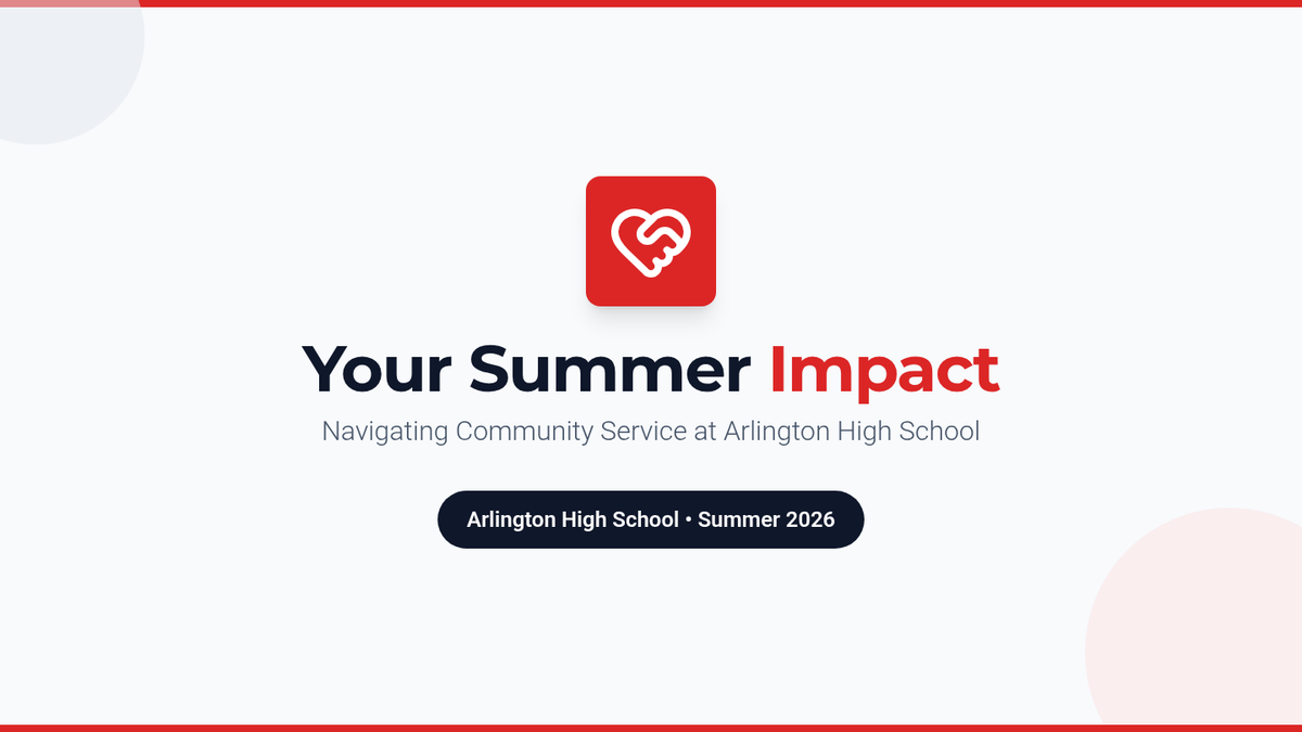 A presentation and tracking guide for Arlington High School students to find, execute, and record summer community service hours.