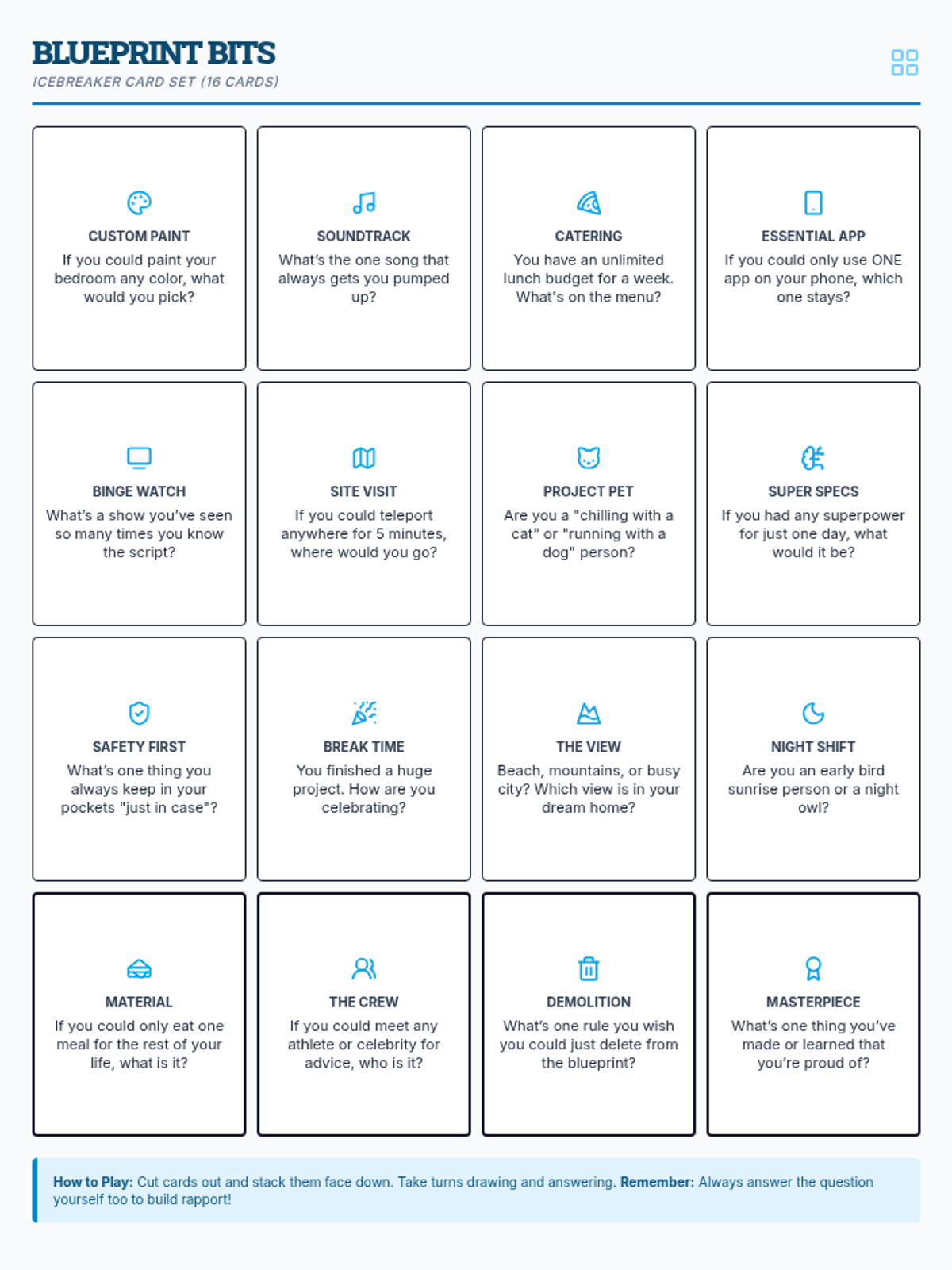 A first-meeting transition session designed to build rapport and gather information about a student's future goals for school, career, and independent living through a low-pressure, visual 'blueprint' theme.