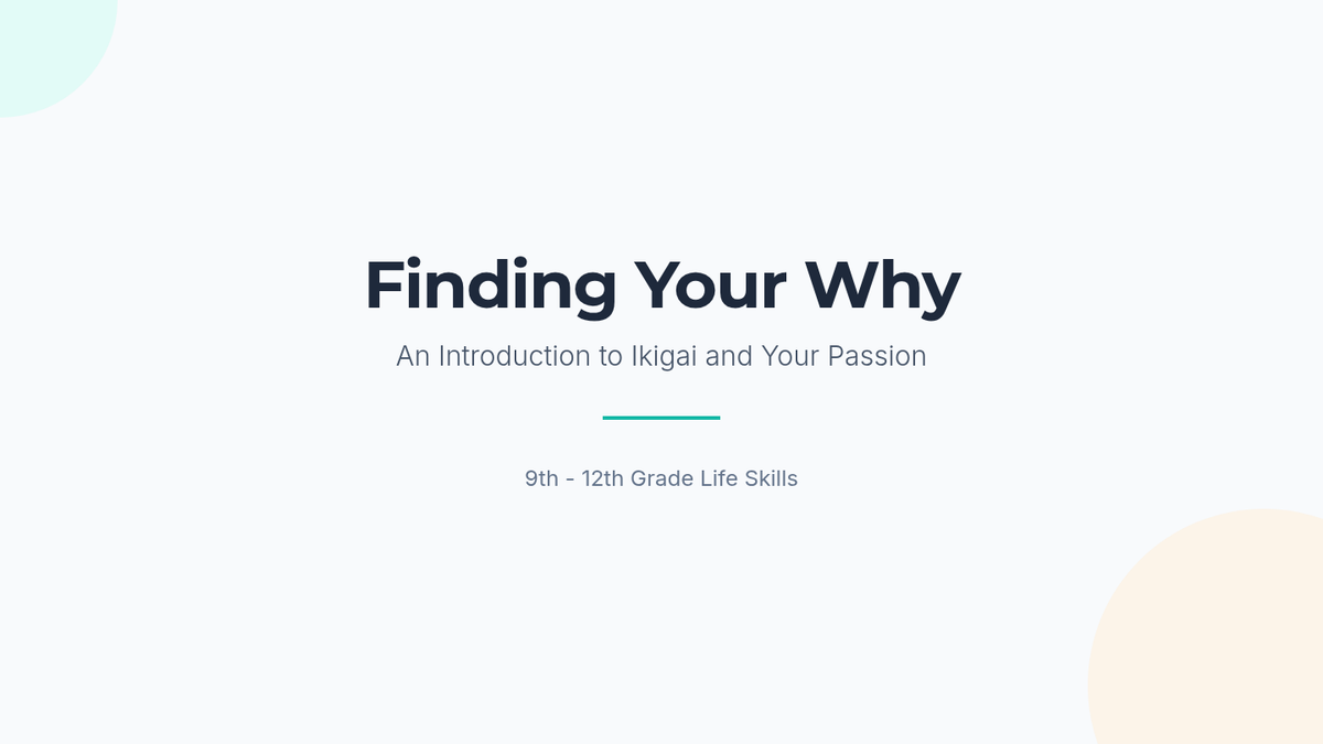 A lesson focused on helping high school students discover their 'Ikigai' by identifying the intersection of their passions, skills, the world's needs, and career potential. Based on Jay Shetty's workshop.
