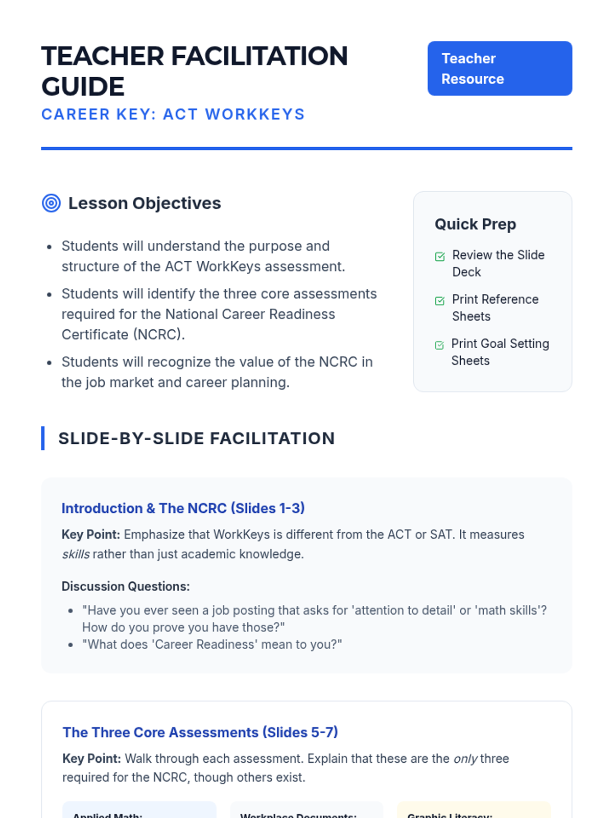 This lesson introduces students to the ACT WorkKeys assessment, highlighting its significance in career readiness and the benefits of earning a National Career Readiness Certificate.