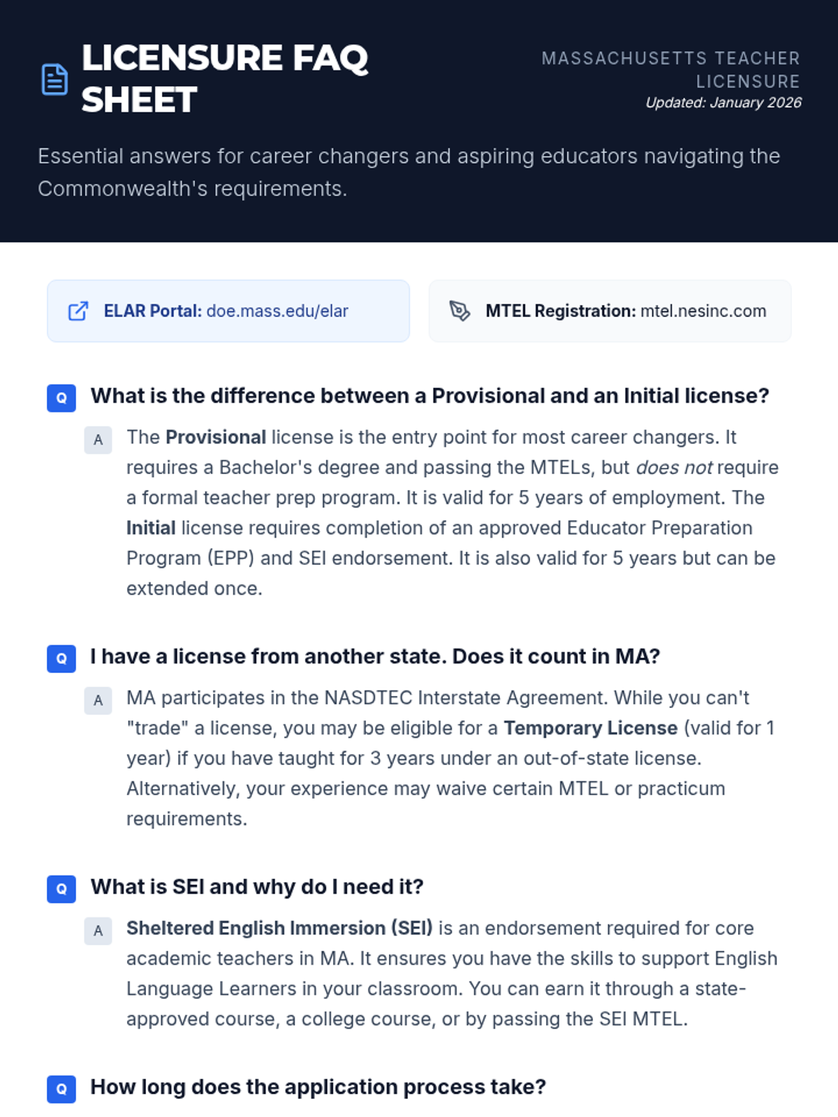 A comprehensive guide for adults navigating the Massachusetts teacher licensure process, covering pathways, MTEL requirements, and the ELAR application system.