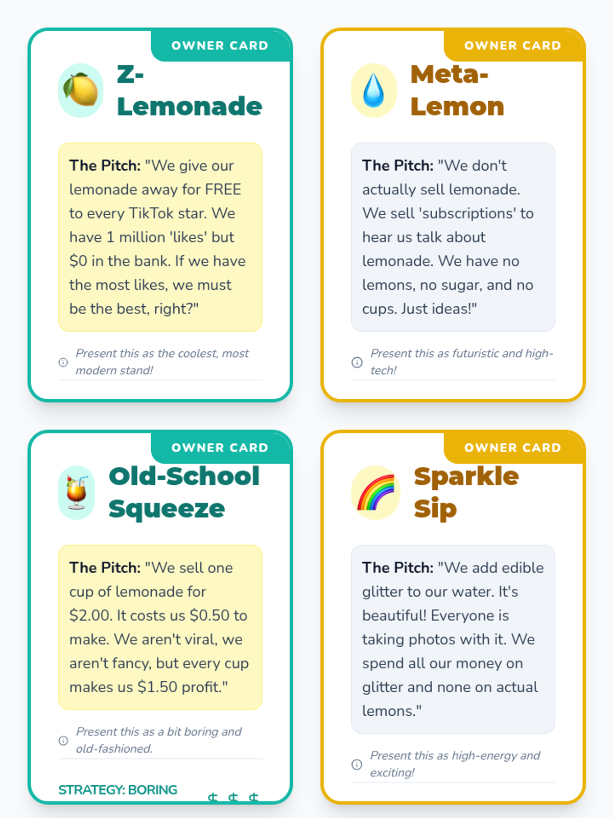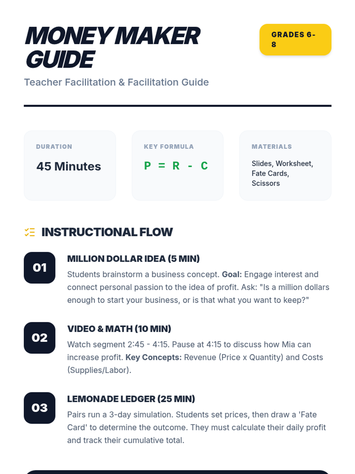 Students learn the fundamental formula for profit (Revenue - Cost) through a video, discussion, and an interactive paper-based simulation running a lemonade stand influenced by random 'Fate Cards'.