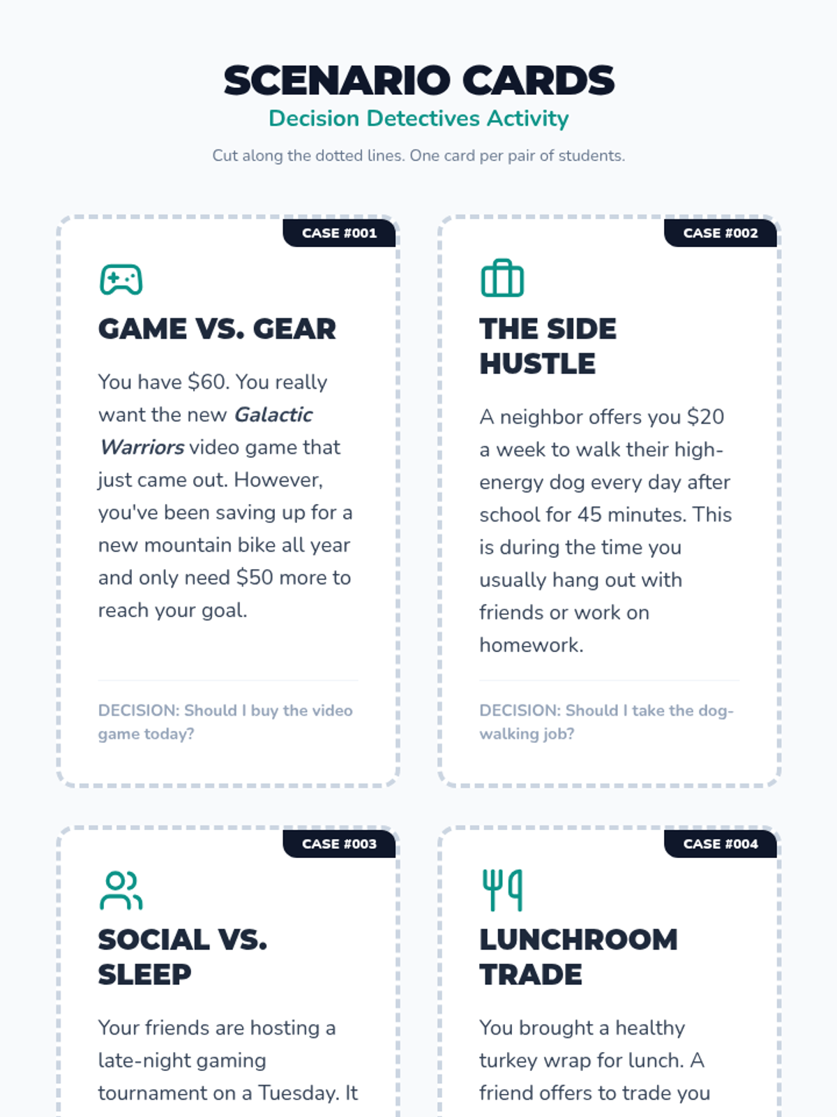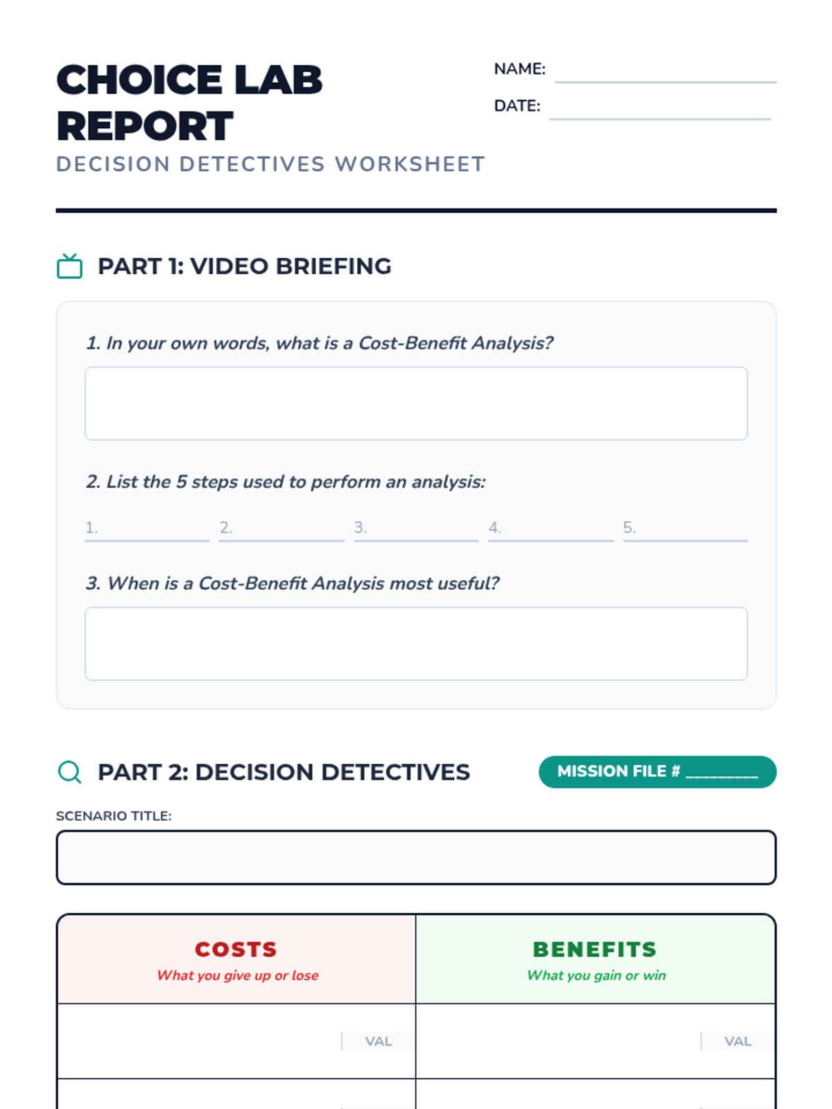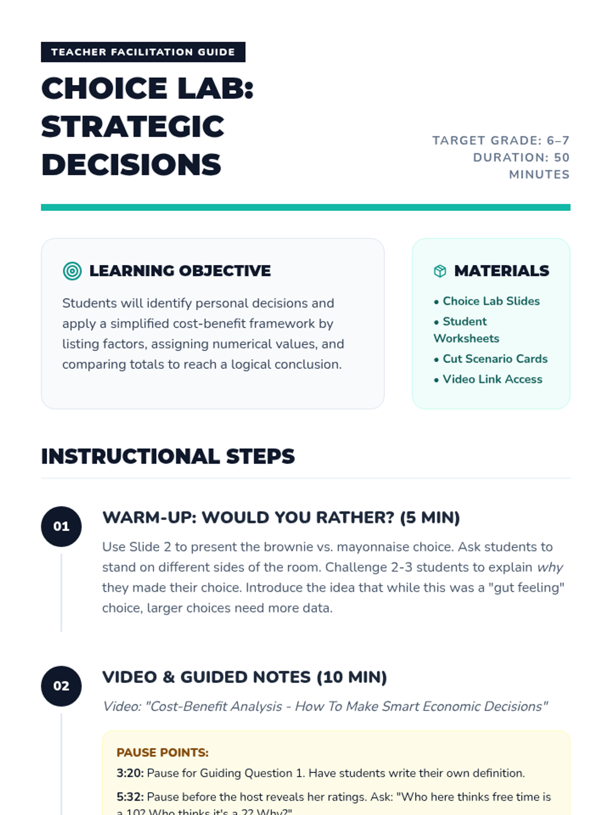Students learn to move beyond coin flips to strategic decision-making using the 5 steps of Cost-Benefit Analysis. They analyze real-world middle school scenarios to weigh costs and benefits using a numerical valuation system.