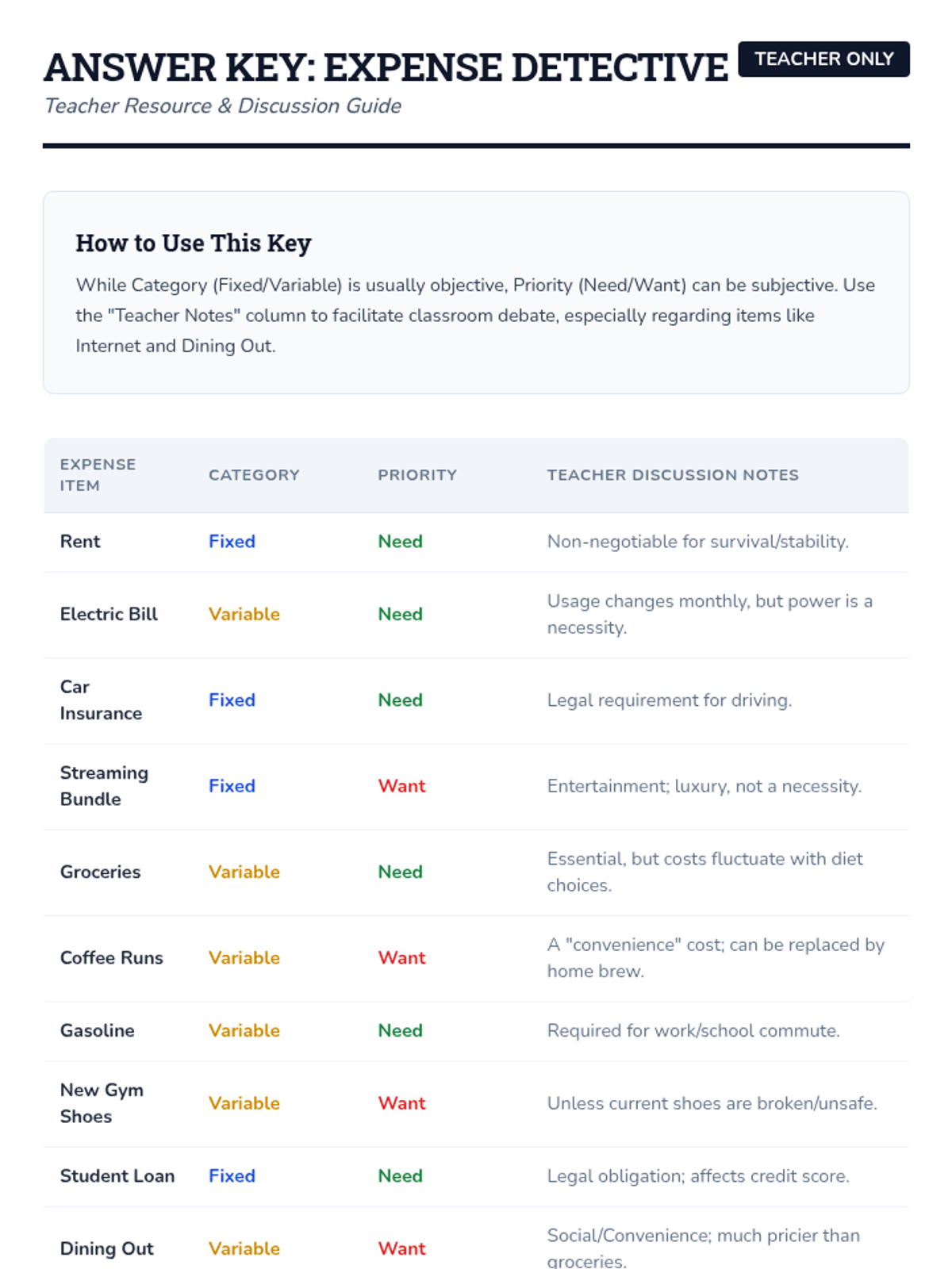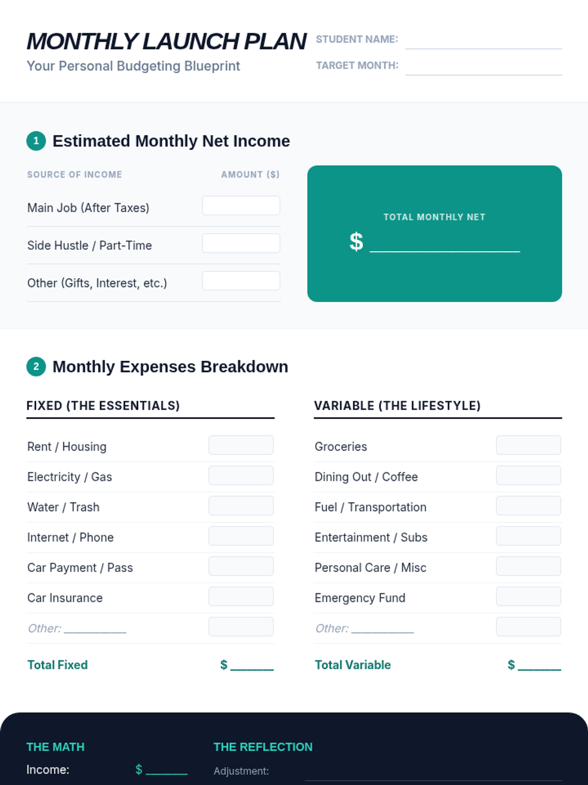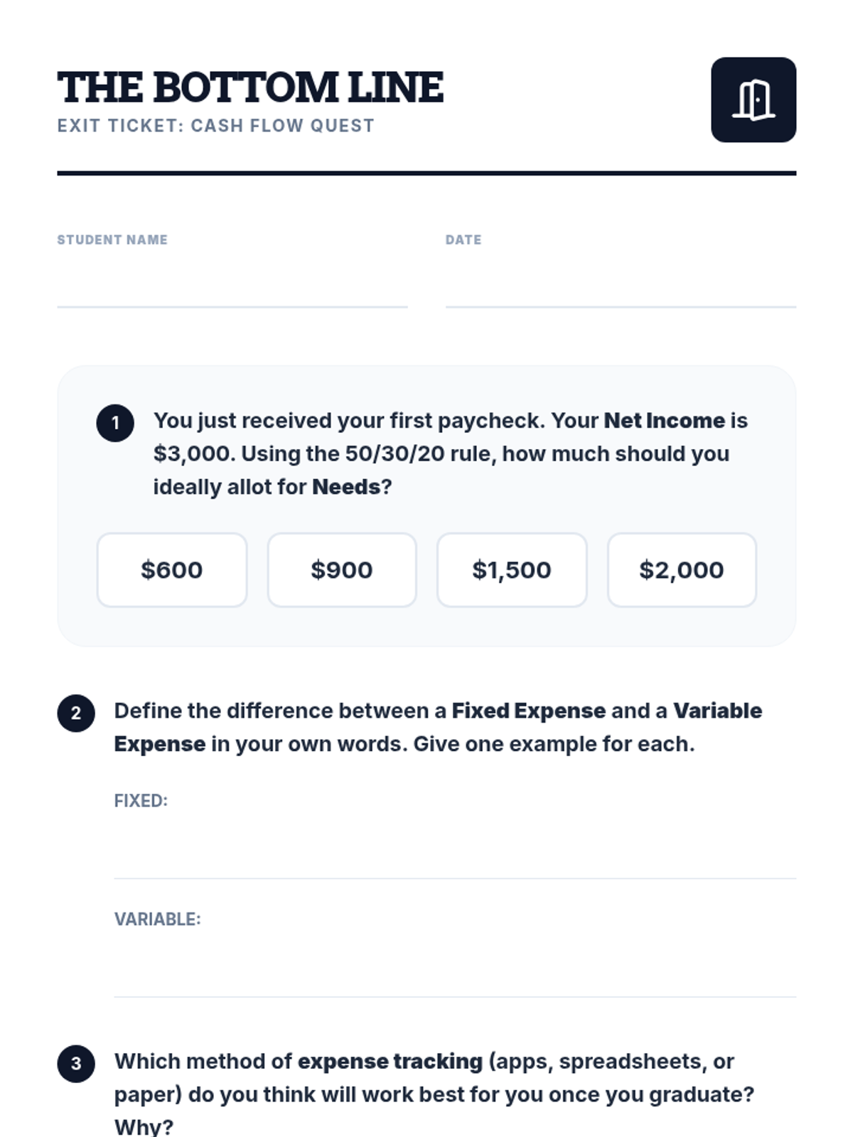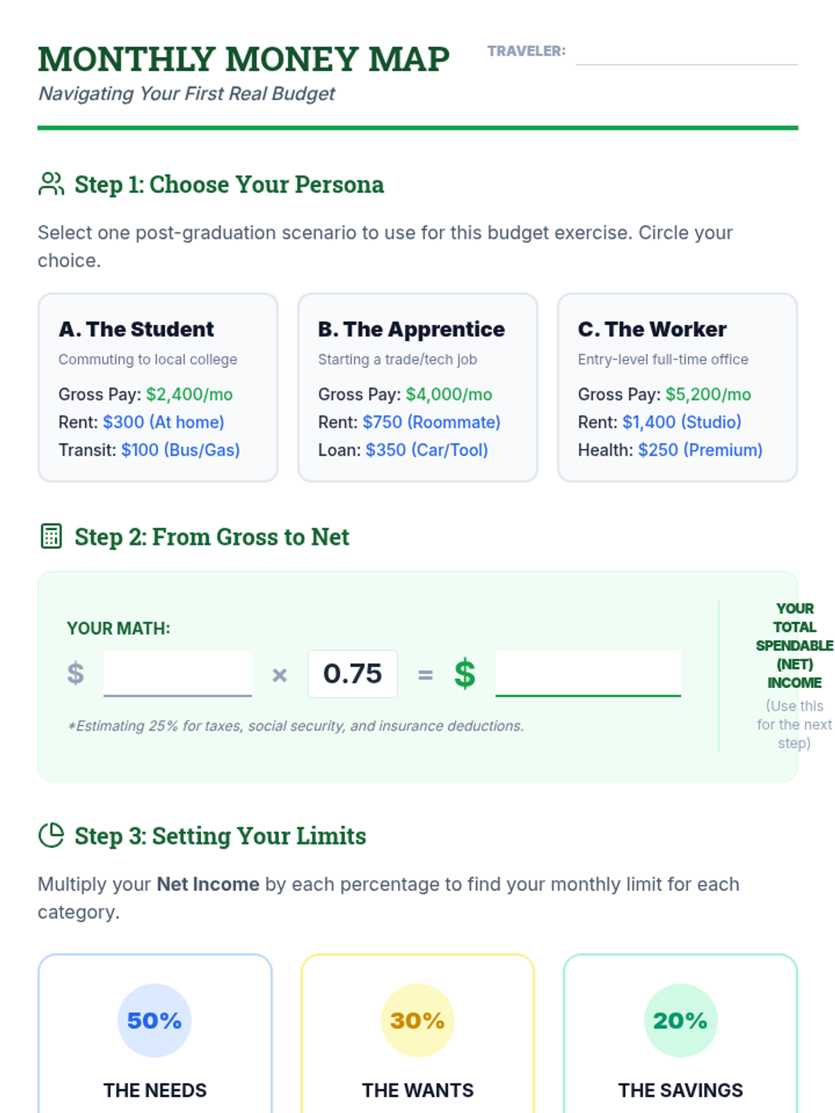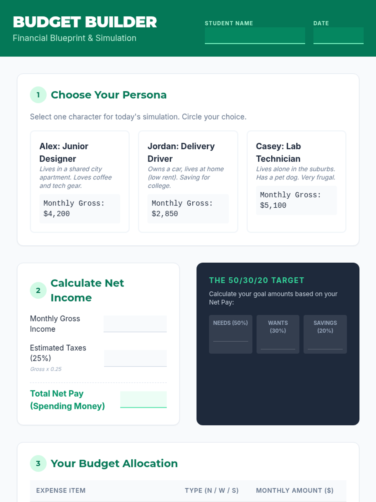 A comprehensive lesson designed to equip high school seniors with the practical skills needed to manage their finances after graduation. Students will learn the 50/30/20 rule, distinguish between fixed and variable expenses, and apply these concepts through a realistic simulation project.