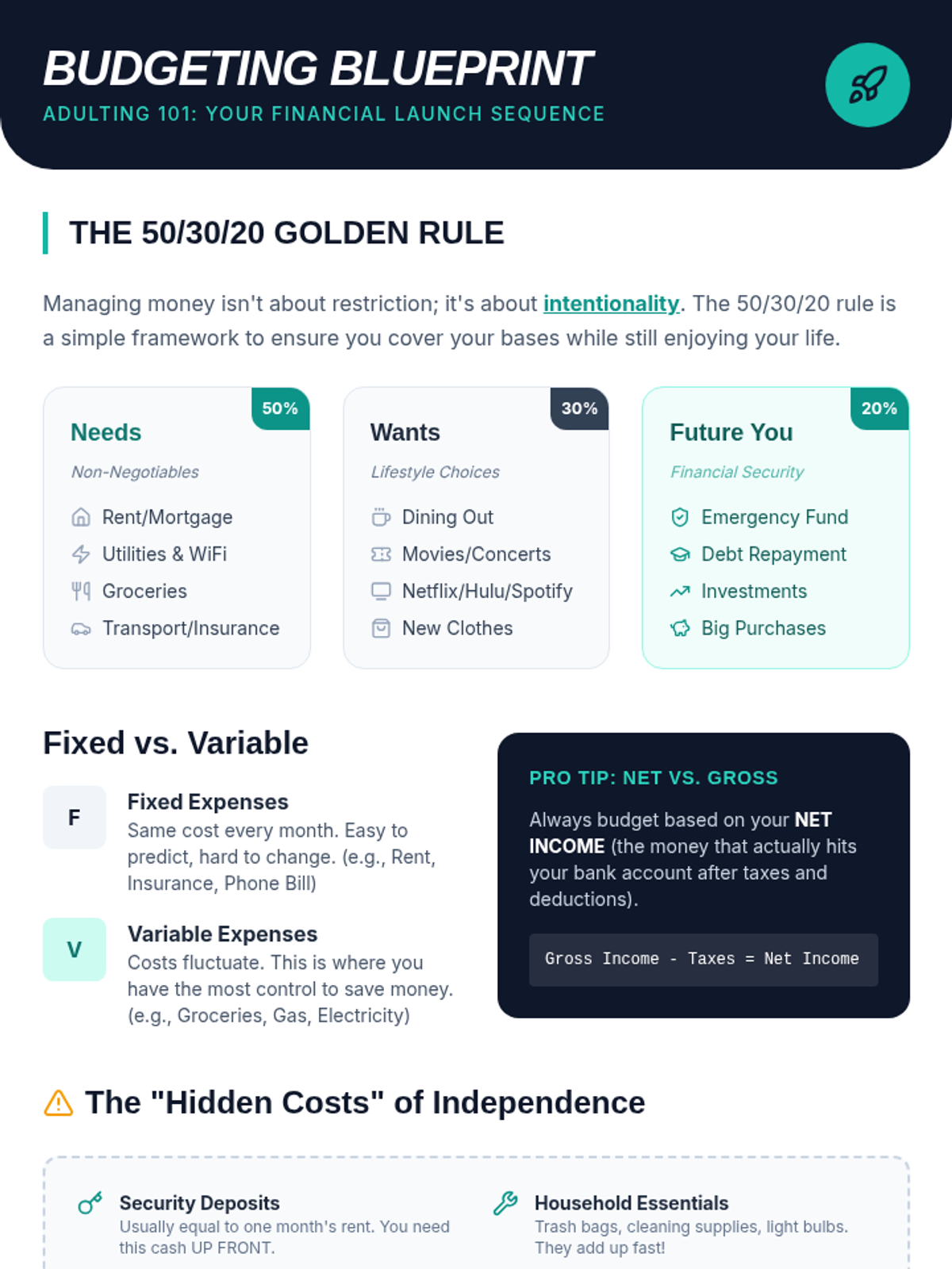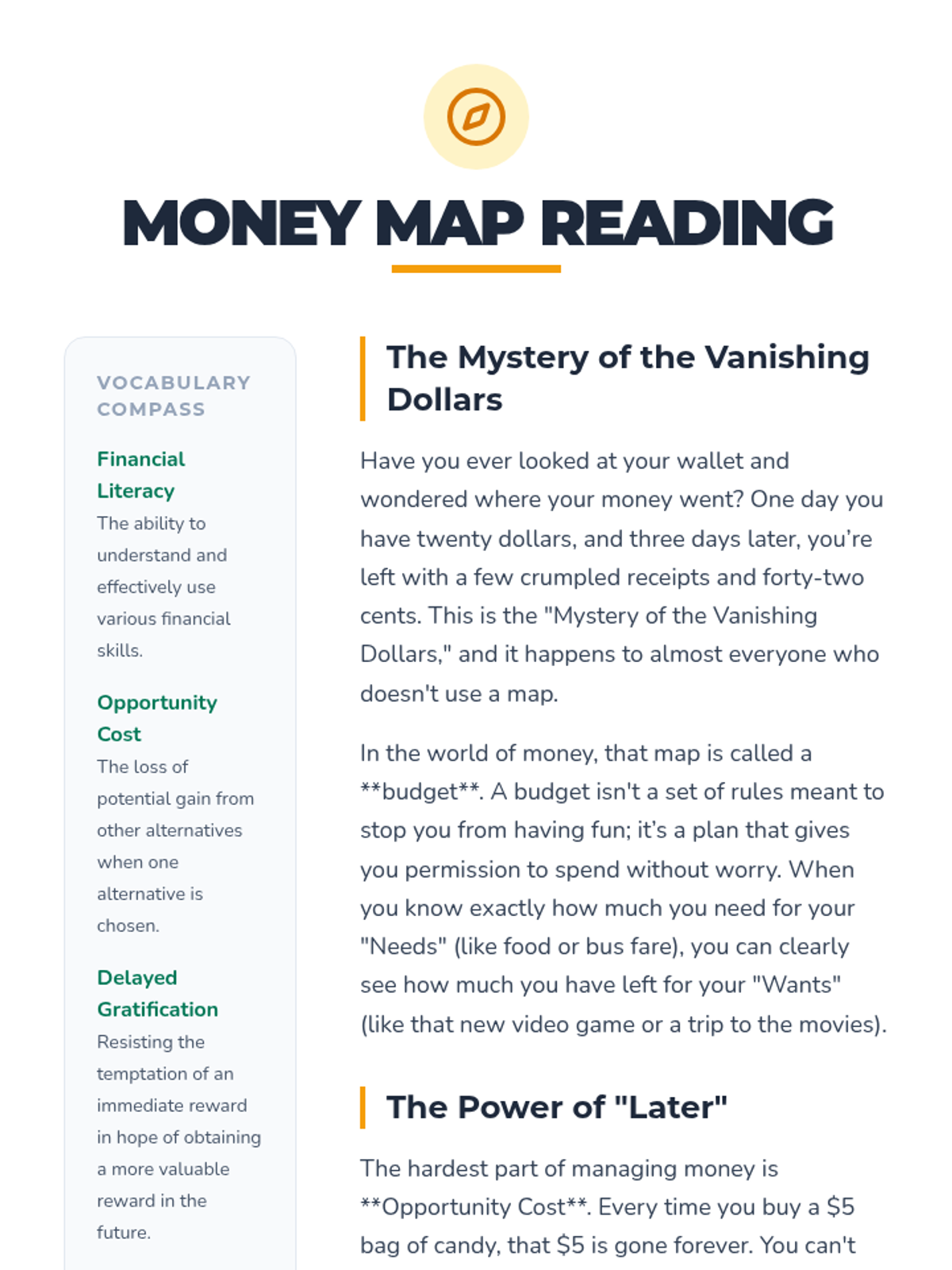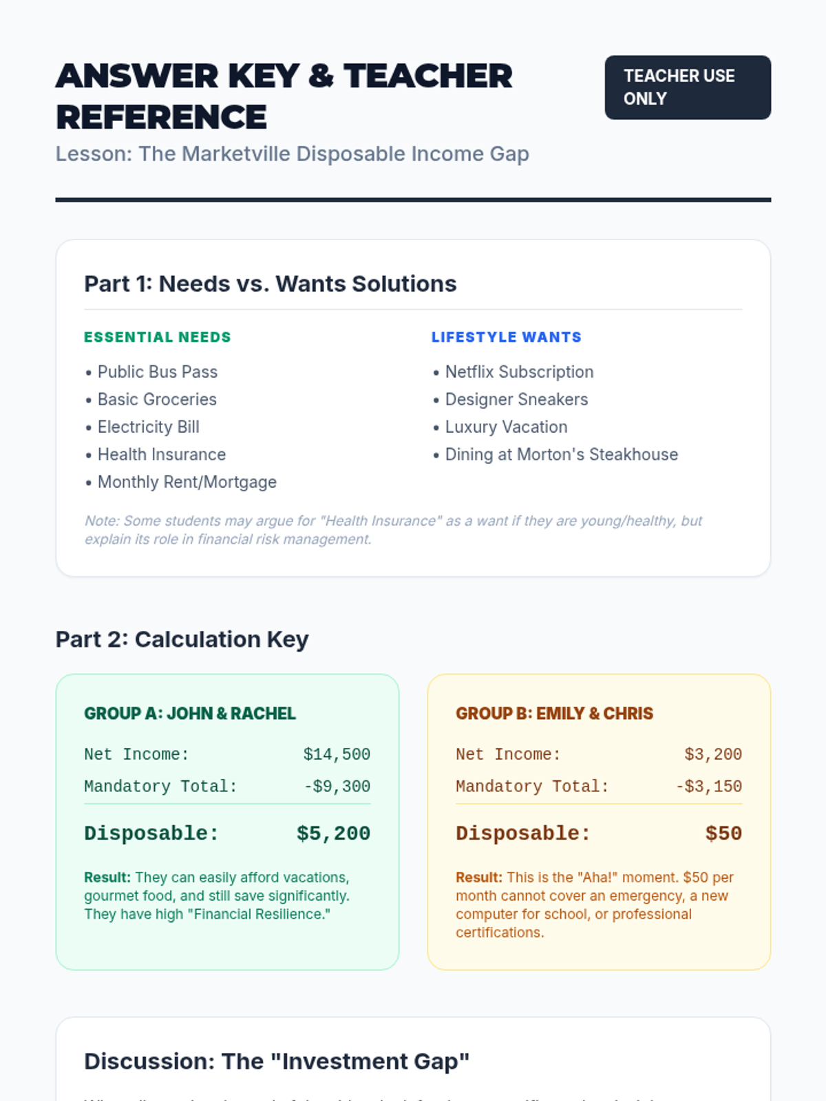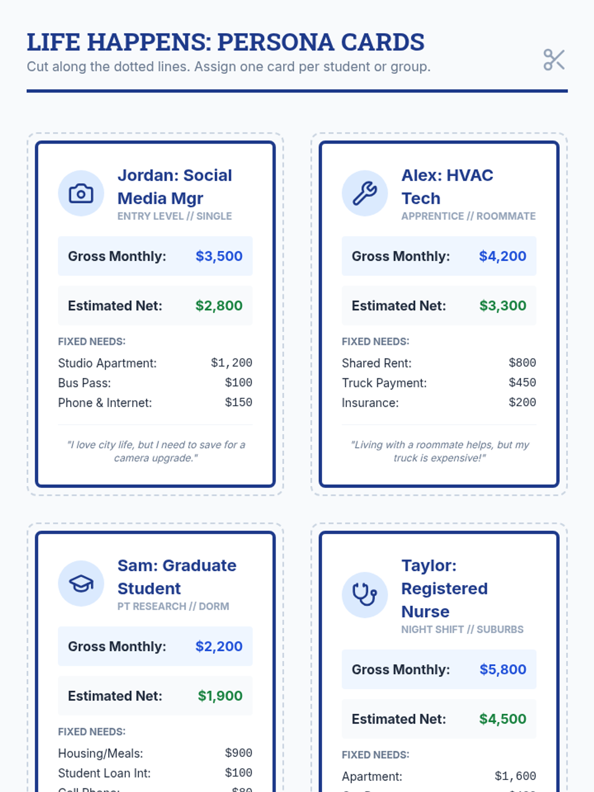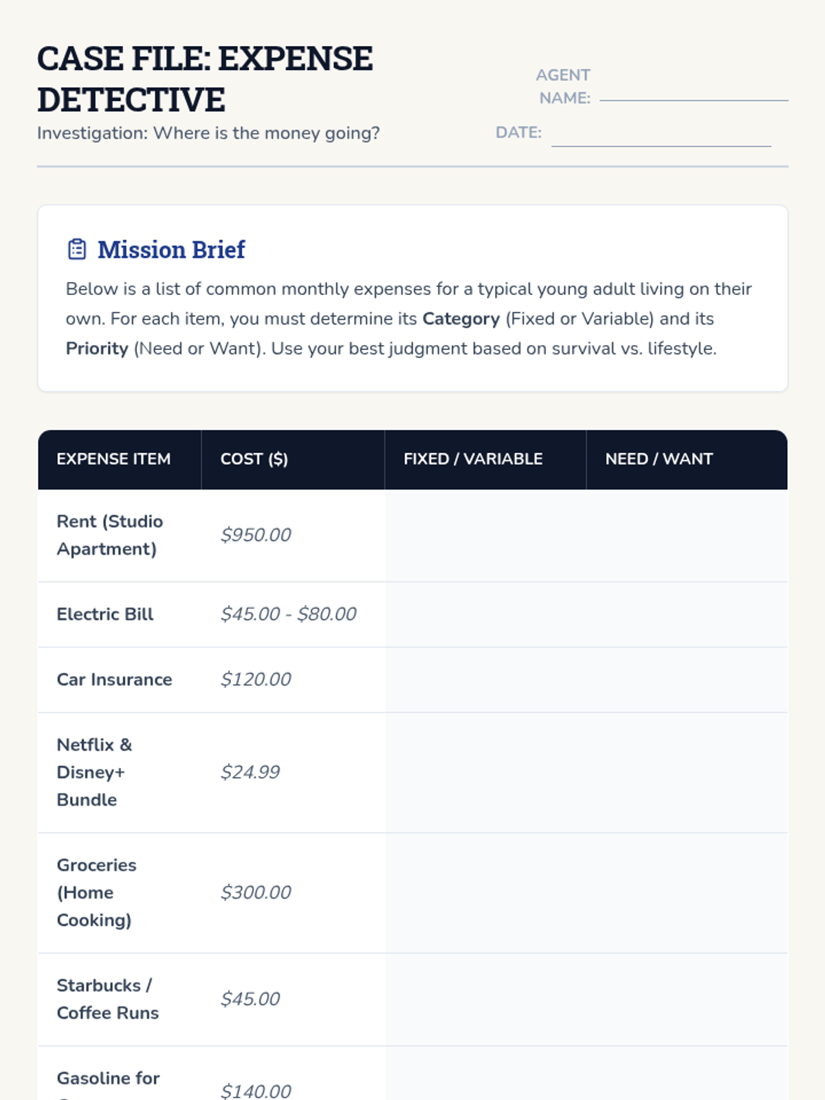A comprehensive lesson designed to equip high school seniors with the practical skills needed to manage their finances after graduation. Students will learn the 50/30/20 rule, distinguish between fixed and variable expenses, and apply these concepts through a realistic simulation project.
