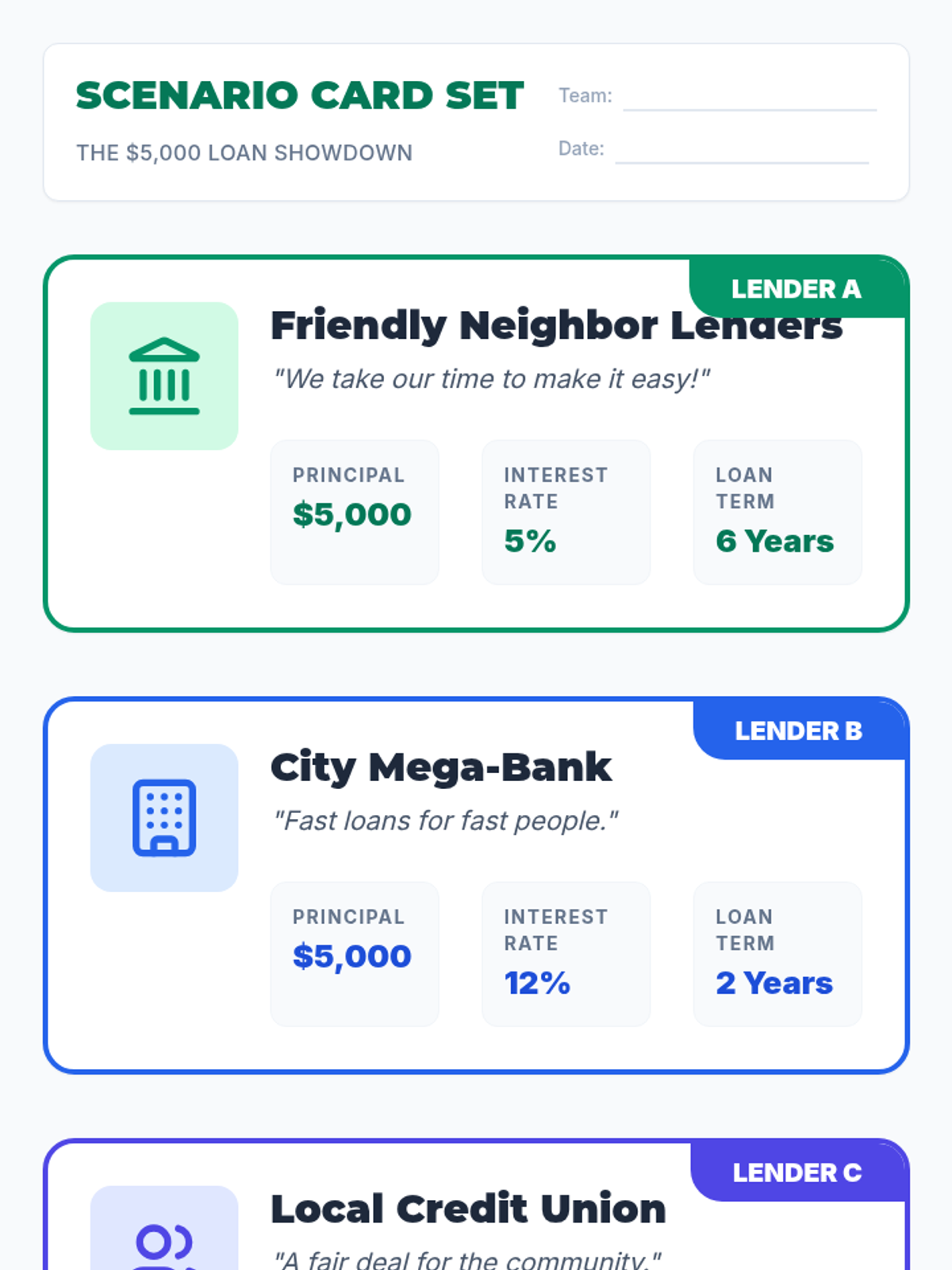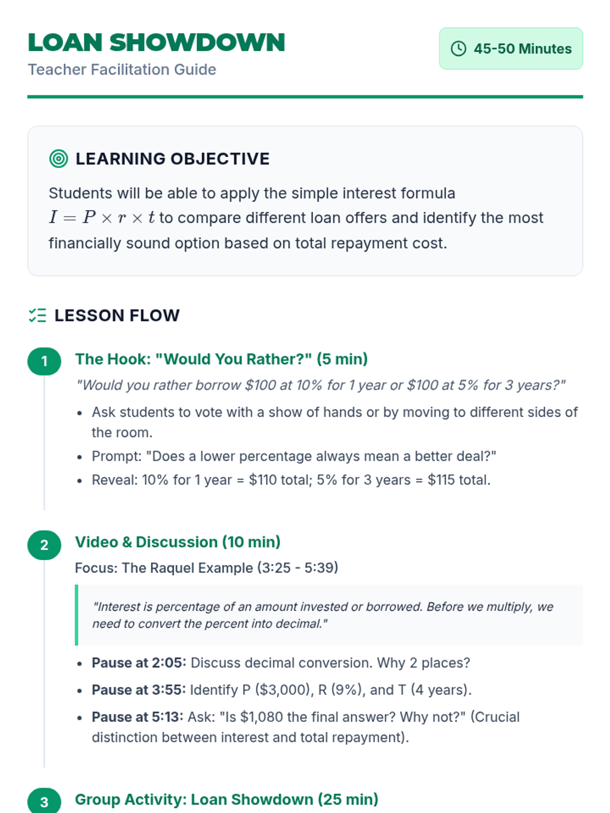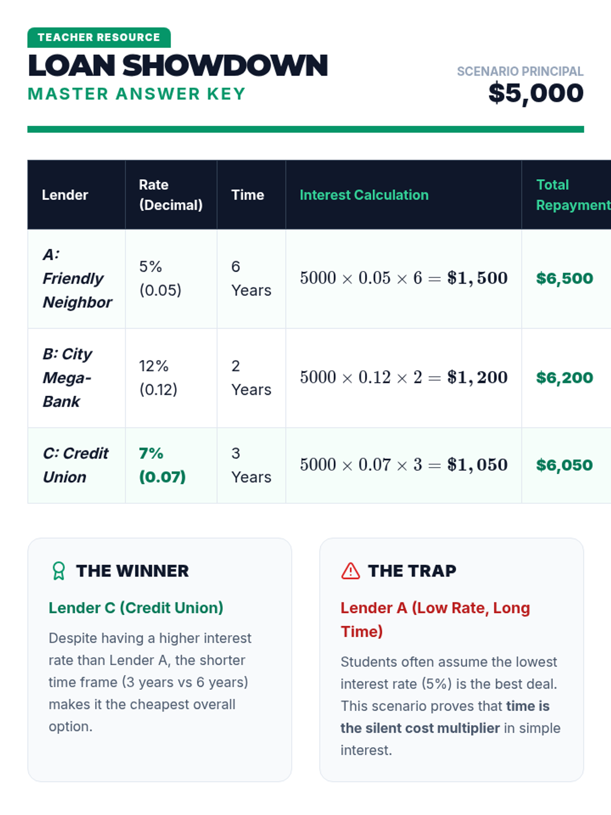 Students will learn to calculate and compare simple interest to determine the total cost of borrowing. This lesson uses a real-world scenario where students must evaluate three different loan offers for a $5,000 purchase.