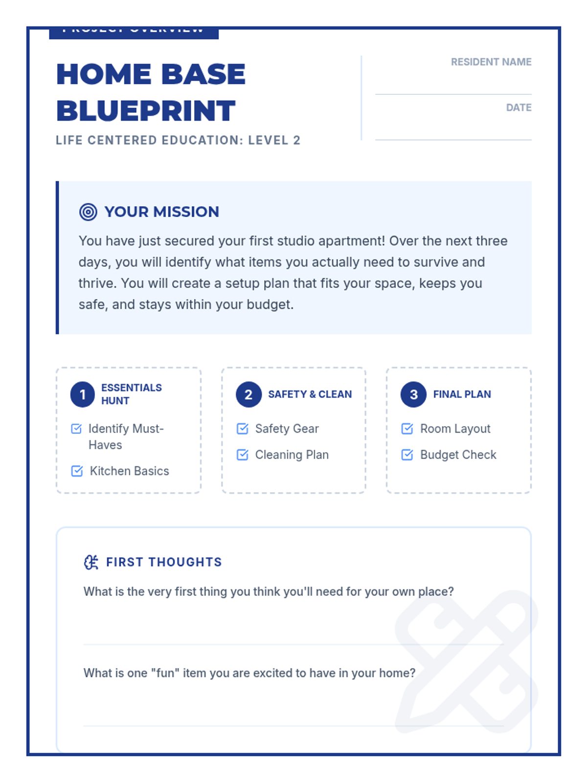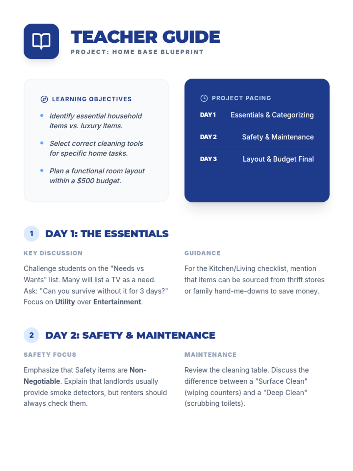 A 3-day guided project where students identify, categorize, and plan for essential household items within a specific living space and budget, focusing on practical life skills and safety.