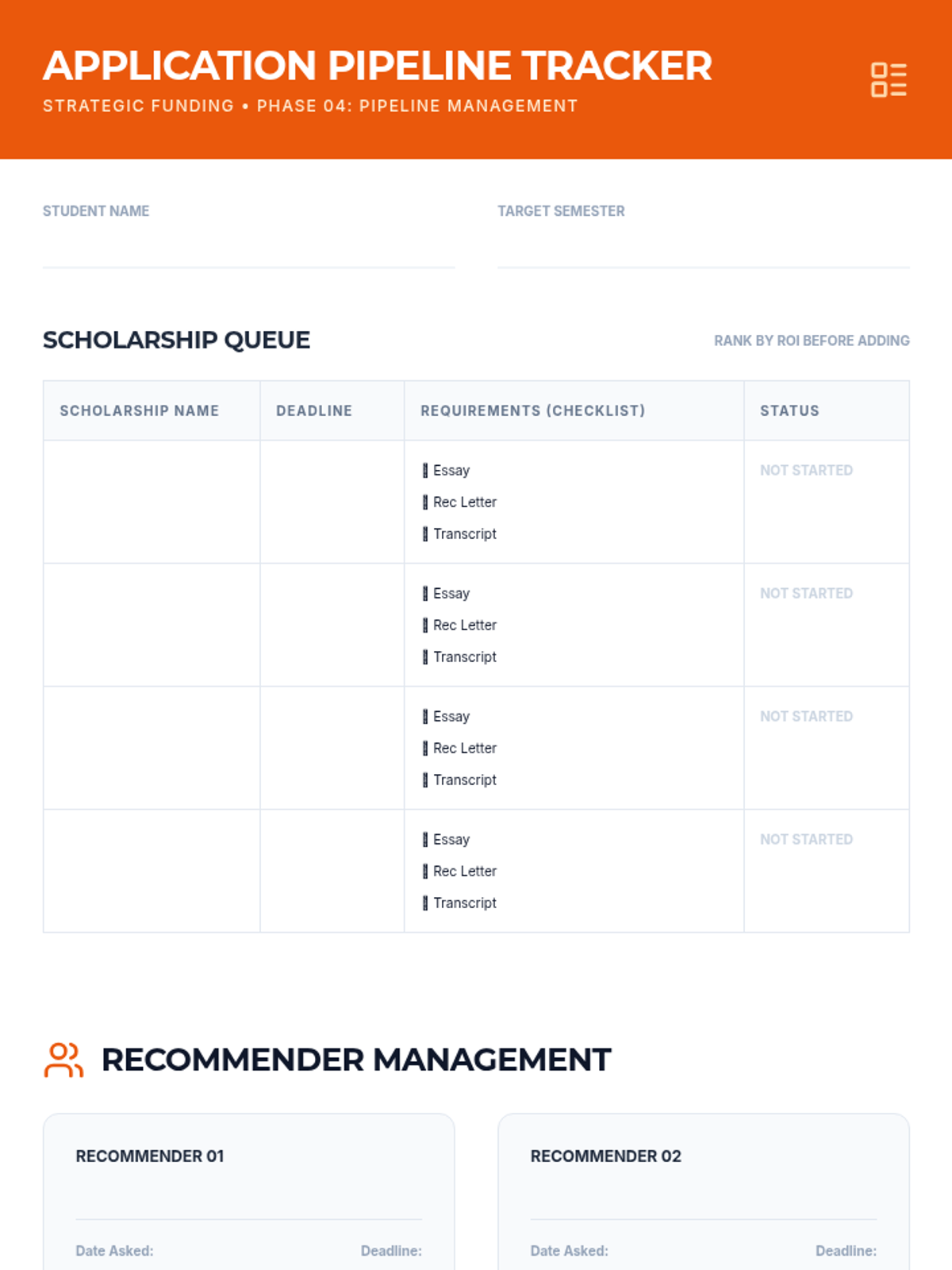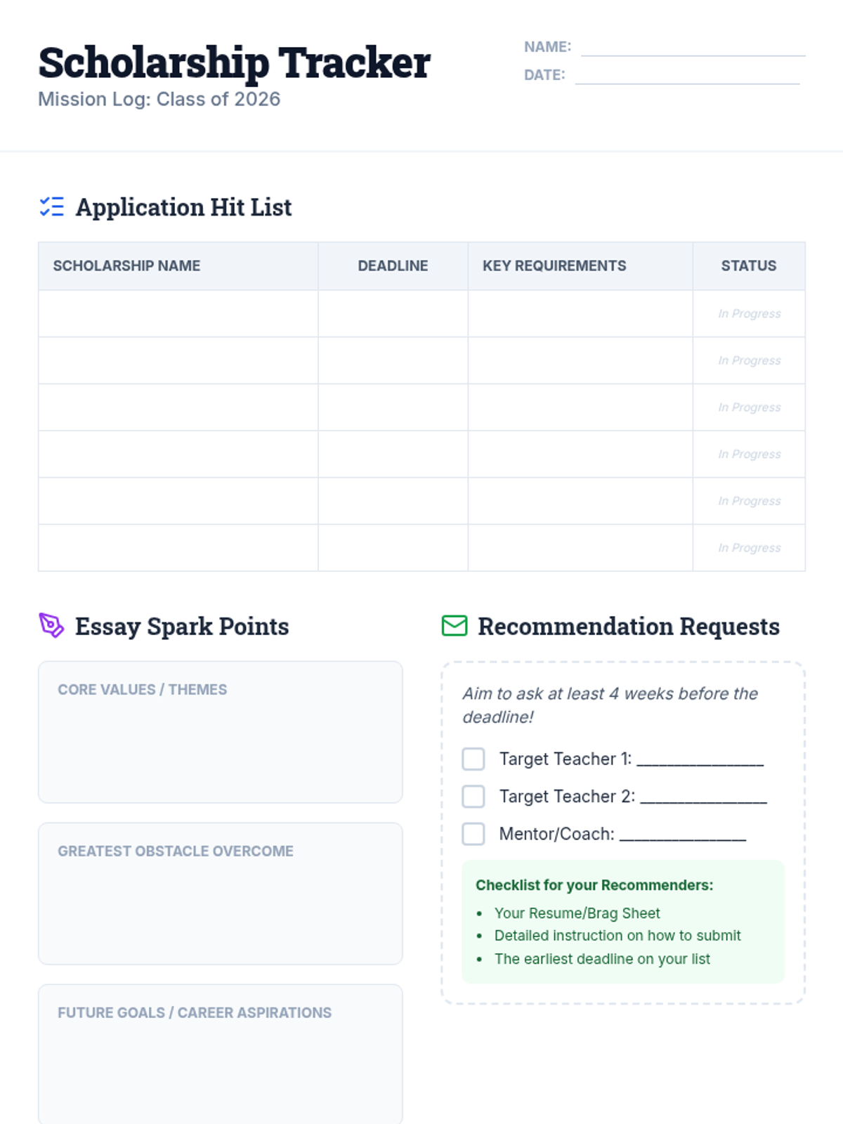 Students build a personalized organization system to track scholarship deadlines, requirements, and application statuses.