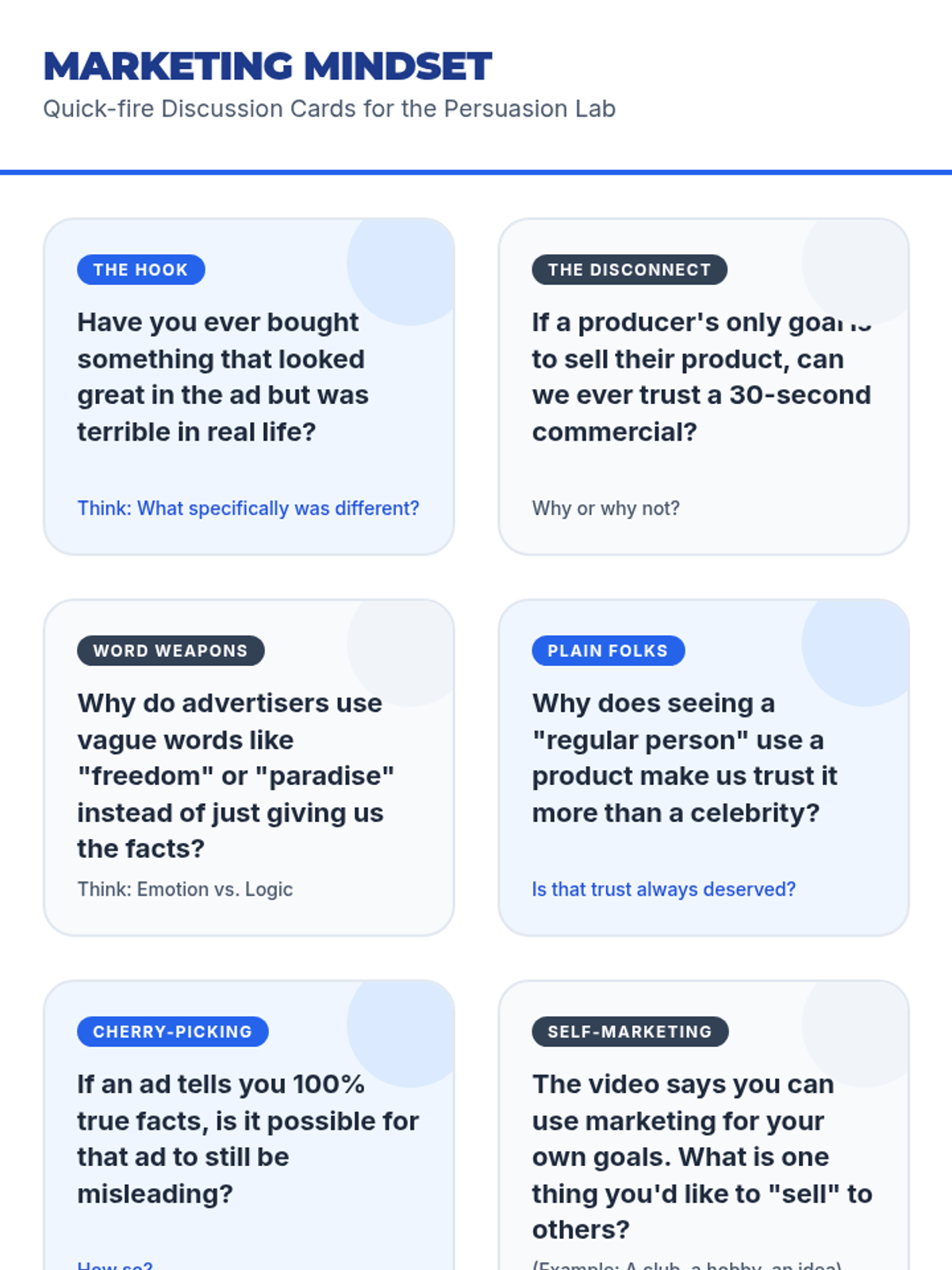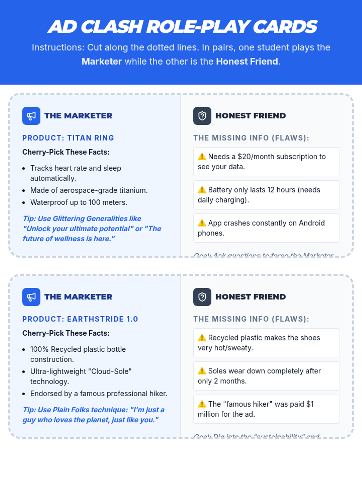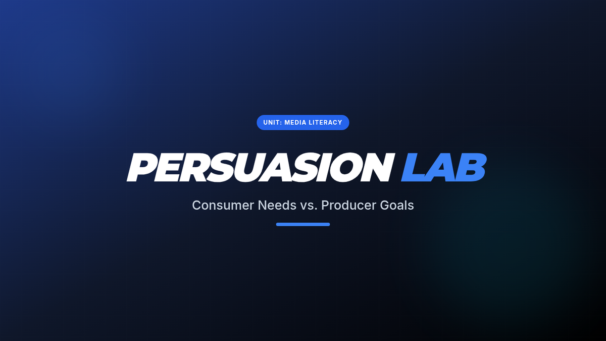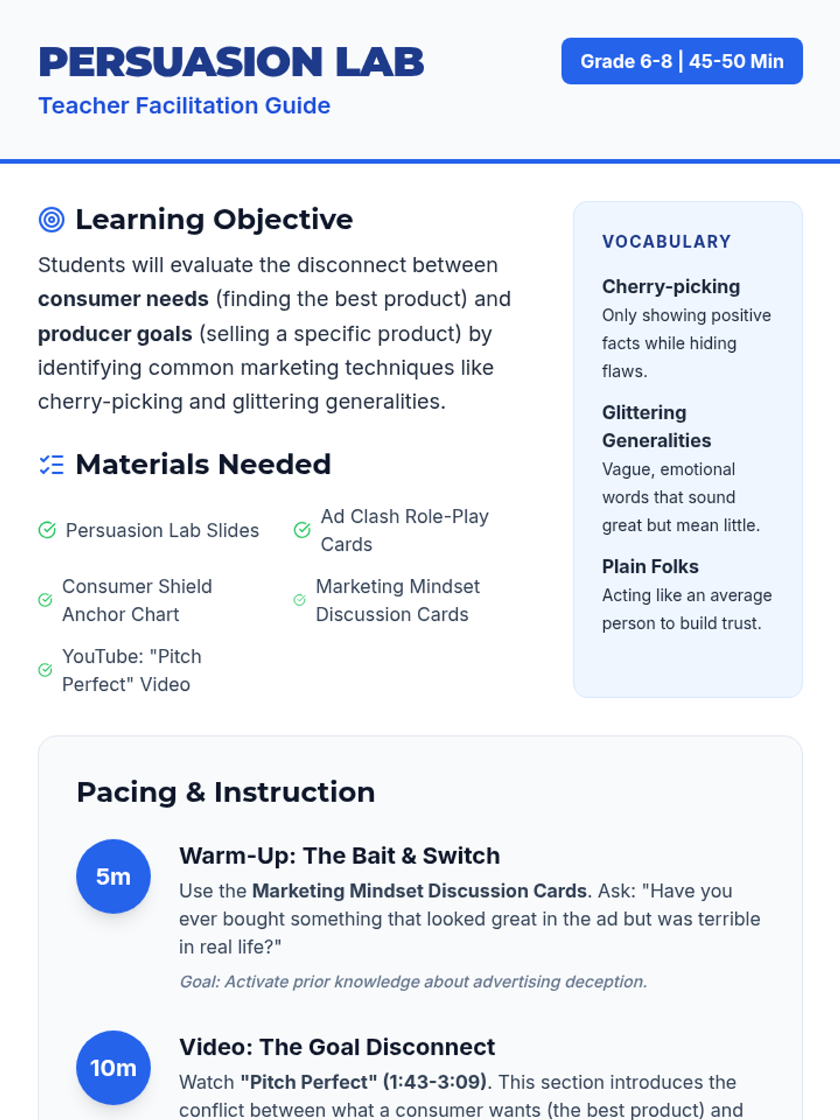 A middle school lesson focused on analyzing the disconnect between consumer needs and producer goals using the 'Pitch Perfect' video. Students engage in a role-play activity to identify marketing techniques like cherry-picking and glittering generalities.