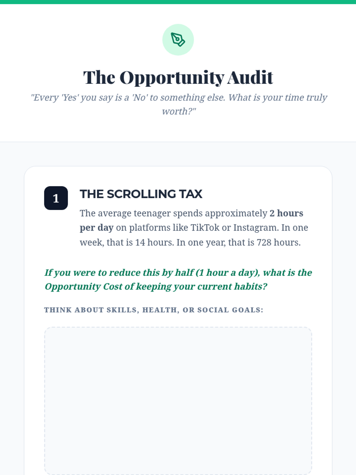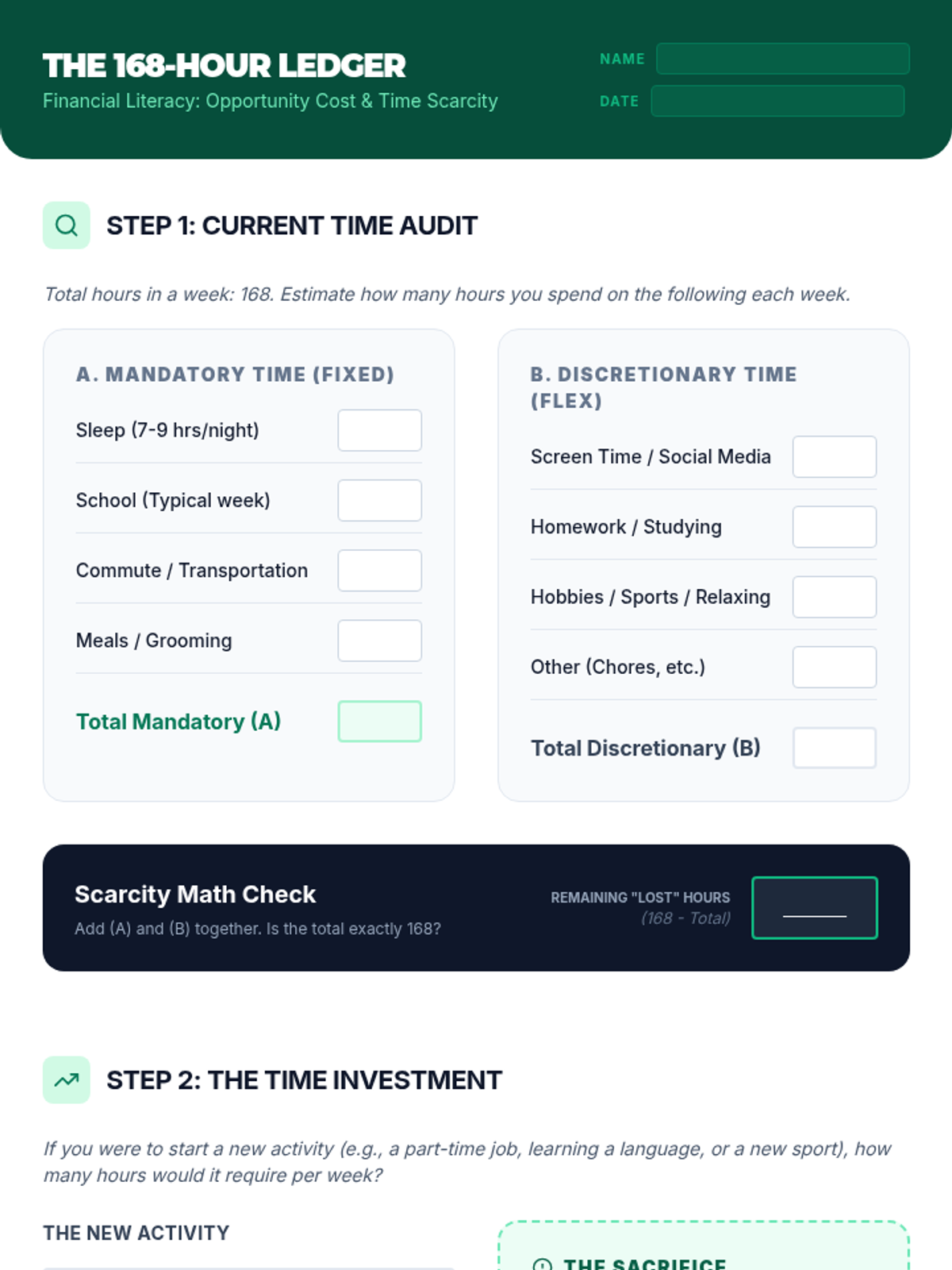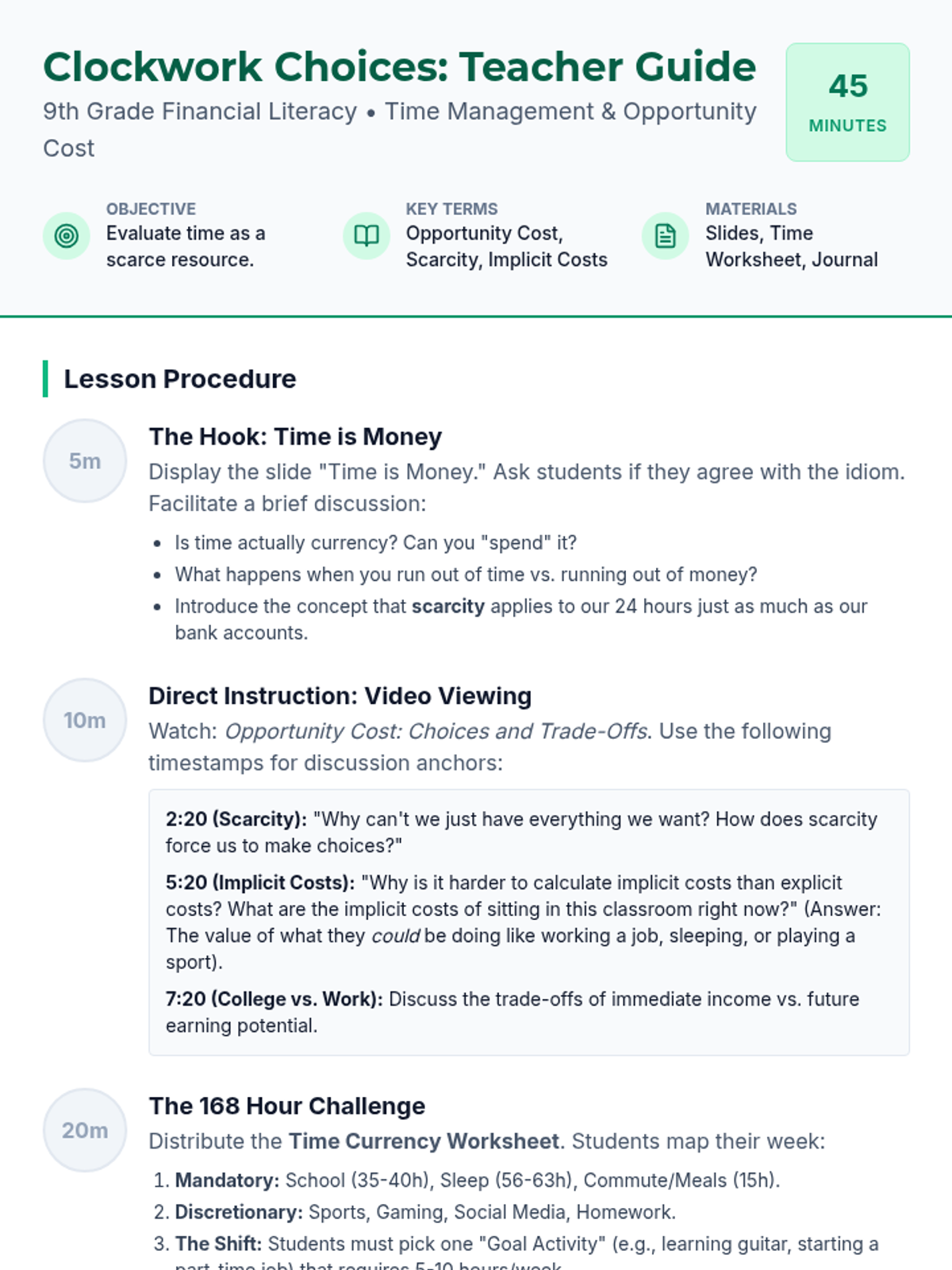 A lesson where students apply the economic concept of opportunity cost to their personal time management, mapping out a 168-hour week to evaluate trade-offs.