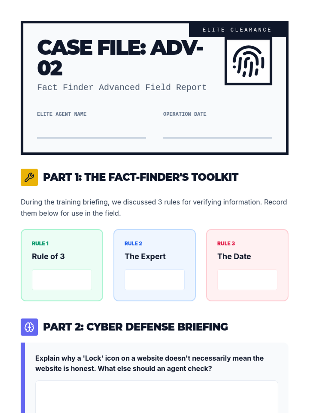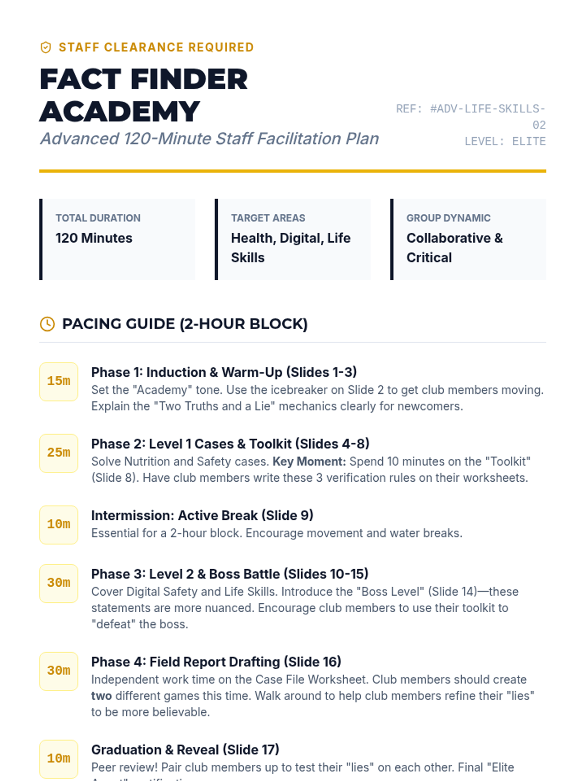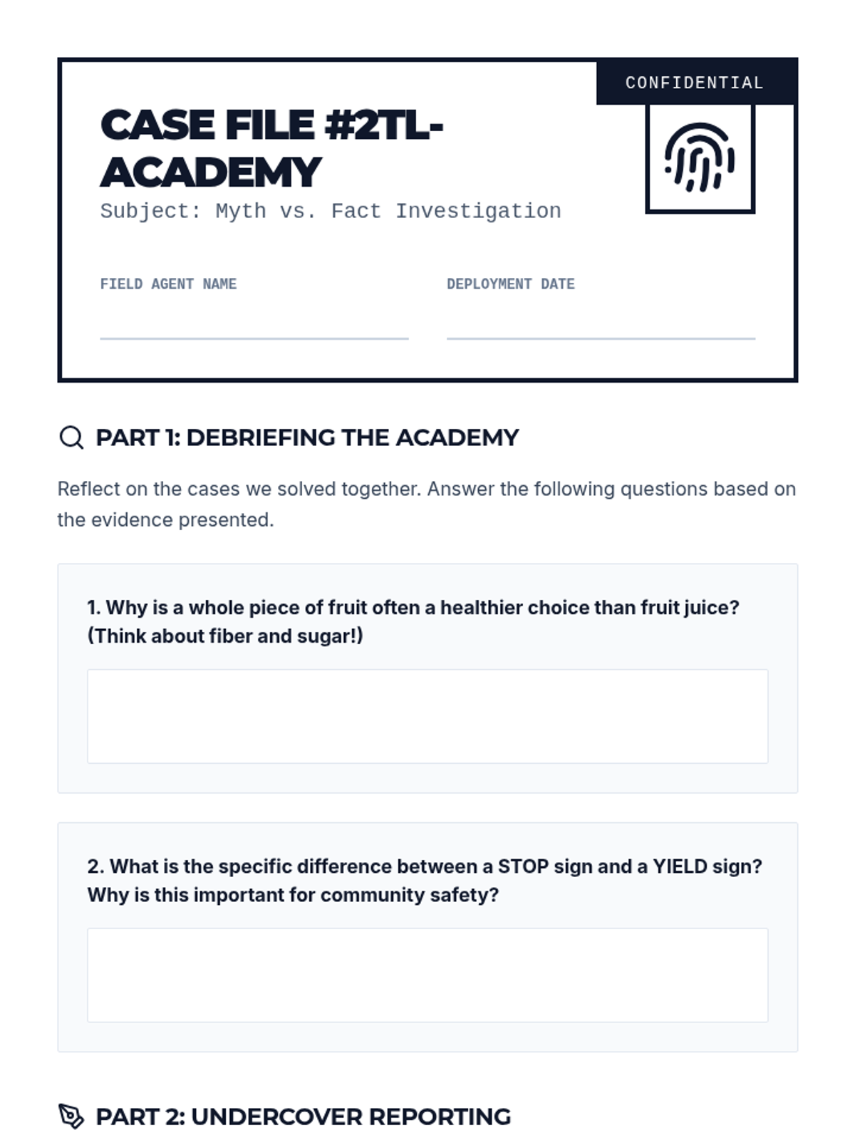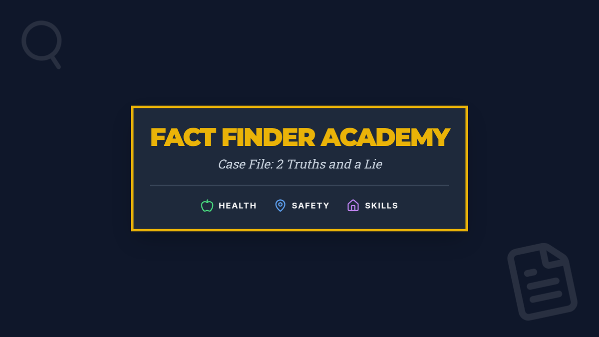 A fun, interactive game-based lesson where club members learn about healthy eating, community safety, and daily living skills by playing Two Truths and a Lie. Club members will act as 'Fact Finders' to identify myths and facts in these key life areas.