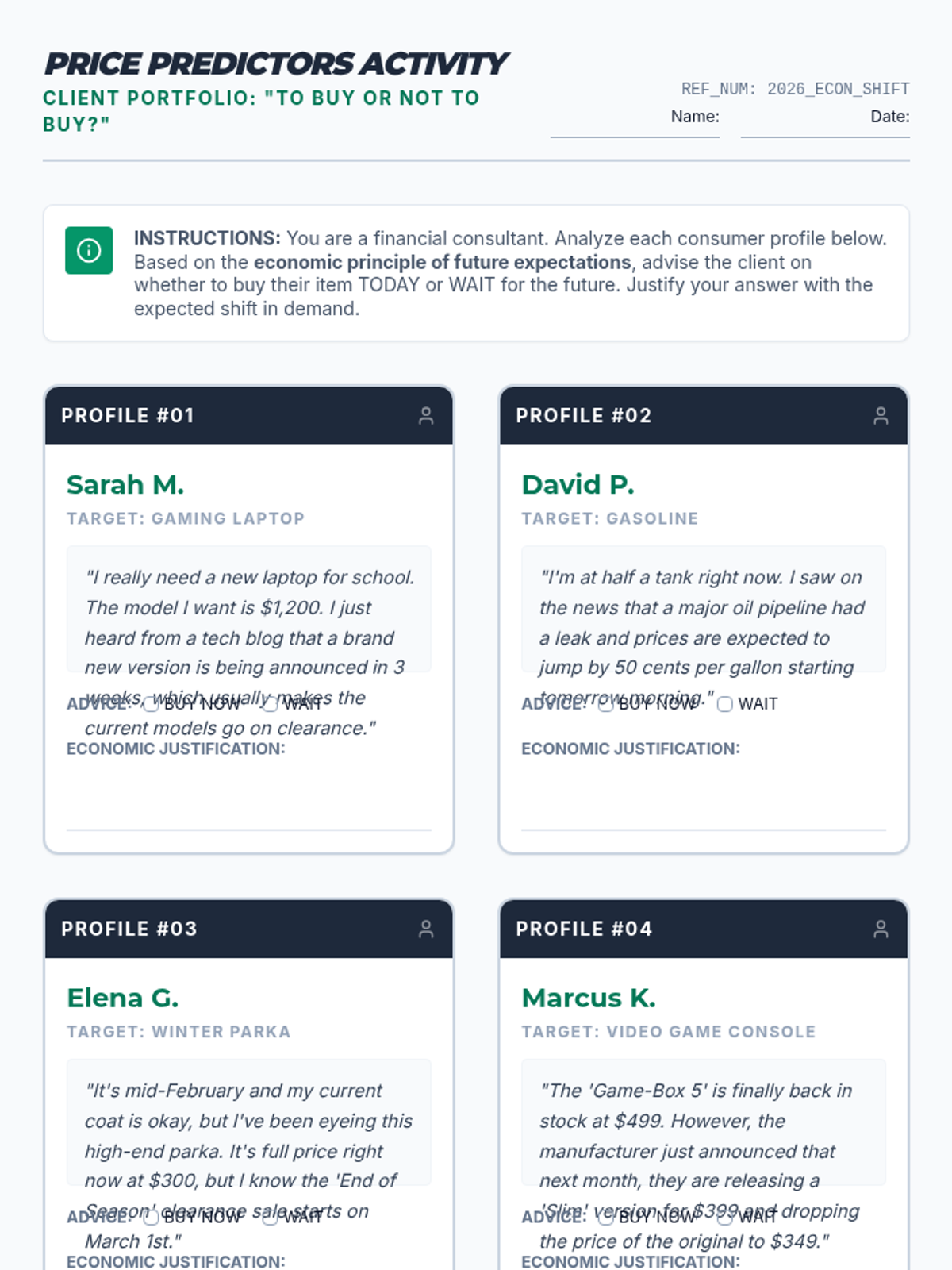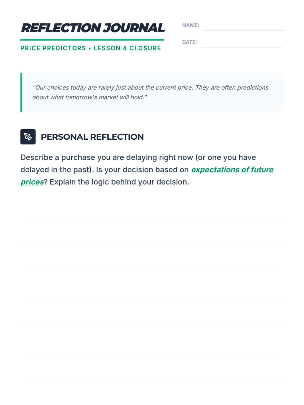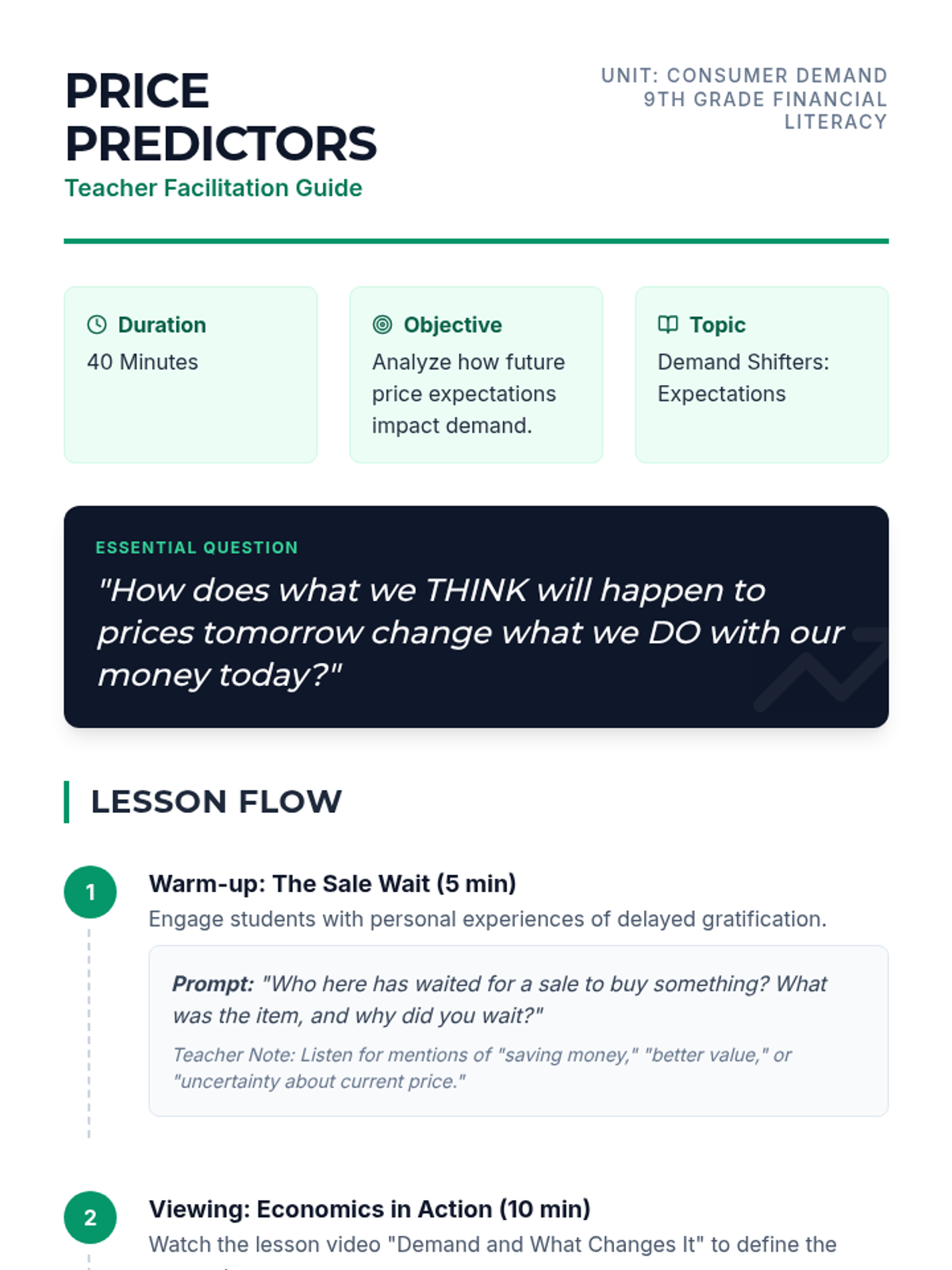 A 9th-grade financial literacy lesson exploring how consumer expectations of future prices influence current demand and personal spending habits.